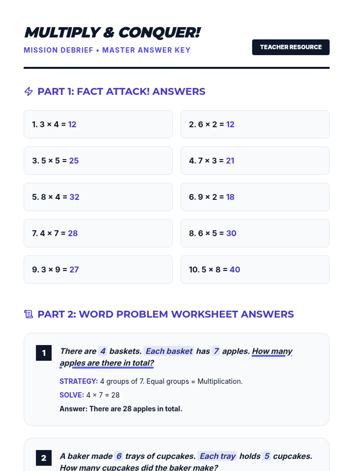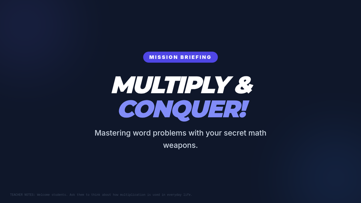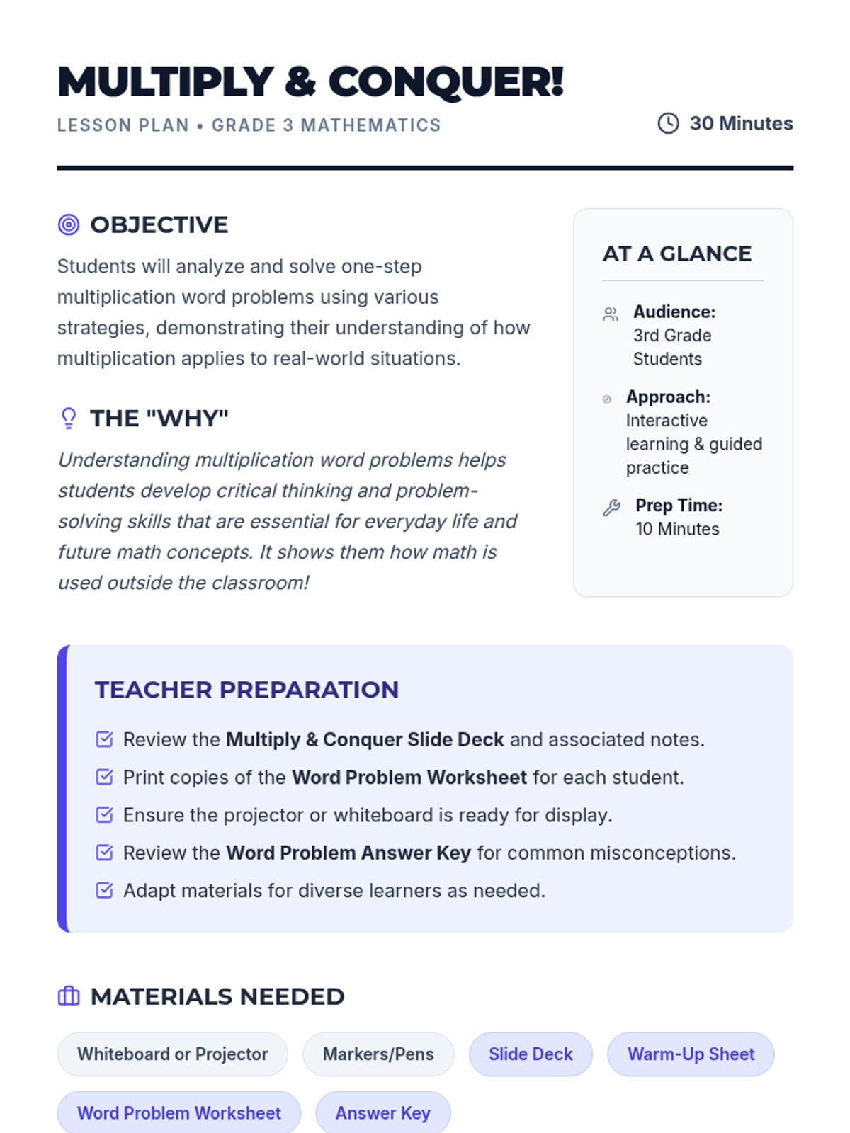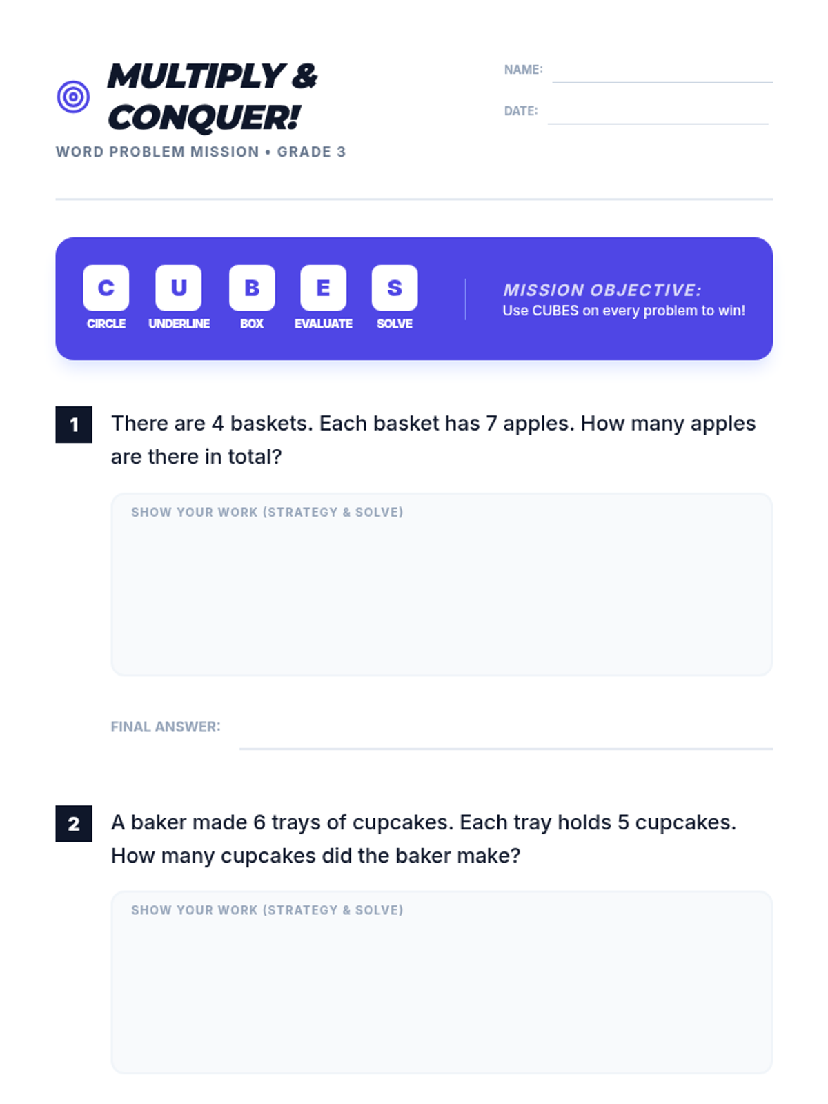 A 30-minute 3rd-grade math lesson that introduces the CUBES strategy to help students solve multiplication word problems through interactive examples and guided practice.