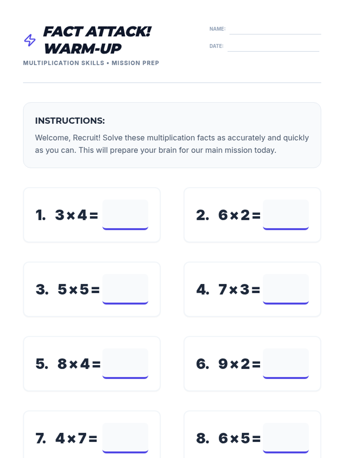 A comprehensive math review lesson designed to reinforce key elementary math skills including logical ordering, 2-digit subtraction, geometric attributes, and equal parts/fractions. This lesson uses a repeated "at-bat" structure to build mastery through multiple variations of the same problem format.