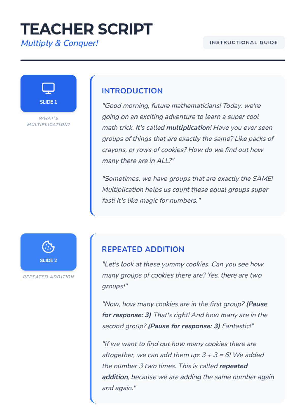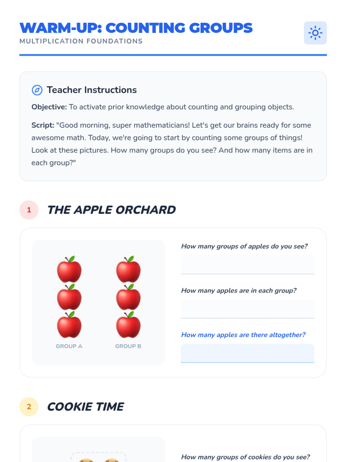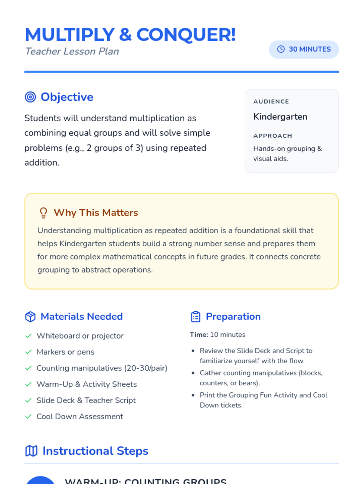 This engaging 30-minute lesson introduces Kindergarten students to the foundational concept of multiplication as repeated addition. Students will explore equal groups through visual examples and hands-on manipulation of objects.