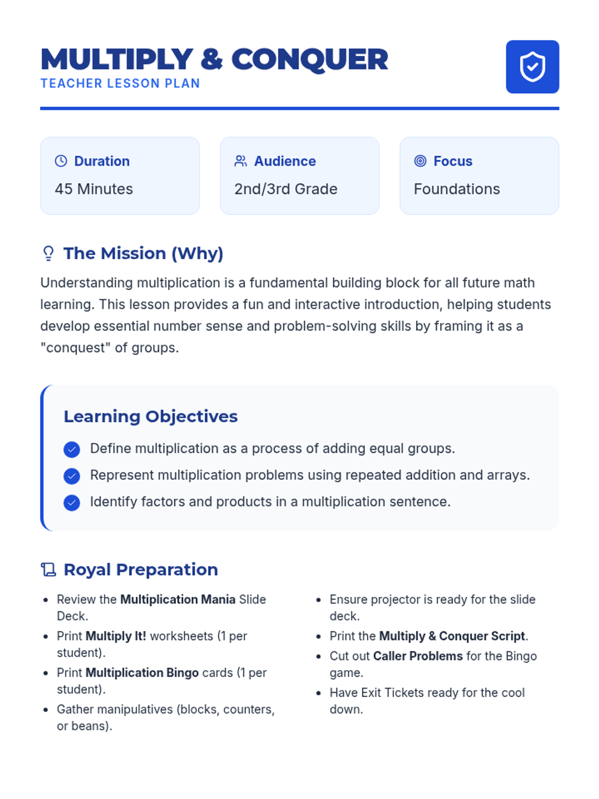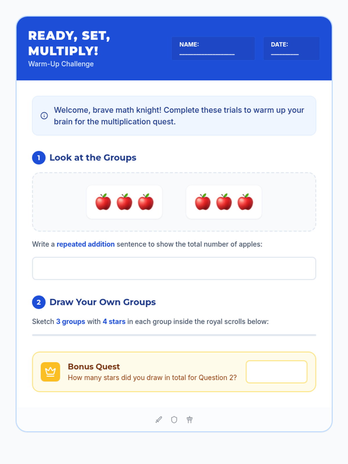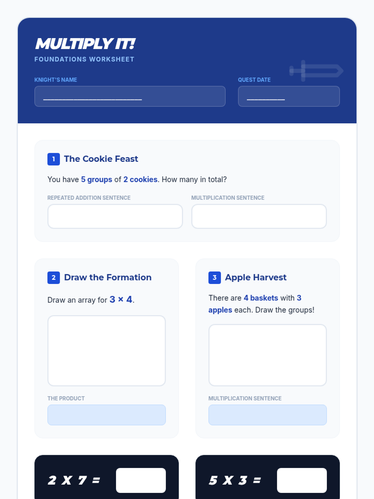 A foundational multiplication lesson for 2nd and 3rd graders, introducing repeated addition, equal groups, and arrays through a "Knights and Castles" themed adventure.