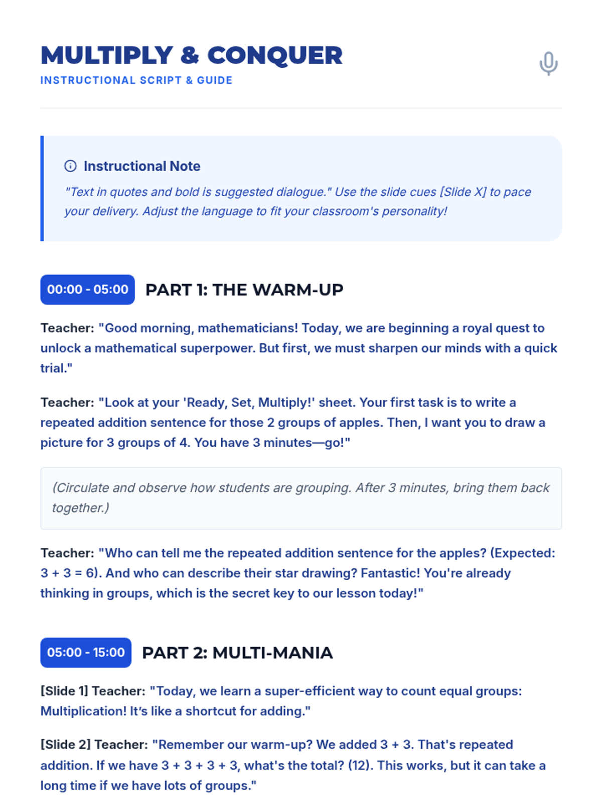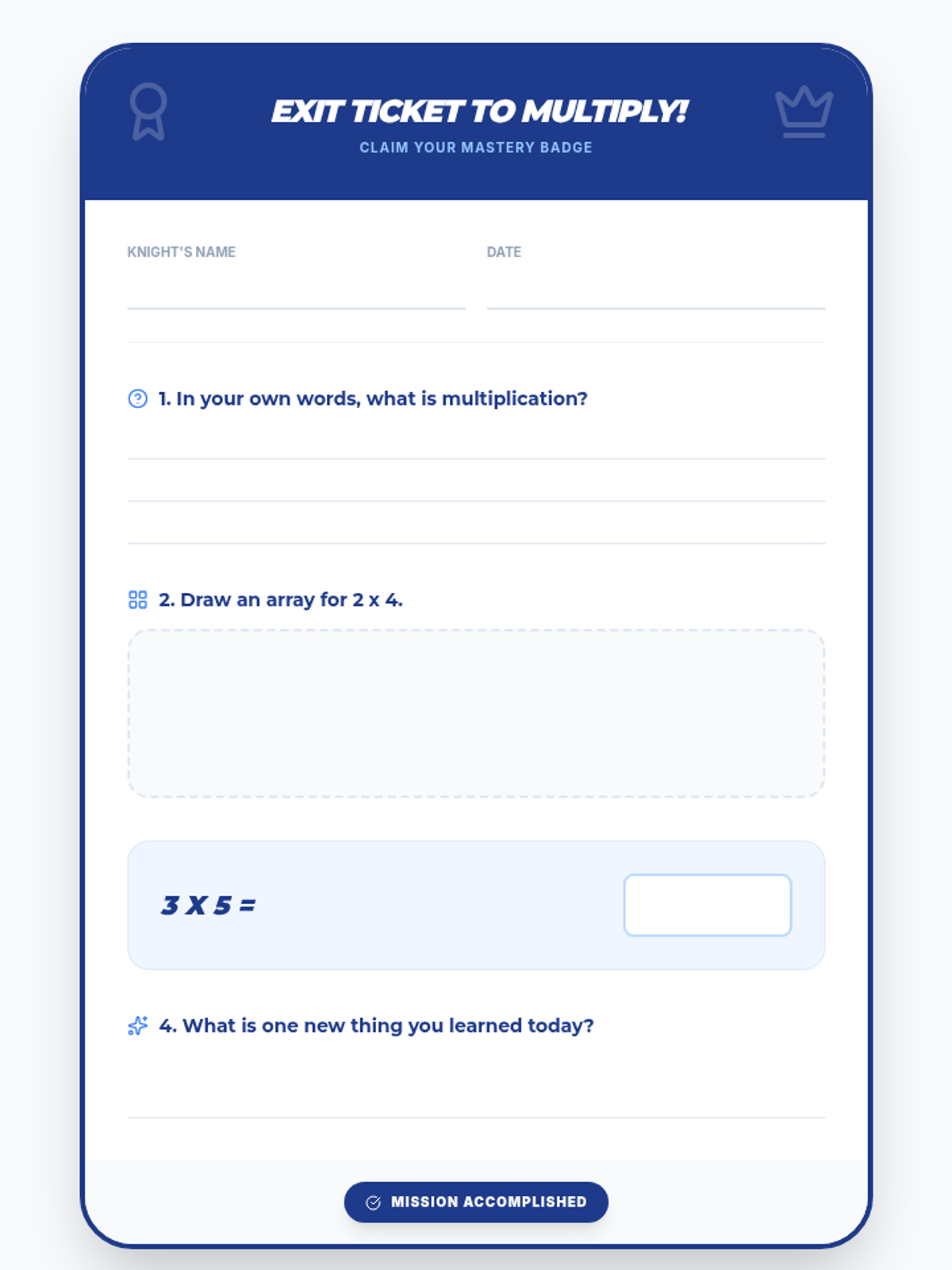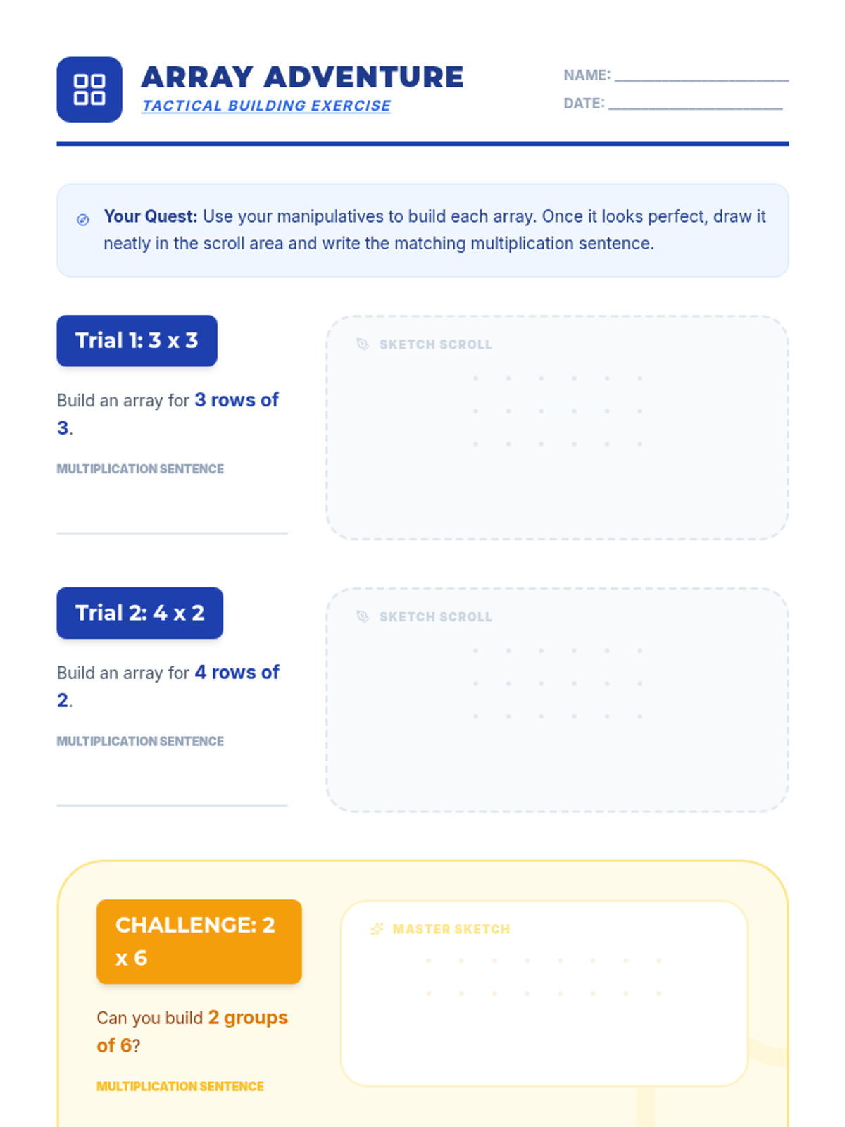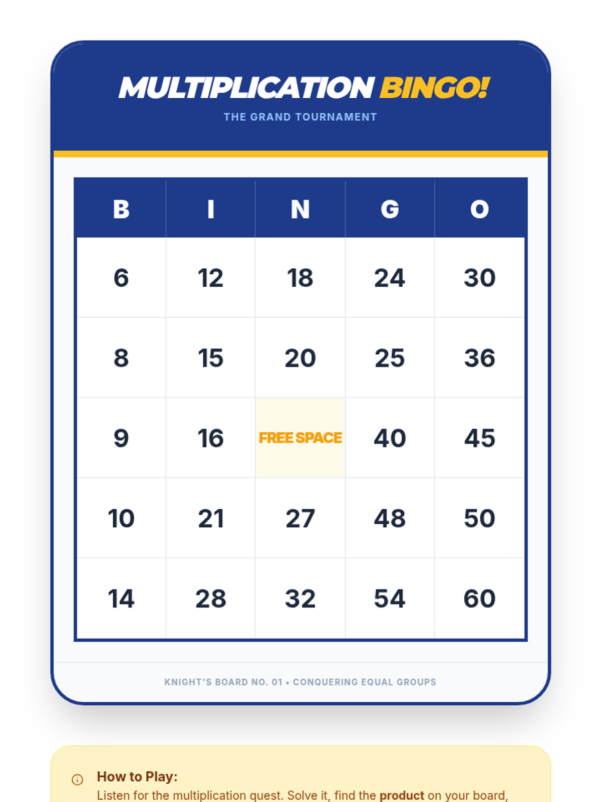 A foundational multiplication lesson for 2nd and 3rd graders, introducing repeated addition, equal groups, and arrays through a "Knights and Castles" themed adventure.