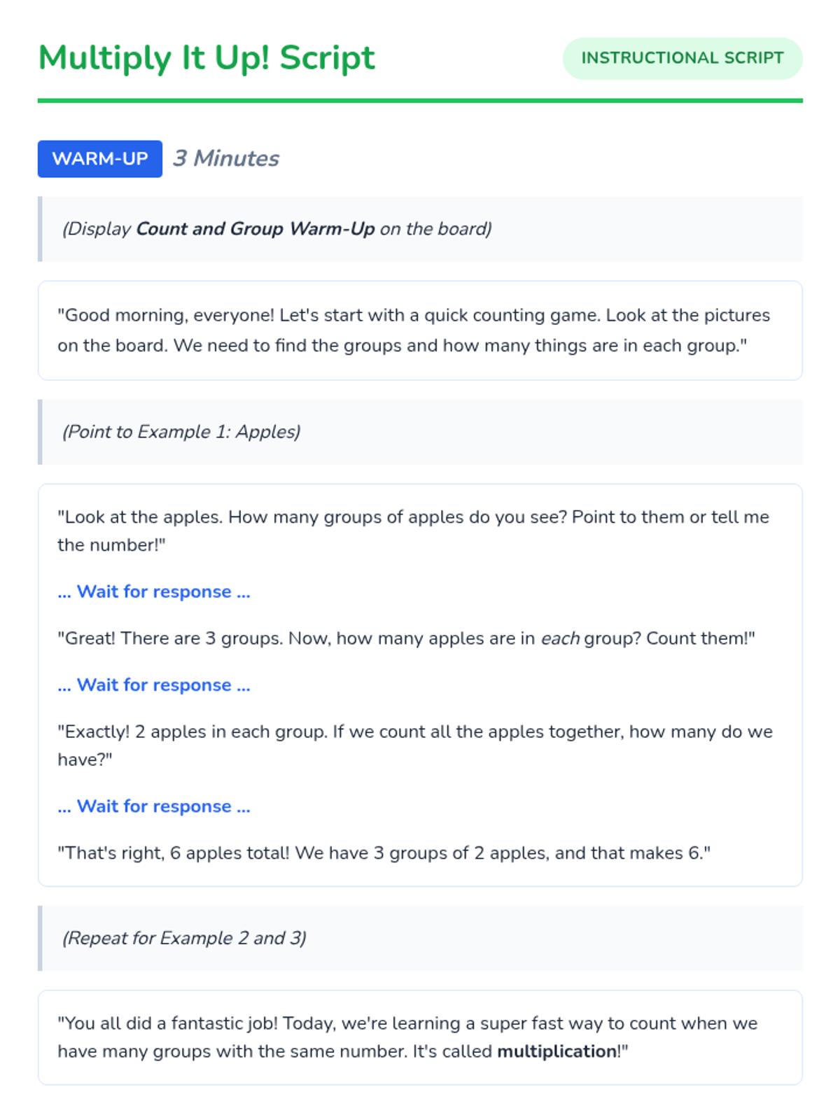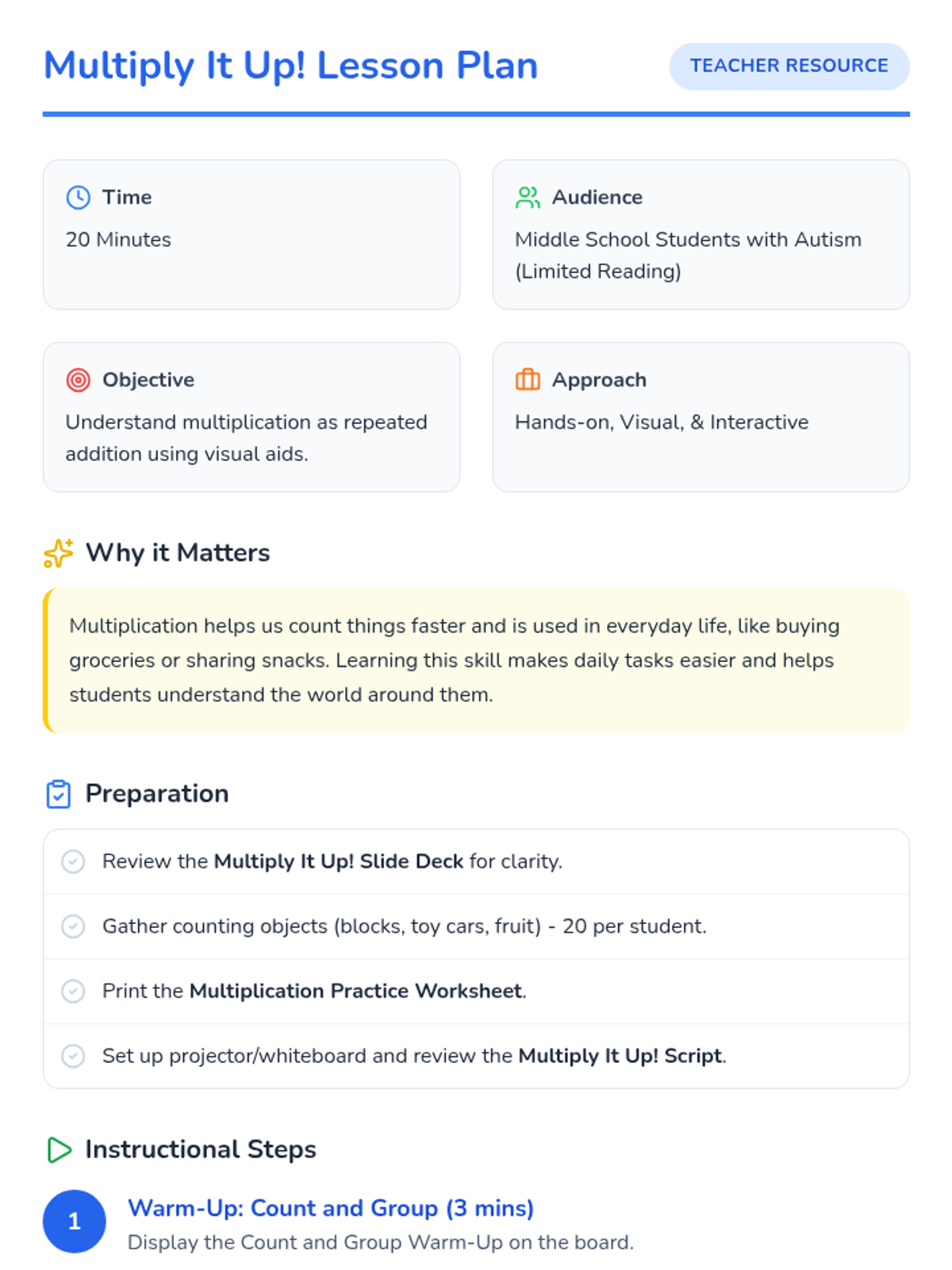 A 20-minute introductory lesson on multiplication for students with autism, focusing on visual grouping and repeated addition.