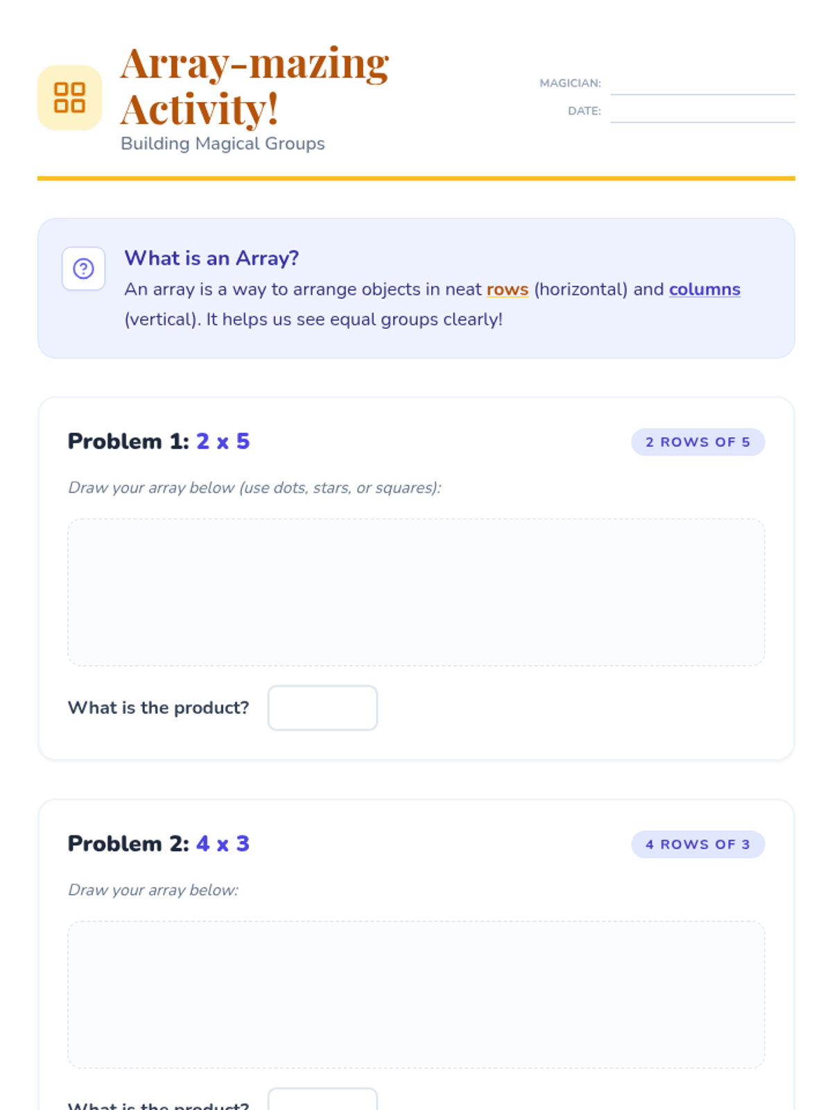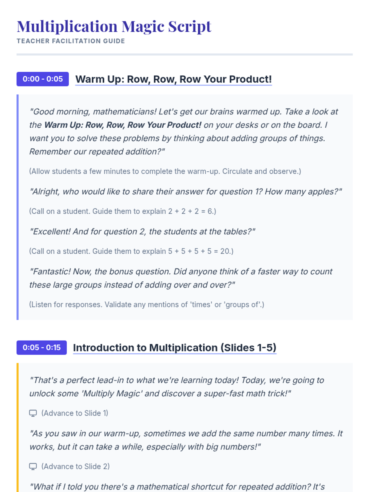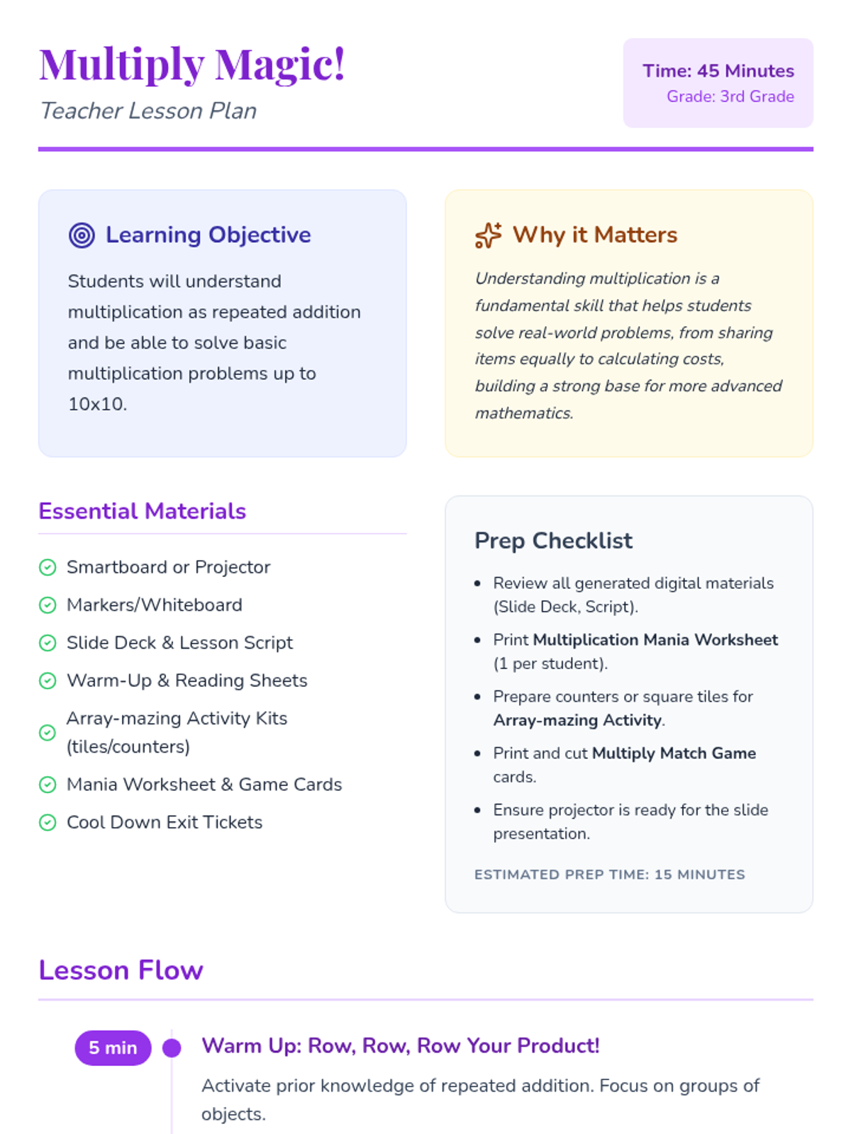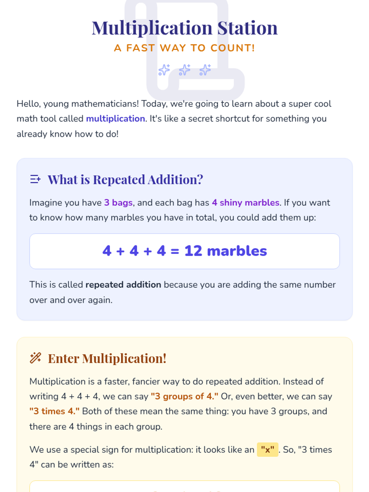 An introductory 3rd-grade lesson exploring multiplication as repeated addition through magical themes, arrays, and real-world storytelling.