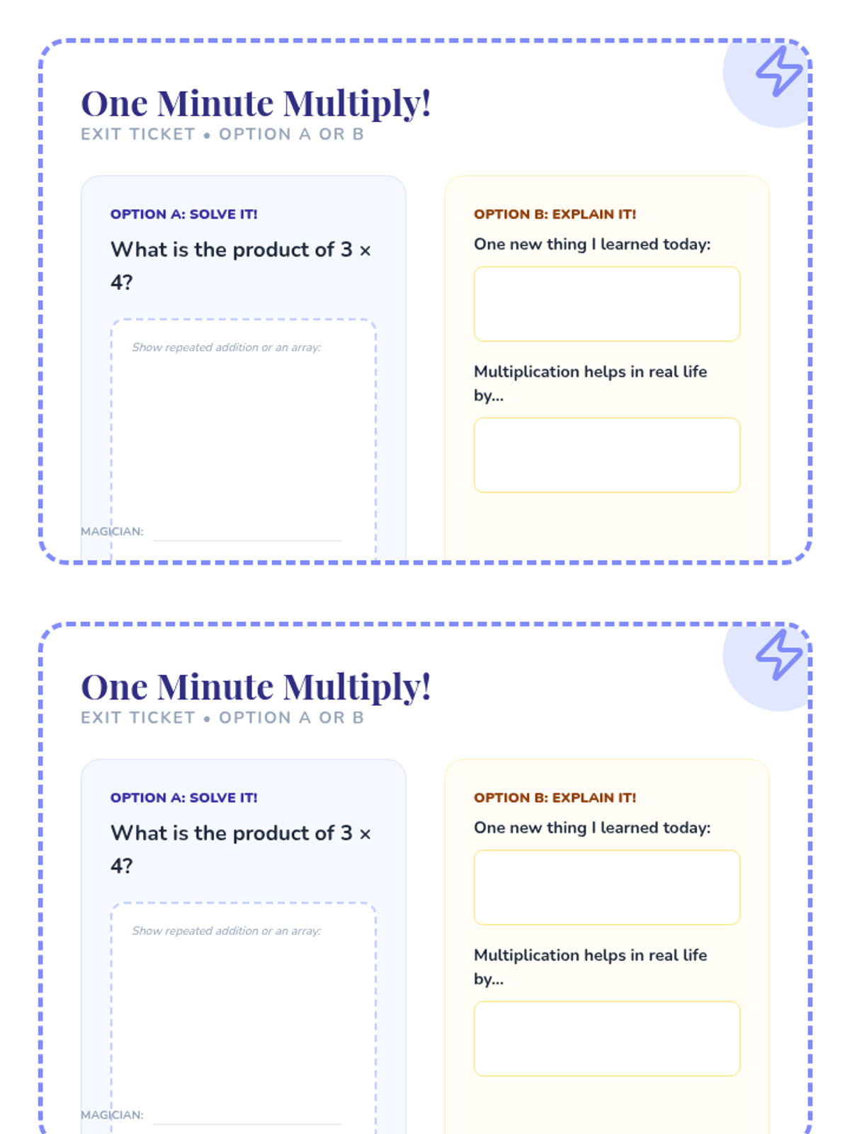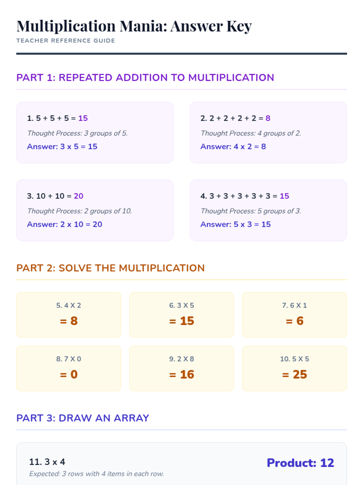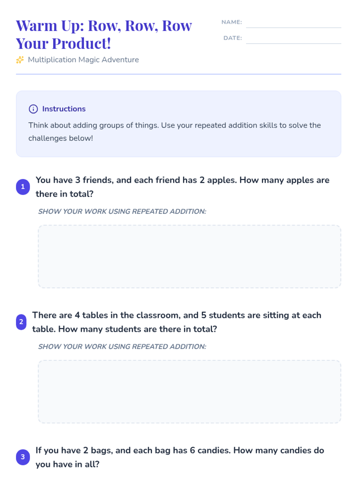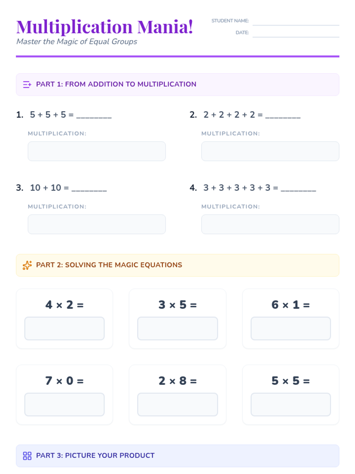 An introductory 3rd-grade lesson exploring multiplication as repeated addition through magical themes, arrays, and real-world storytelling.