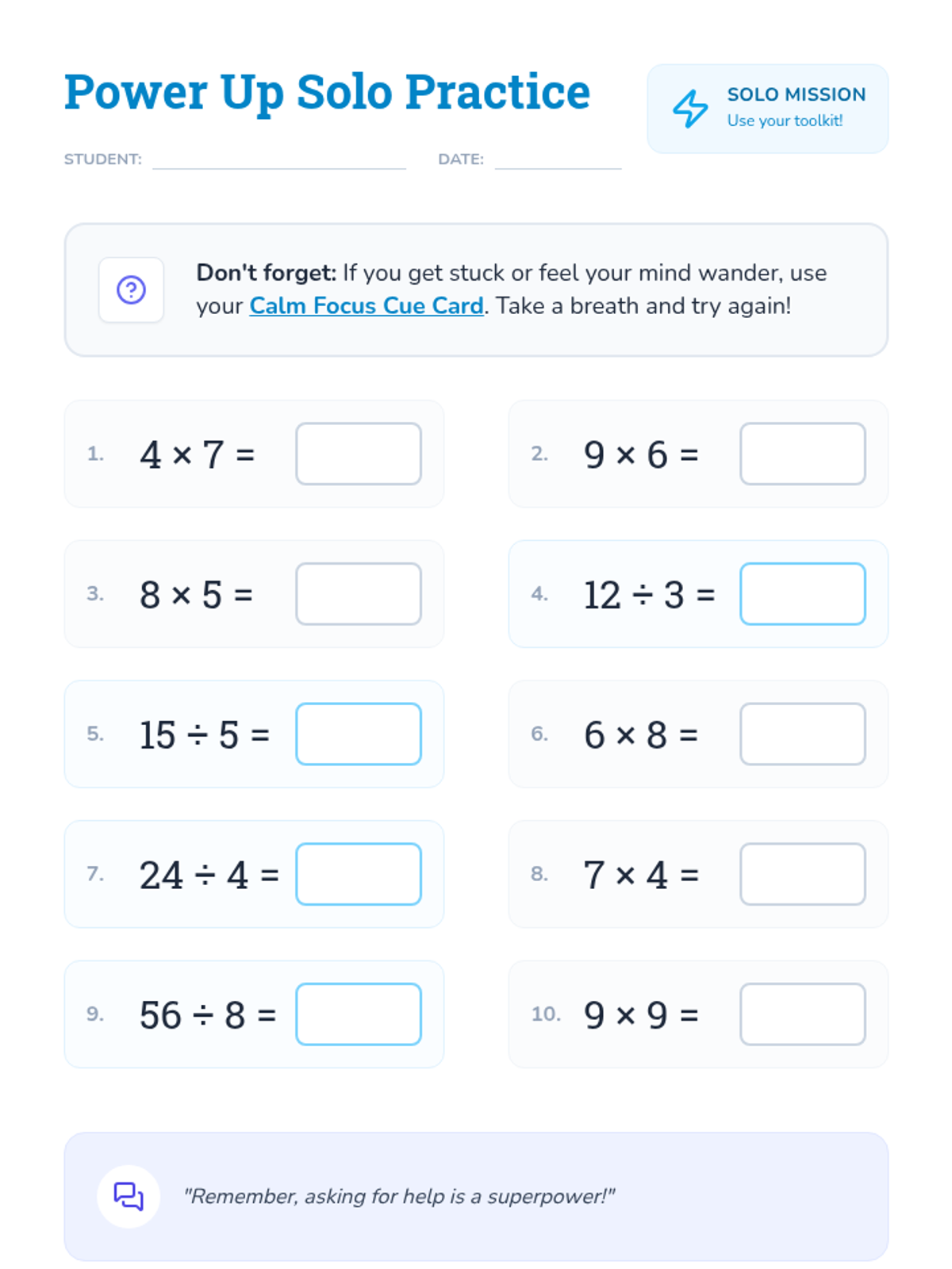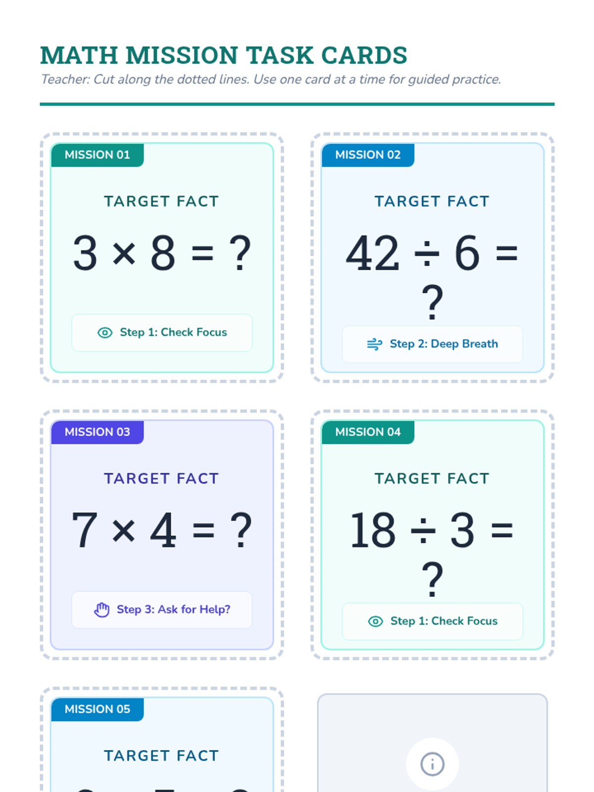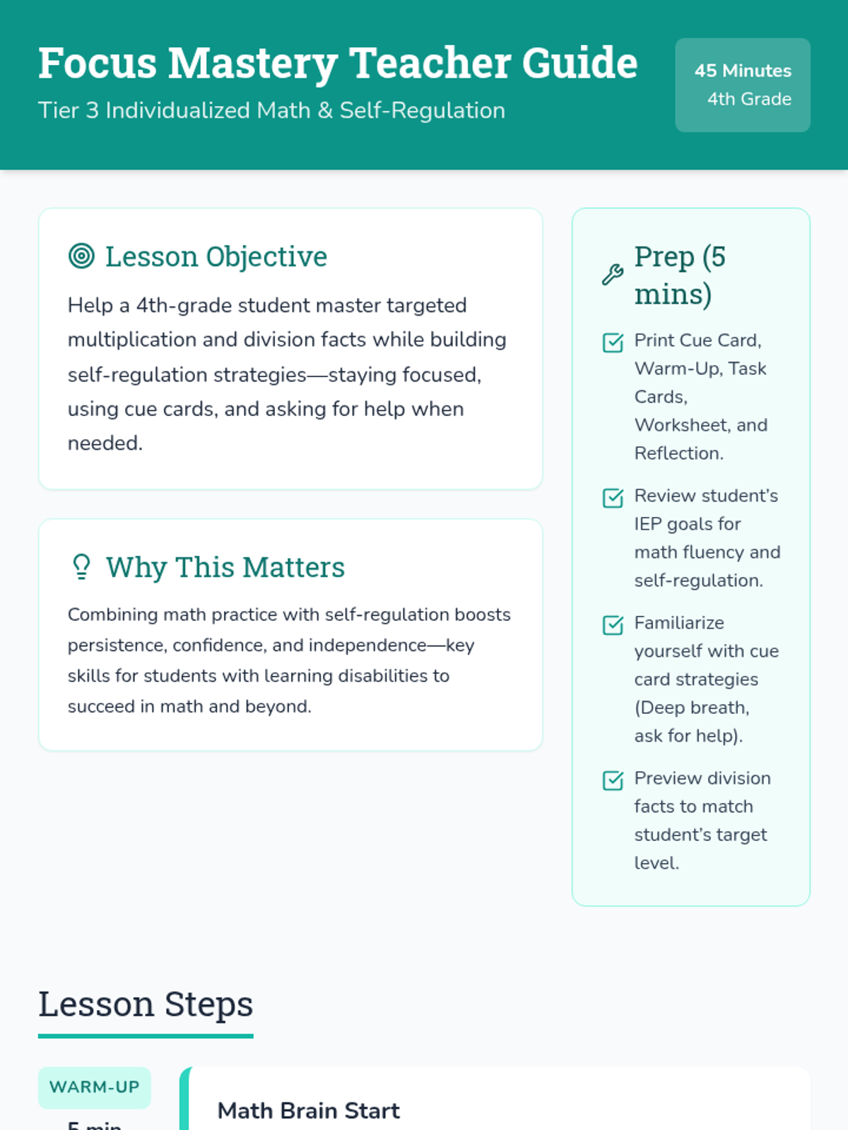 A one-session, individualized 45-minute Tier 3 lesson combining targeted multiplication and division practice with self-regulation strategies to help 4th-grade students stay engaged and build confidence.