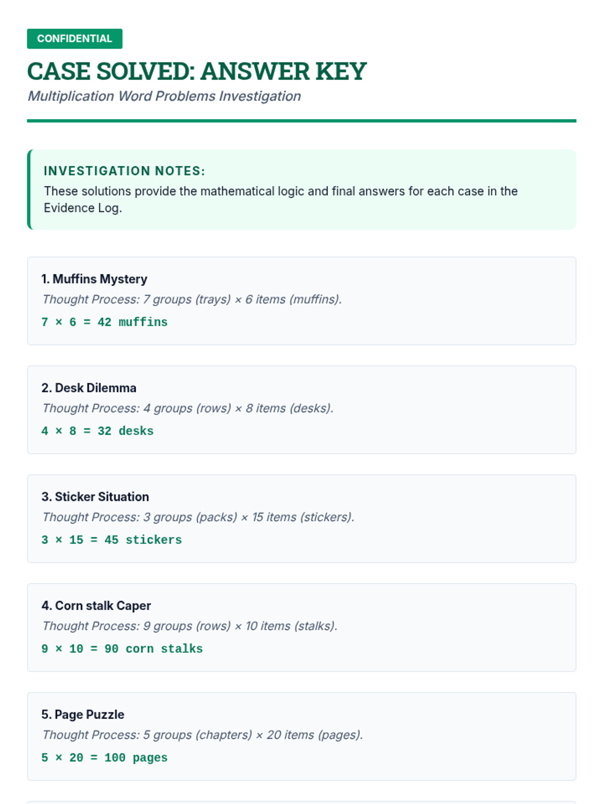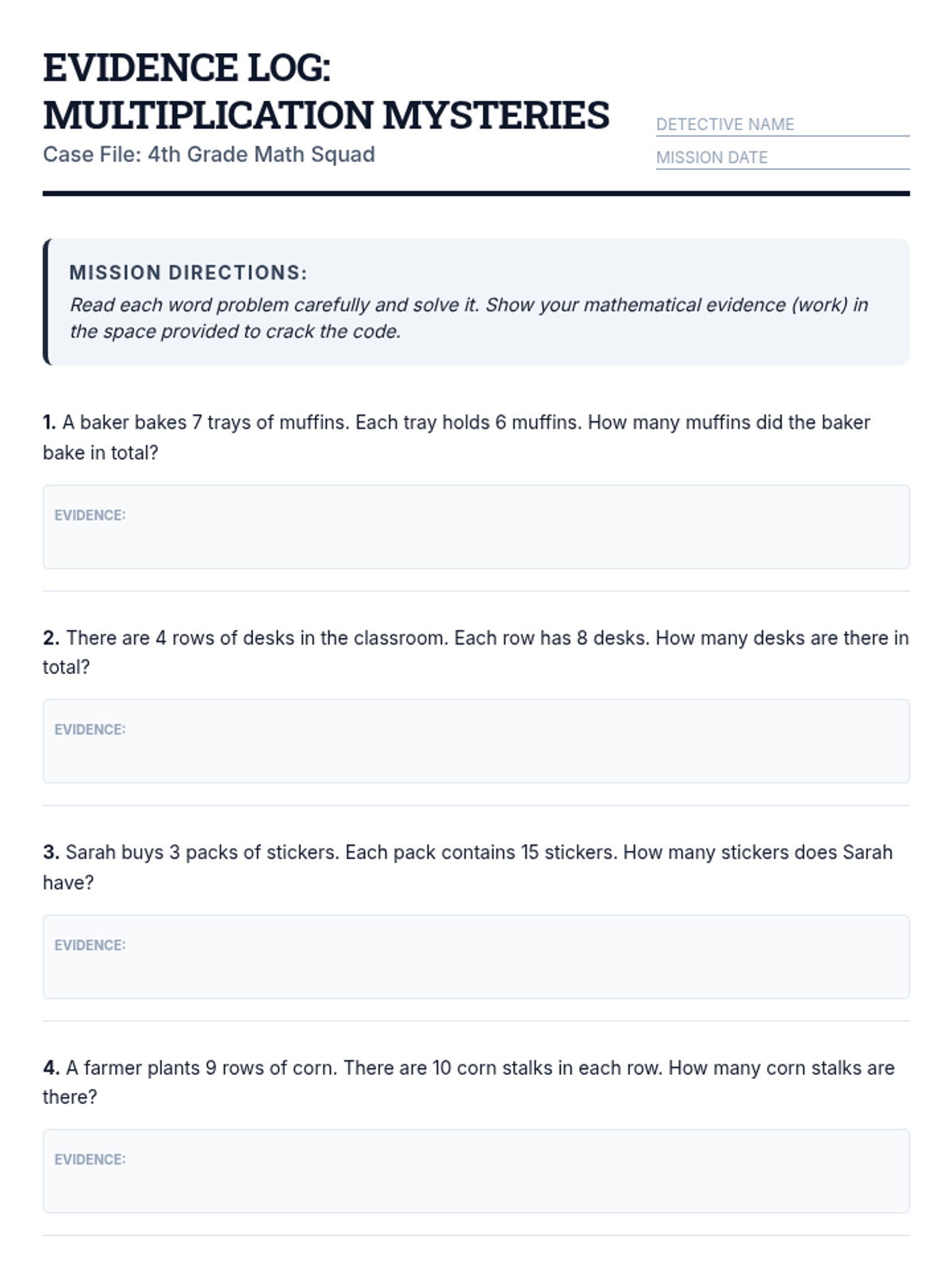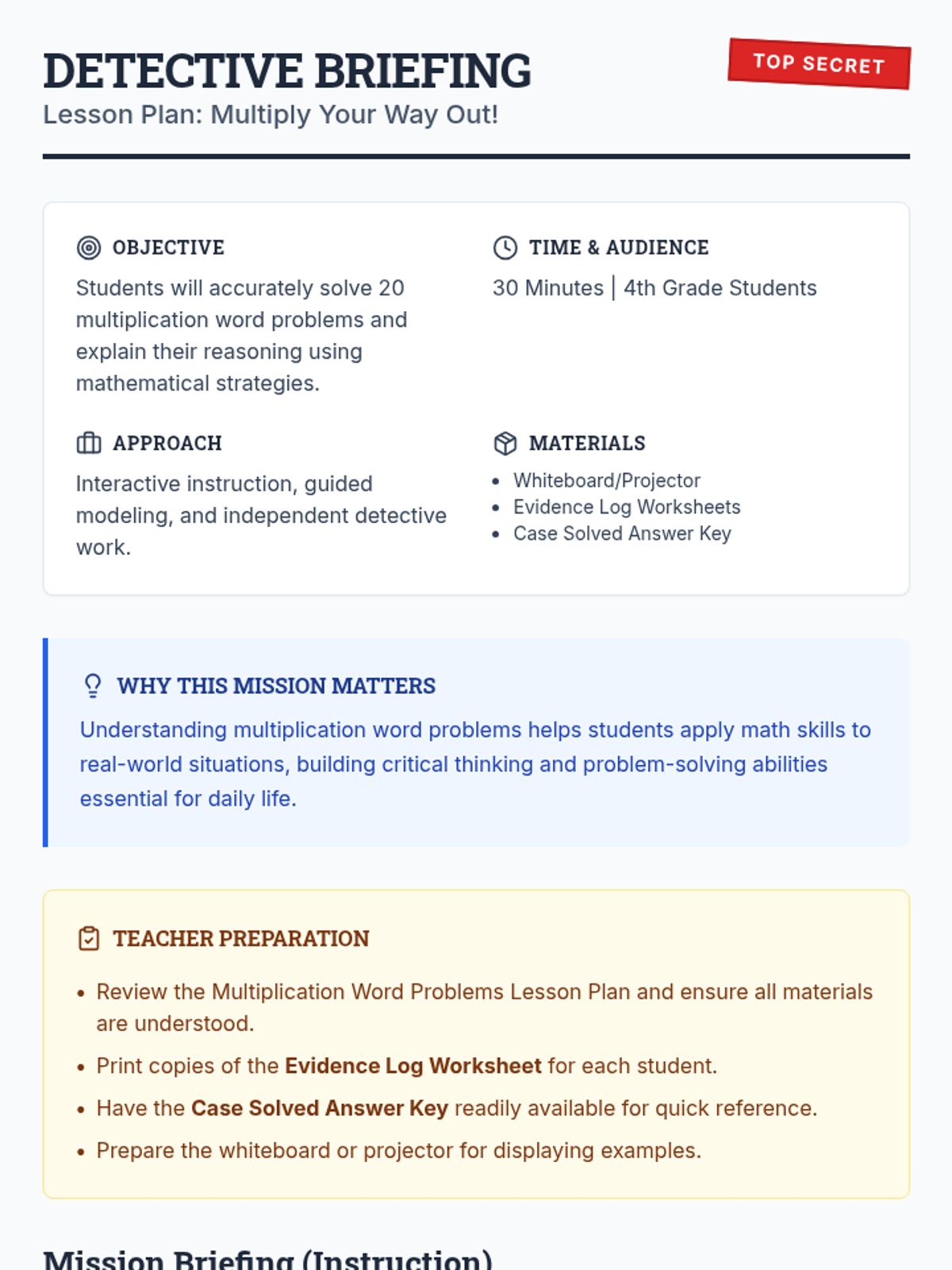 A 30-minute 4th-grade lesson where students become 'multiplication detectives' to solve 20 real-world word problems using multiplication strategies.