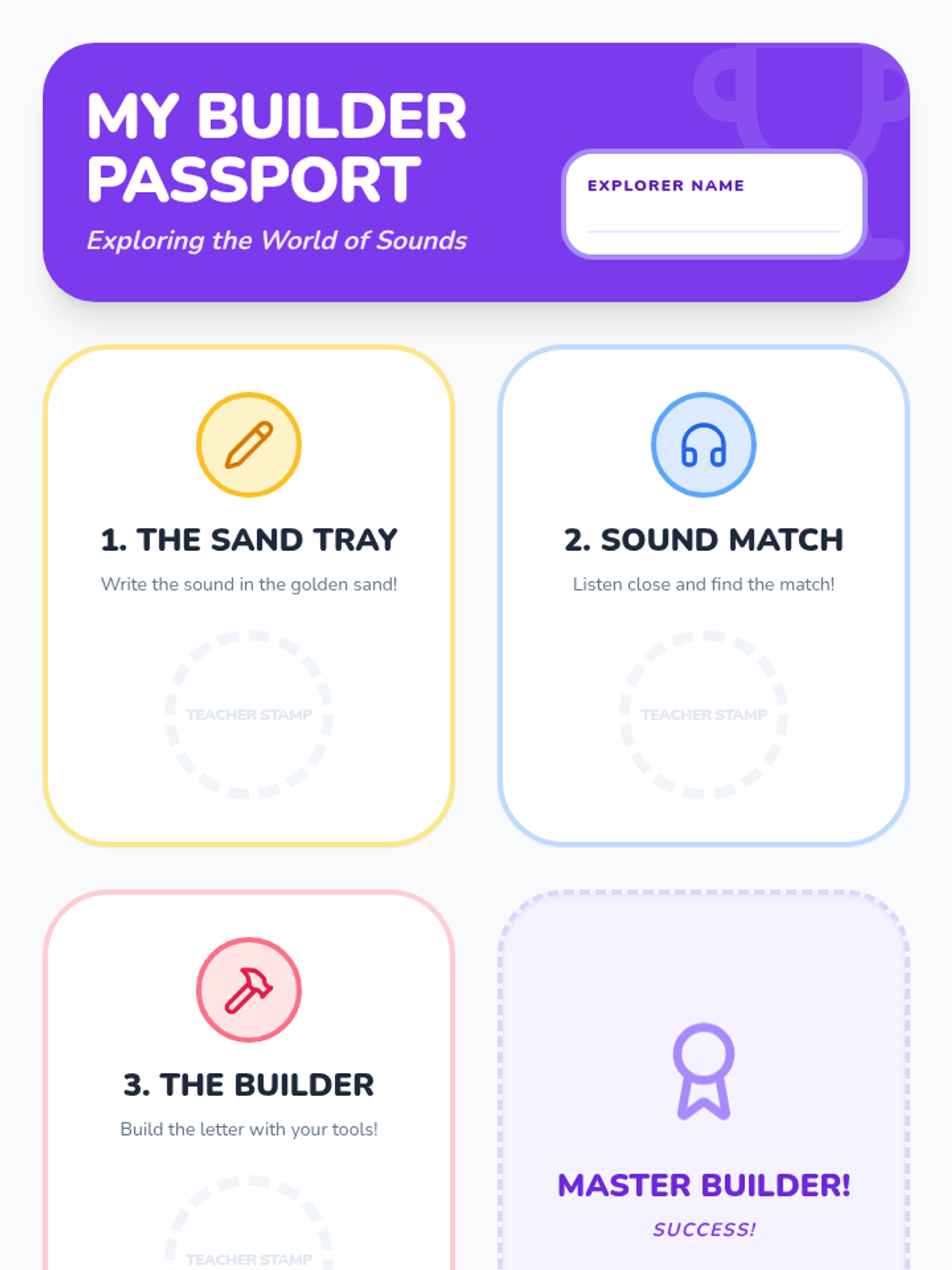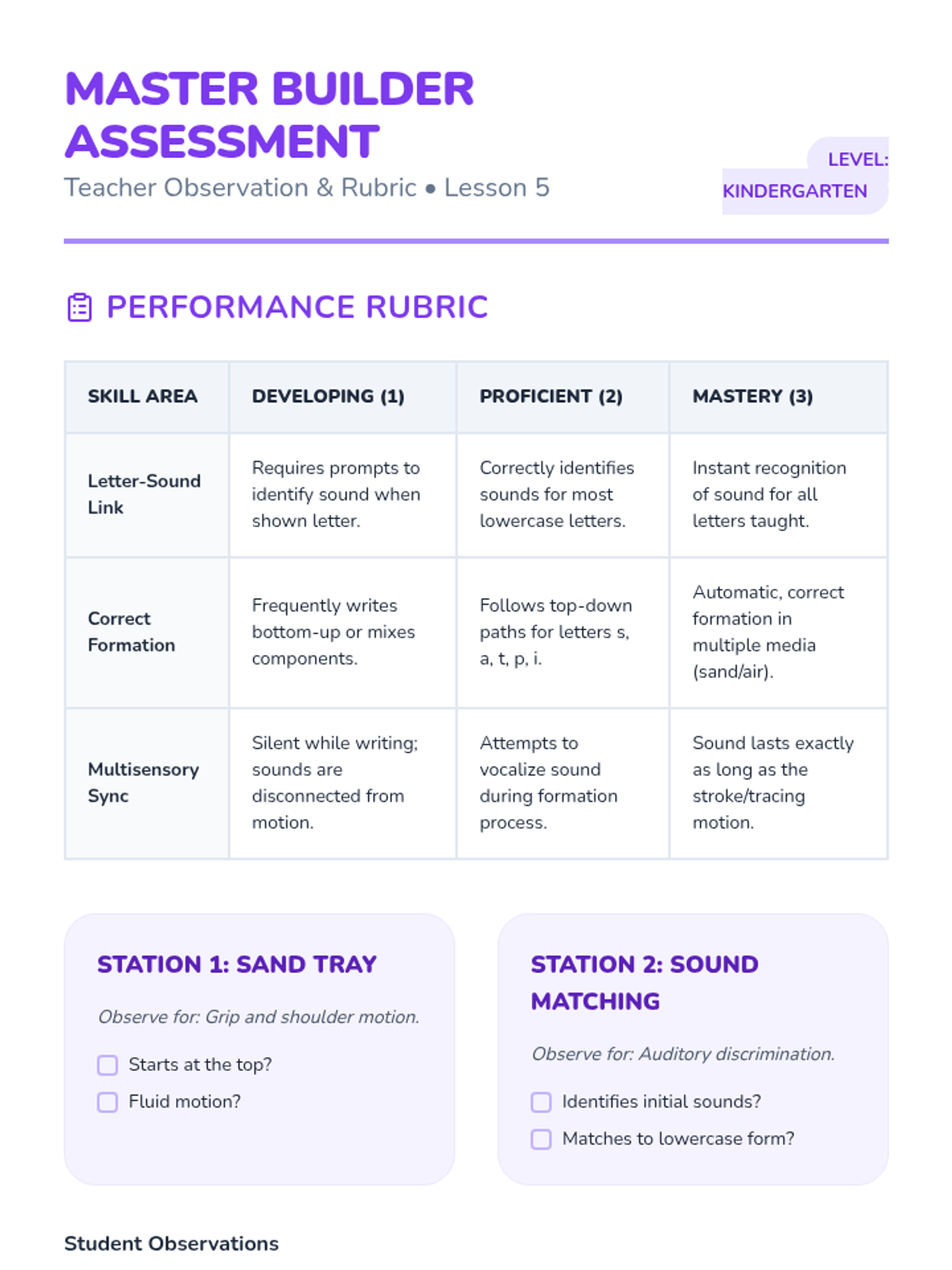 Students rotate through stations (sand writing, audio identification, manipulative matching) to demonstrate mastery of lowercase letter-sound pairs.