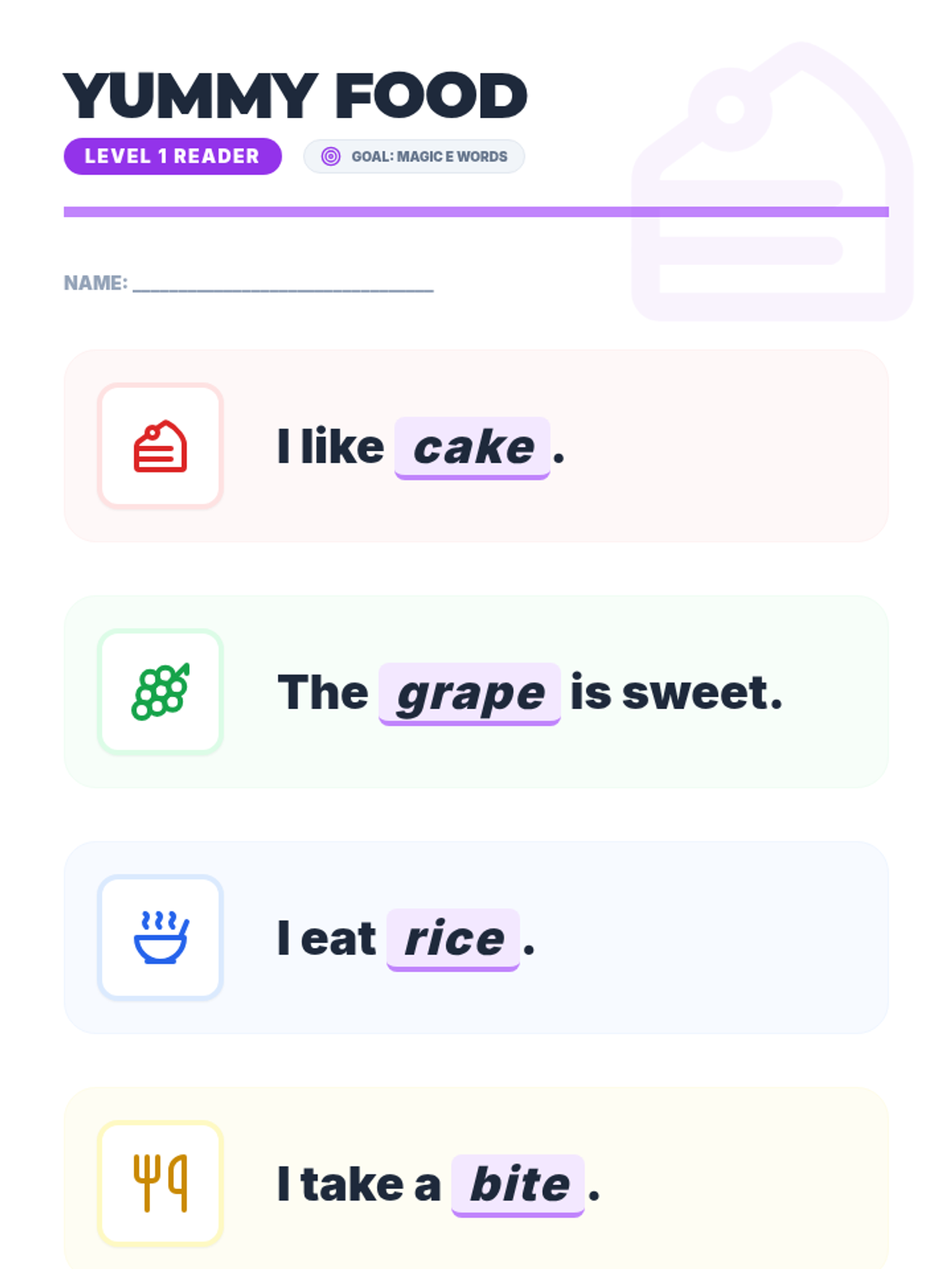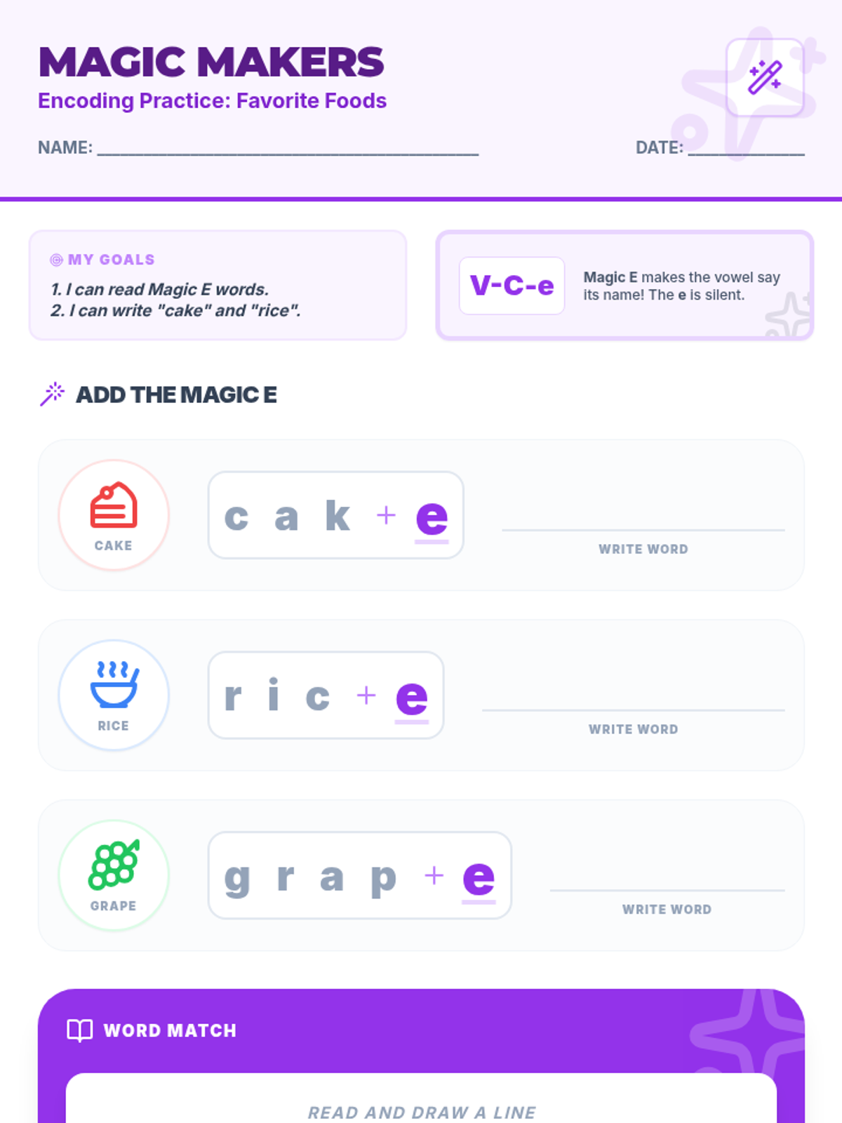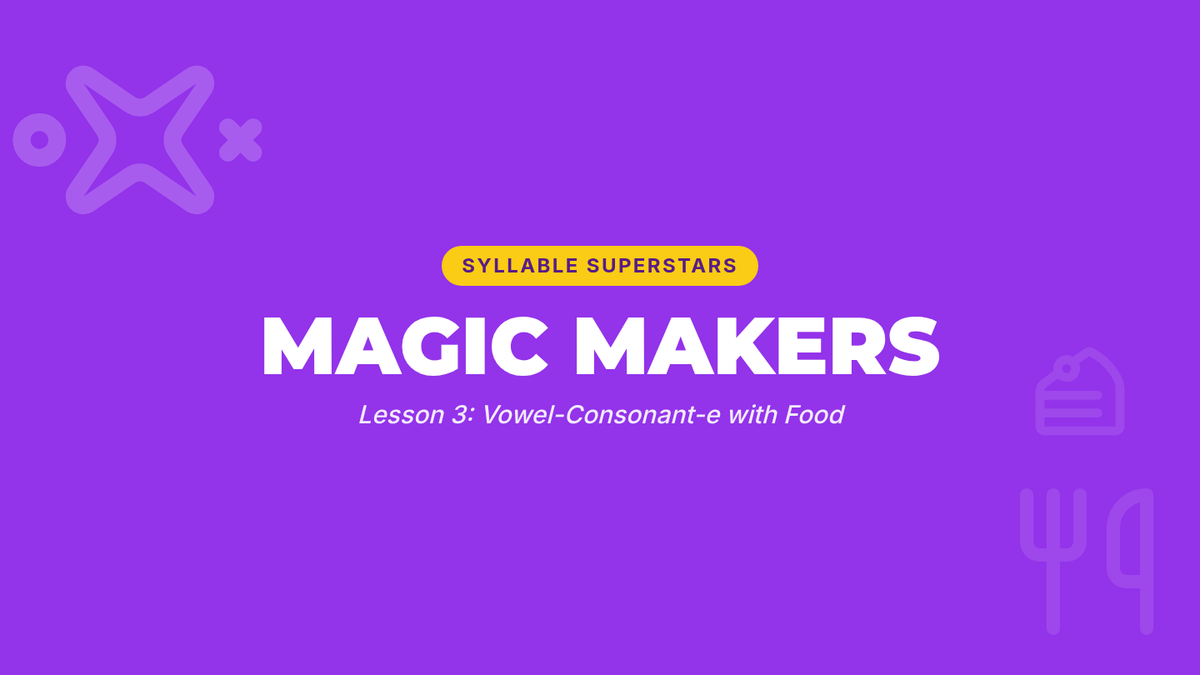 Exploring the Magic E pattern (V-C-e) with a focus on favorite foods. Students will practice transforming closed syllables into V-C-e syllables.