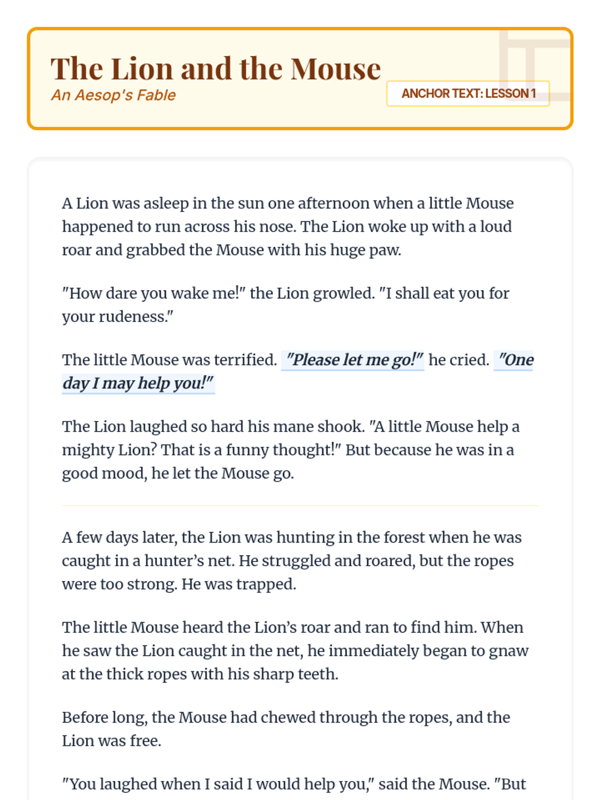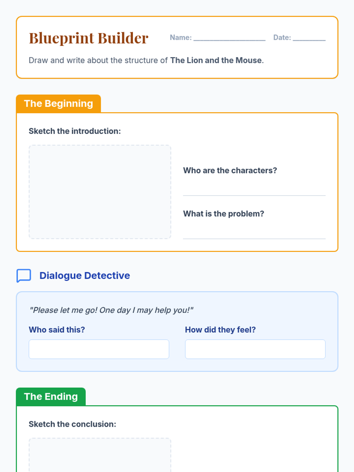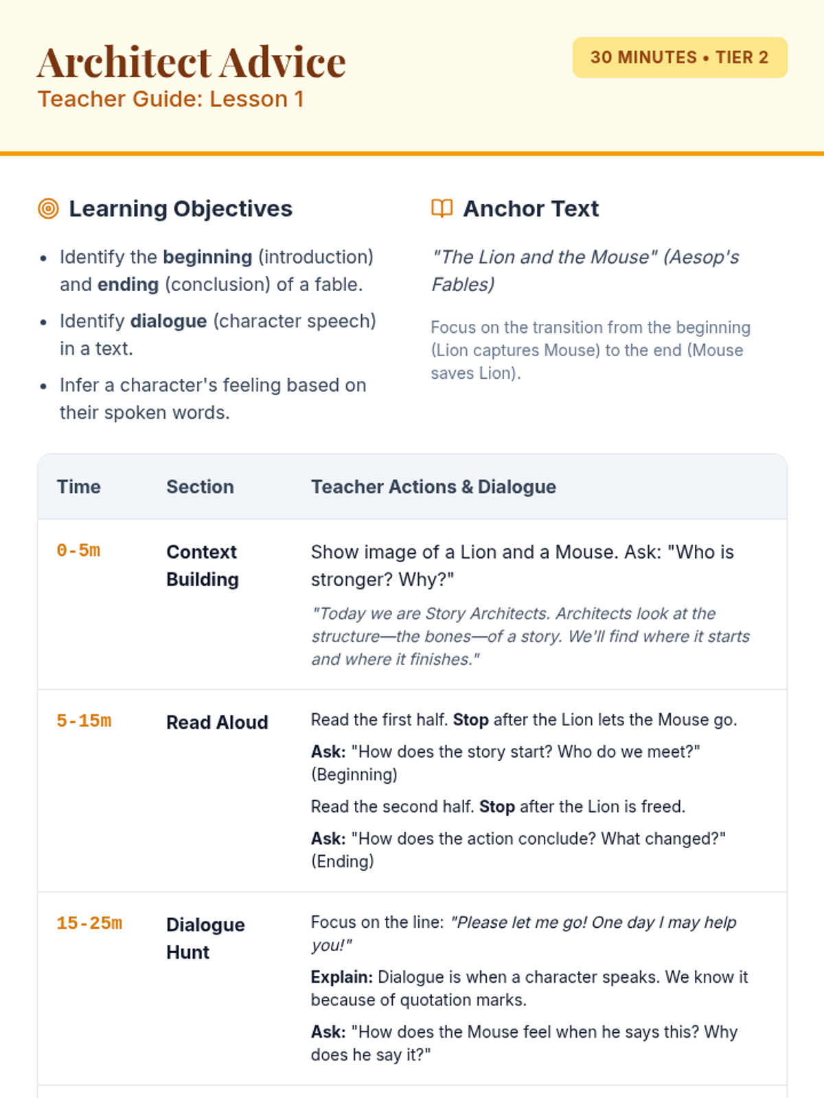 Students learn to identify the beginning and ending of a story and are introduced to dialogue as a way to understand character feelings. Uses 'The Lion and the Mouse' as the anchor text.