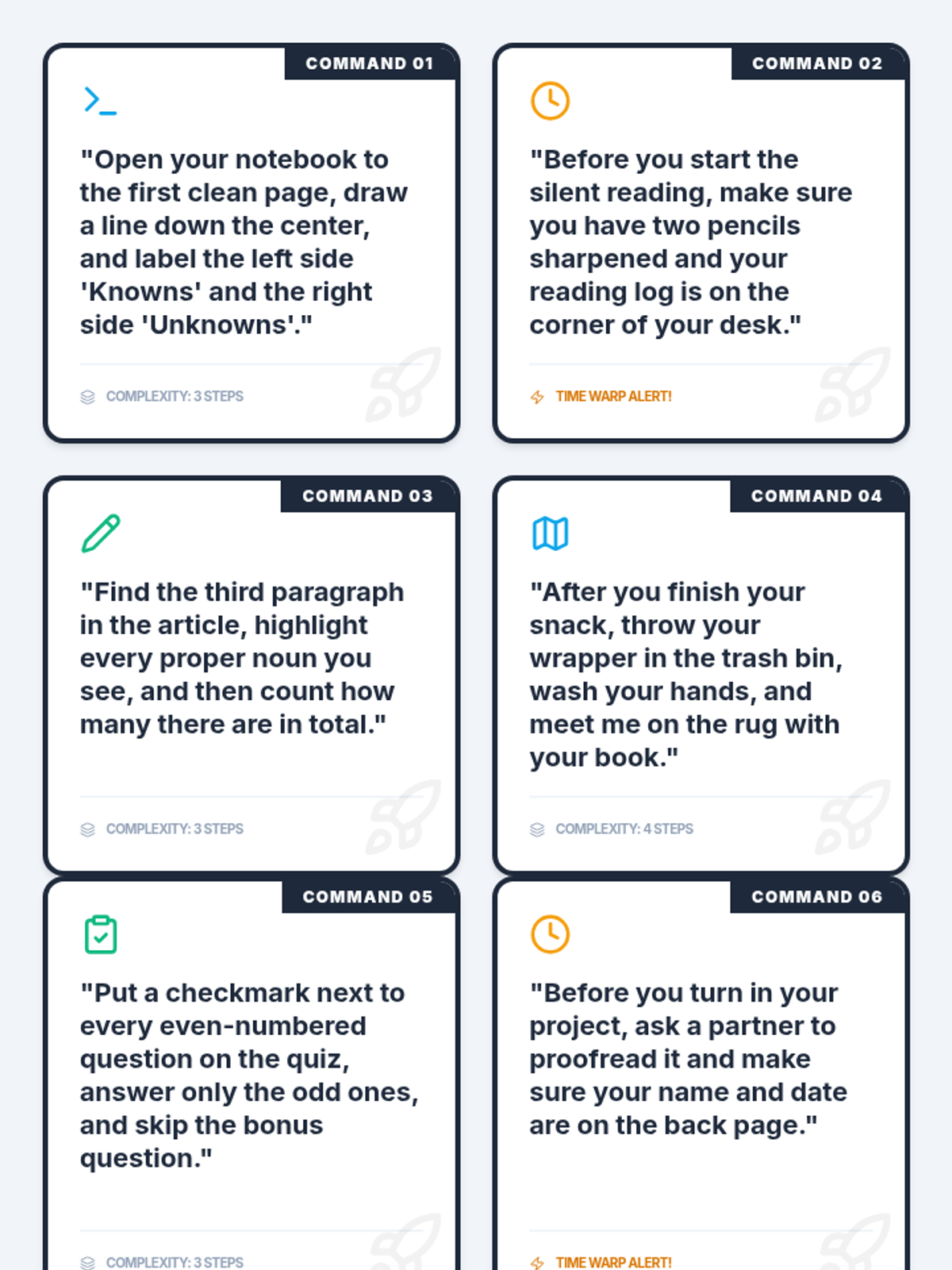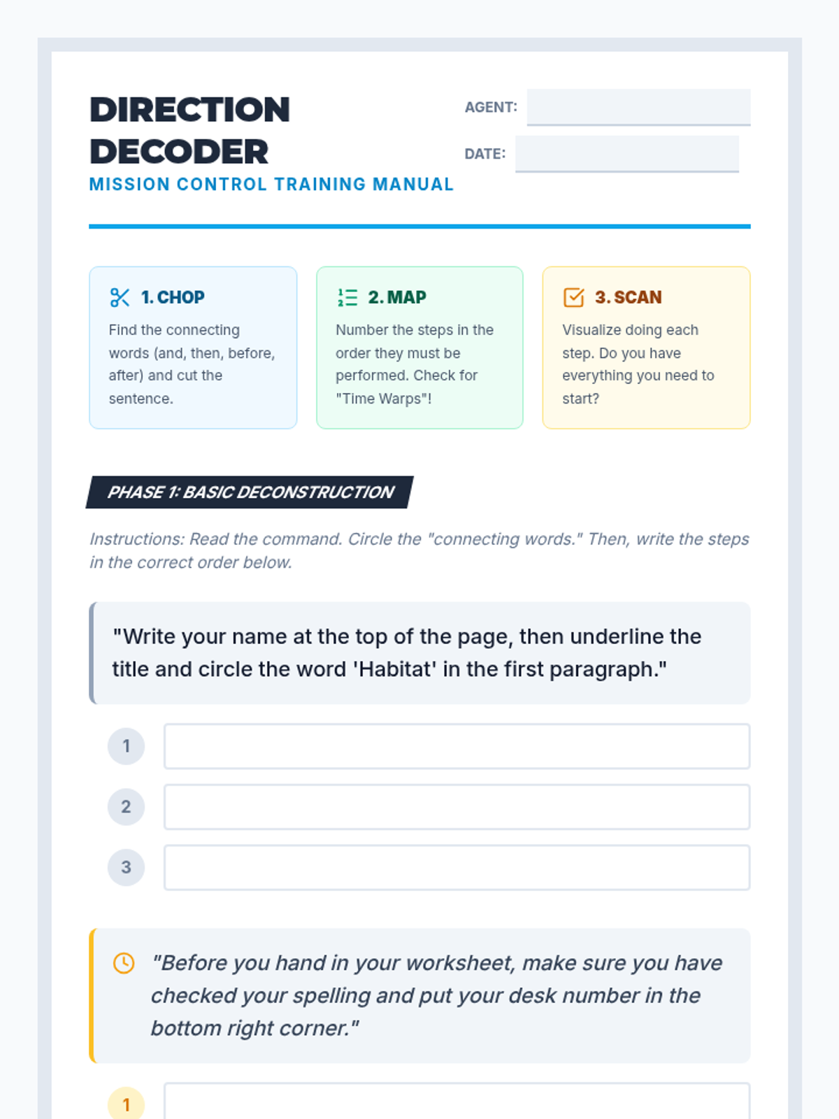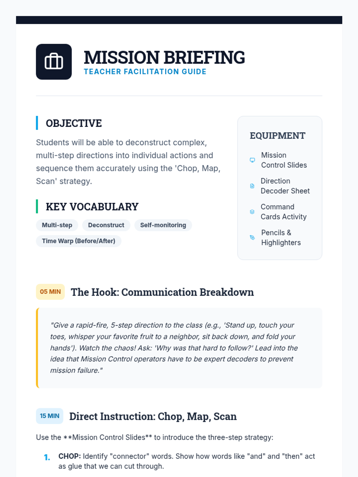 A comprehensive lesson designed to help students master multi-step directions by breaking down complex sentences and using self-monitoring strategies. Students act as 'Mission Control' operators, decoding and executing complex commands to ensure mission success.