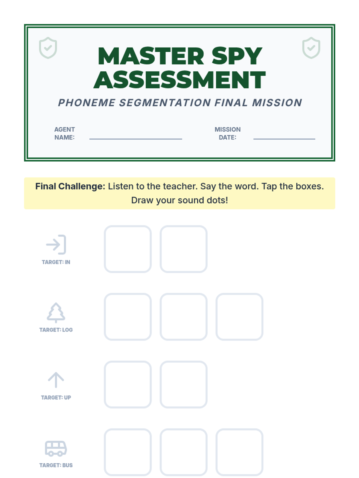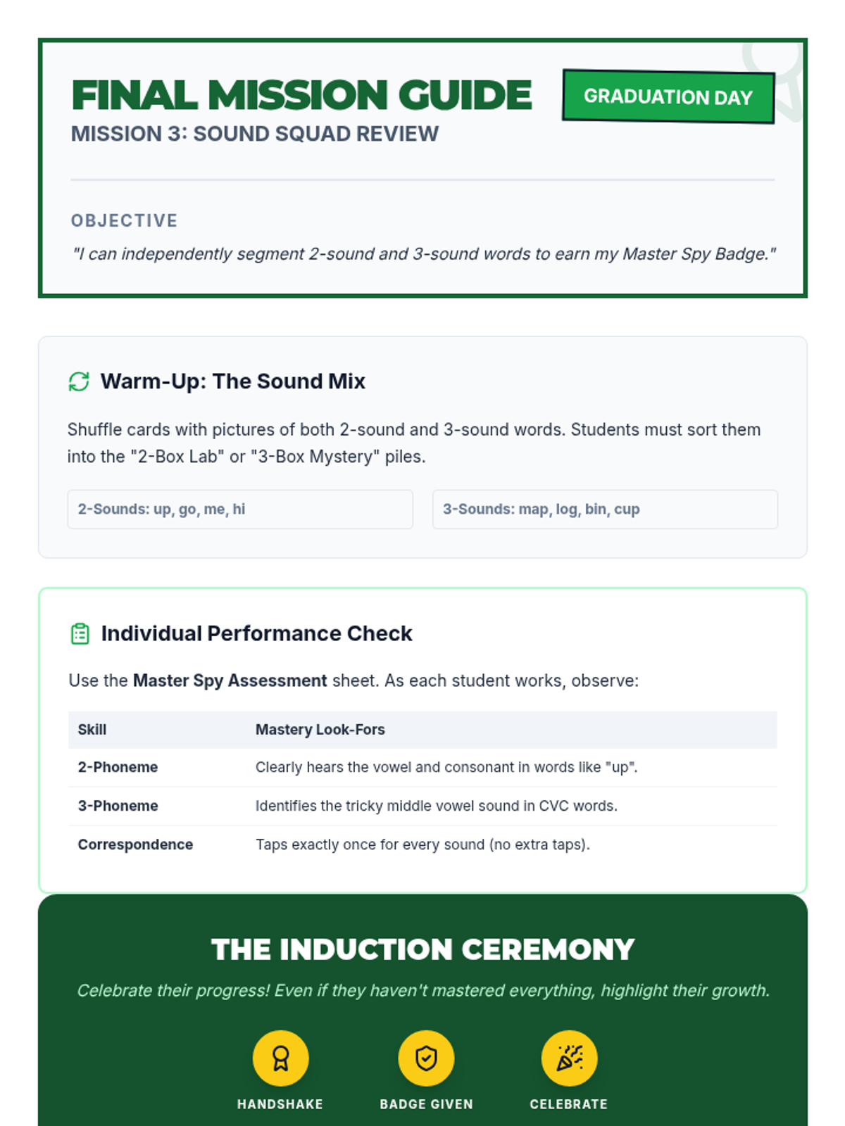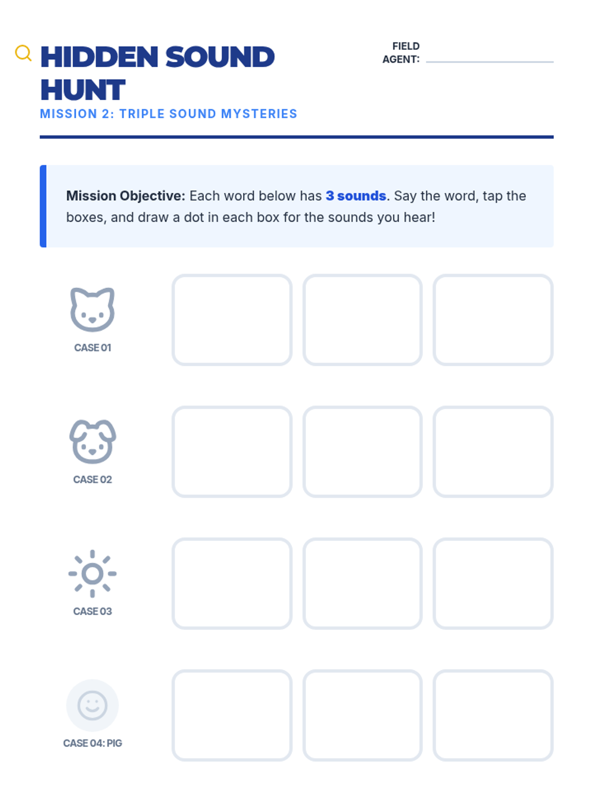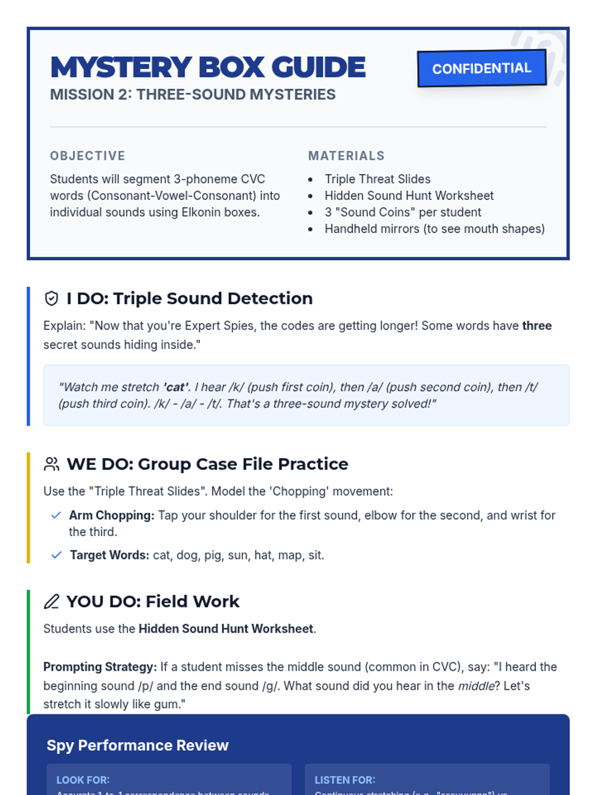 An intermediate intervention lesson focusing on 3-phoneme CVC words. Students use 'Sound Spy' tools to segment words like 'cat', 'pig', and 'sun' into beginning, middle, and ending sounds.