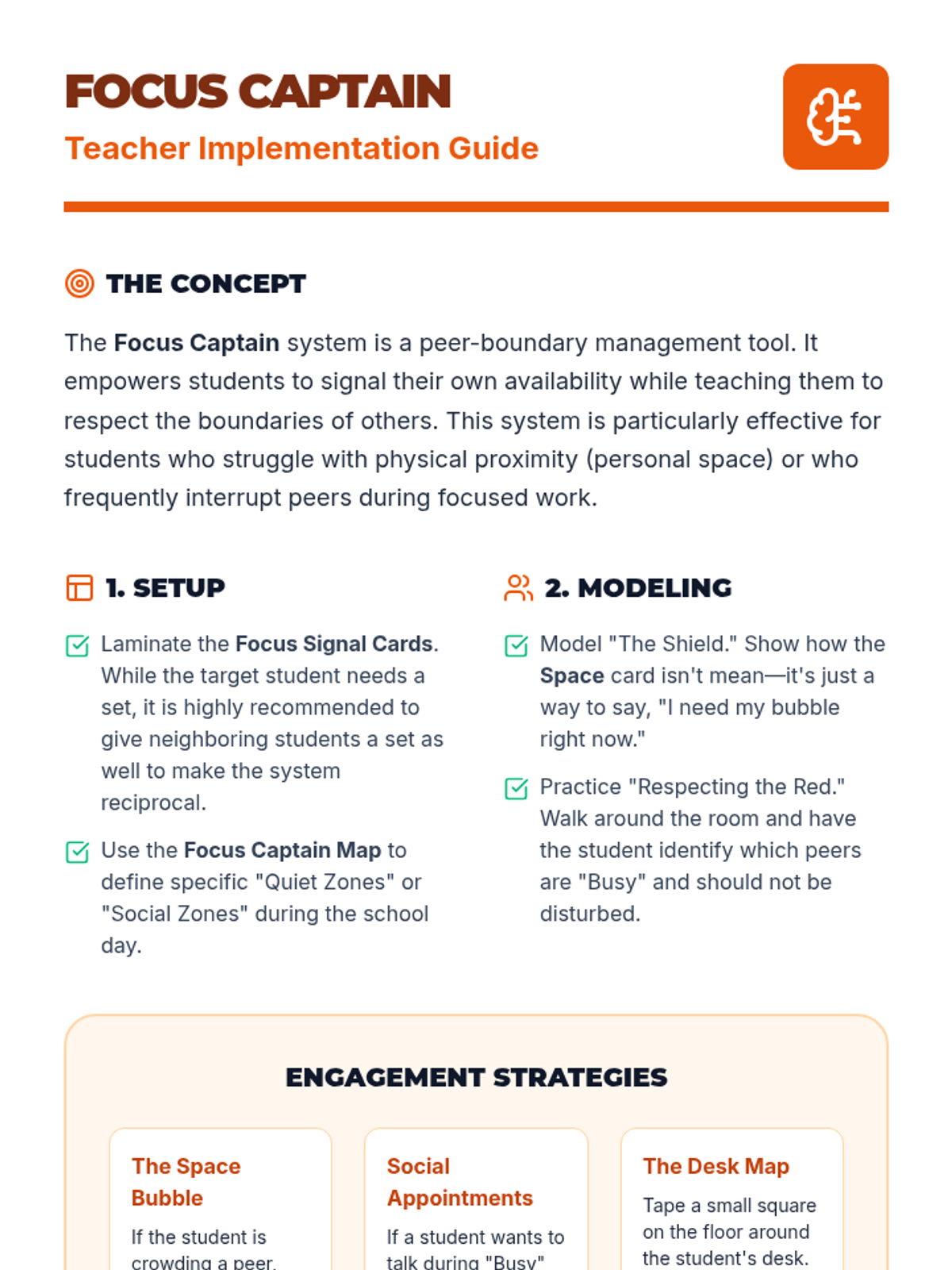 A visual system to help students respect peer boundaries, manage physical proximity, and avoid distracting others during focused work times.