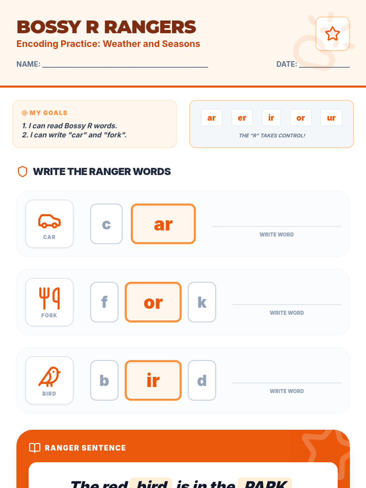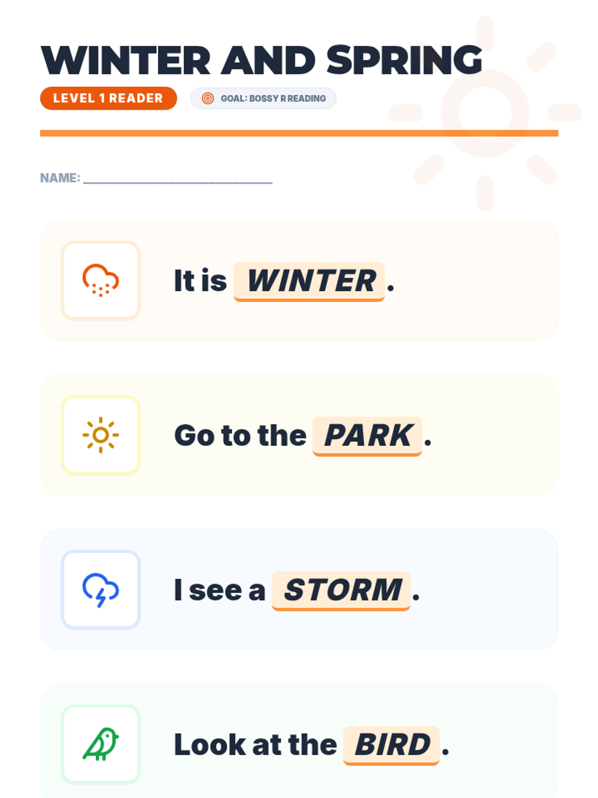 Learning R-controlled syllables (ar, er, ir, or, ur) through the context of seasons and weather. Focus on how 'r' changes the vowel sound.