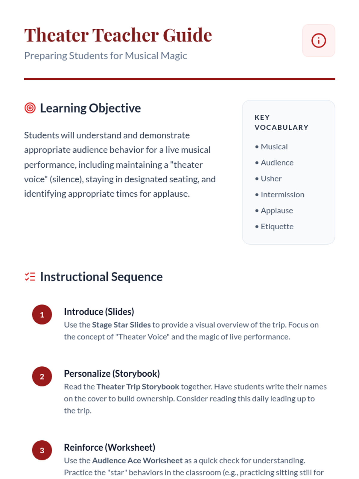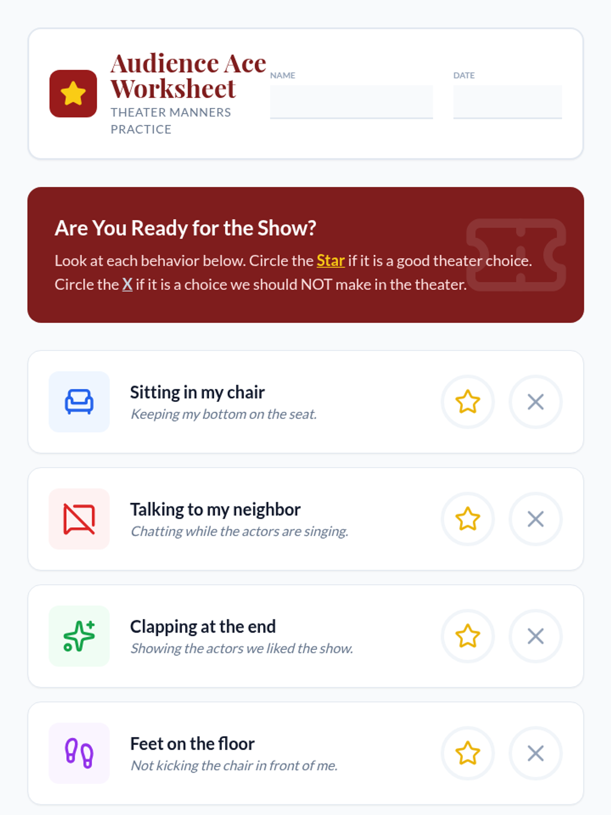 This lesson prepares students for the social expectations and etiquette of attending a live musical performance. It uses a social story approach to model appropriate theater behavior, such as staying in one's seat, using a 'theater voice' (silence), and clapping at the right times.