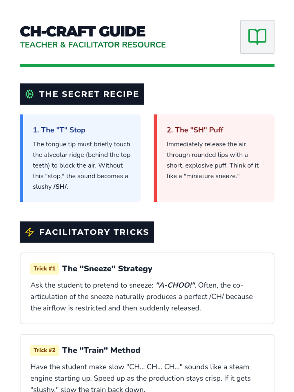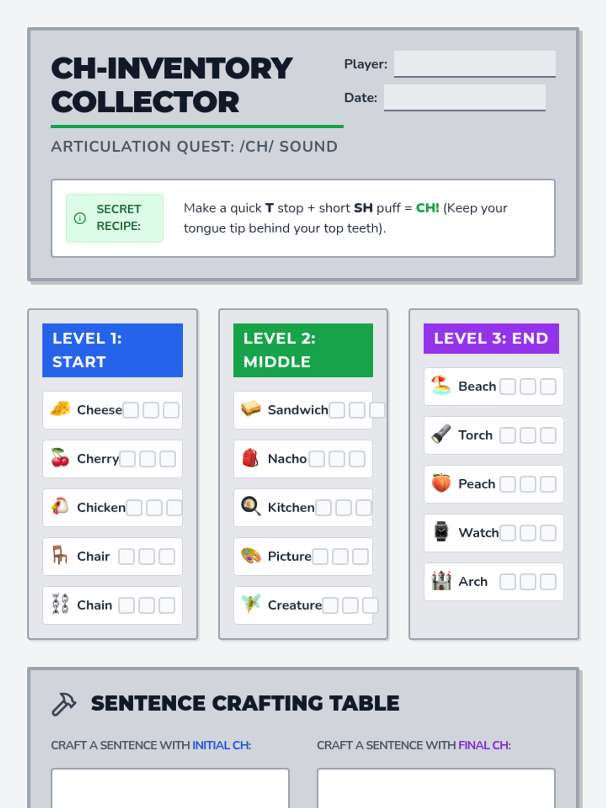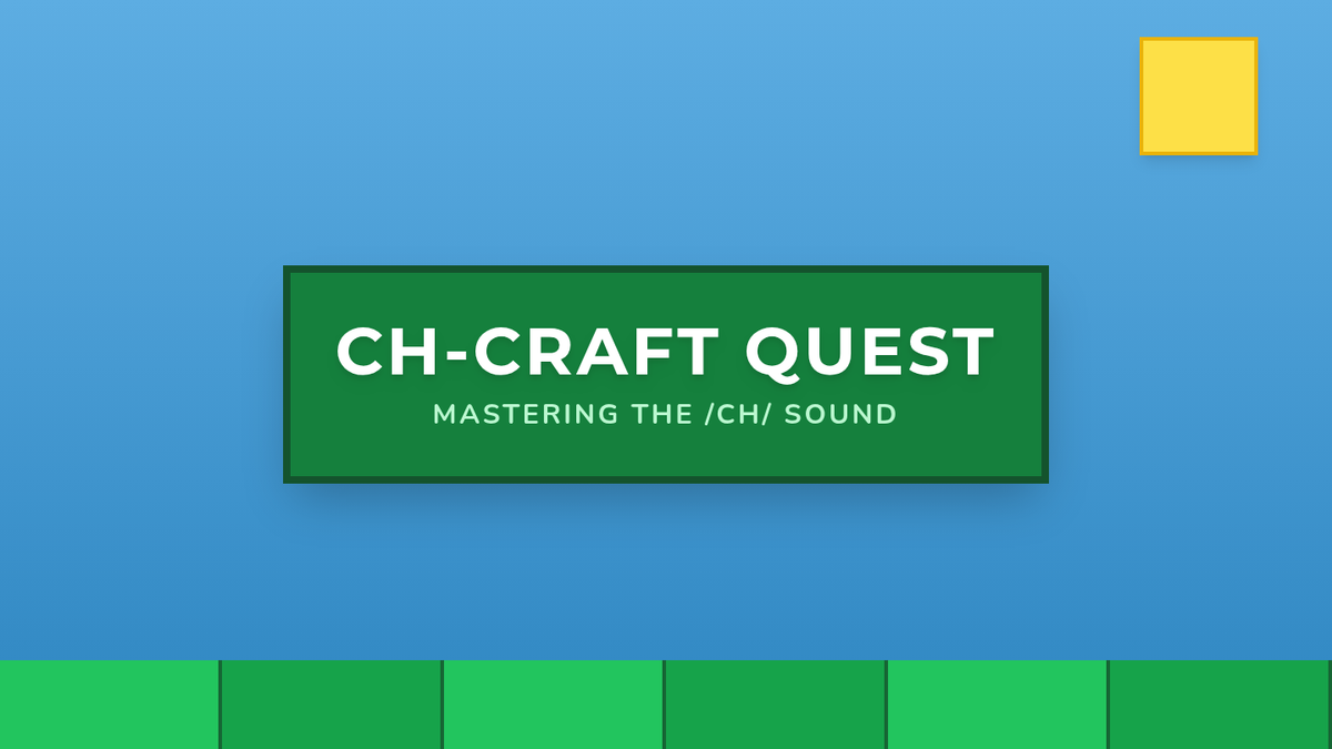 A Minecraft-themed lesson focused on mastering the /ch/ sound through production 'recipes', mining challenges, and crafting activities. Includes visual slides for instruction and printable worksheets for practice.