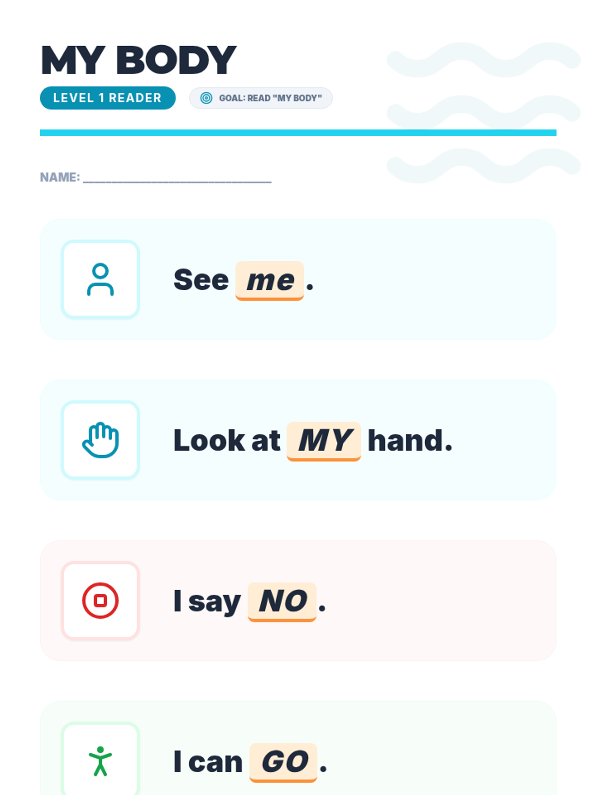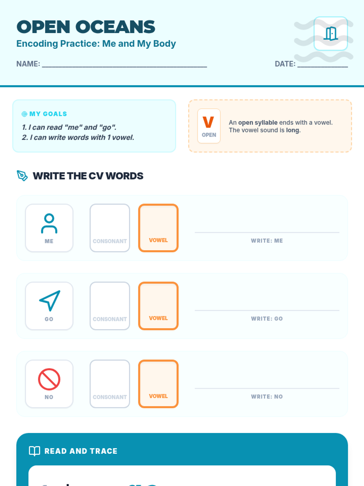 Introduction to open syllables (CV) using body part vocabulary and high-frequency words. Students learn that when a syllable ends in a vowel, the vowel says its name.