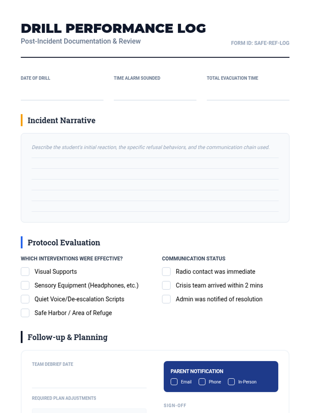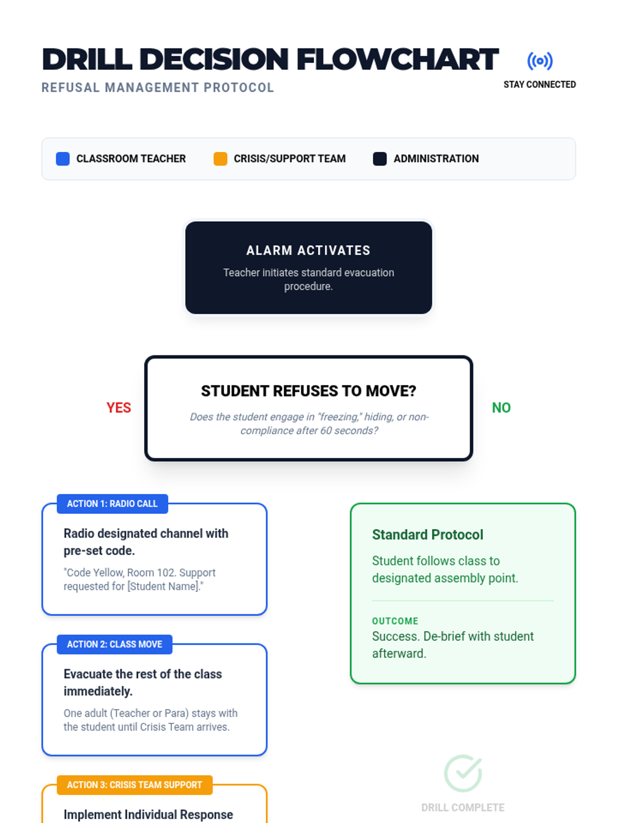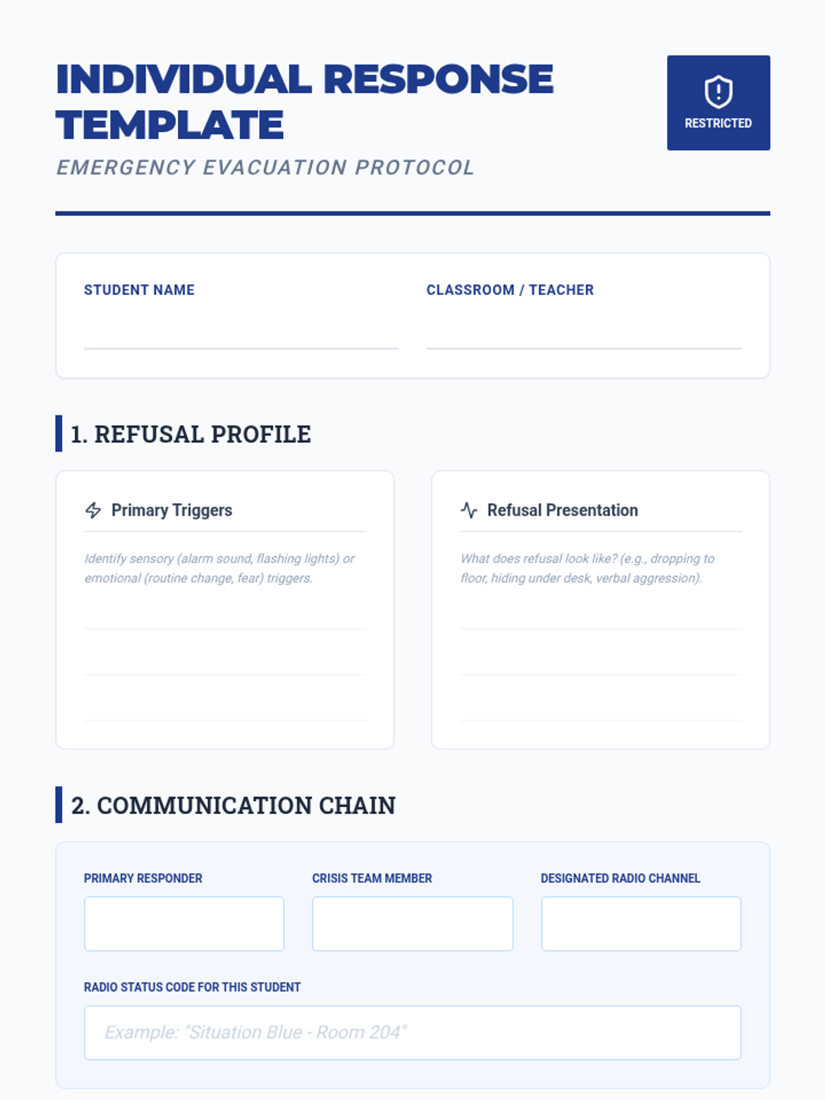 A comprehensive planning kit for schools to manage students who struggle with or refuse to evacuate during fire drills, focusing on communication and individualized support.