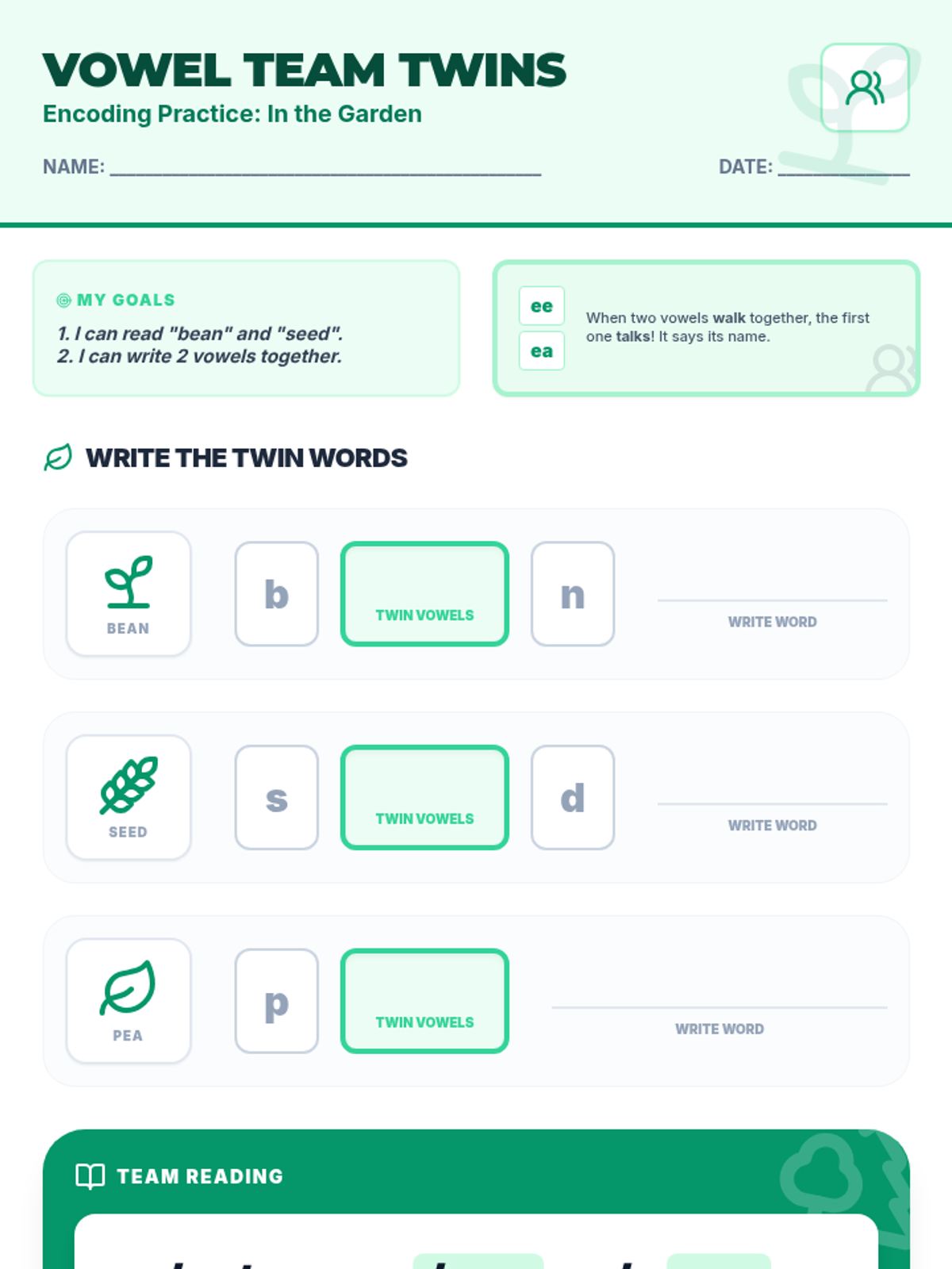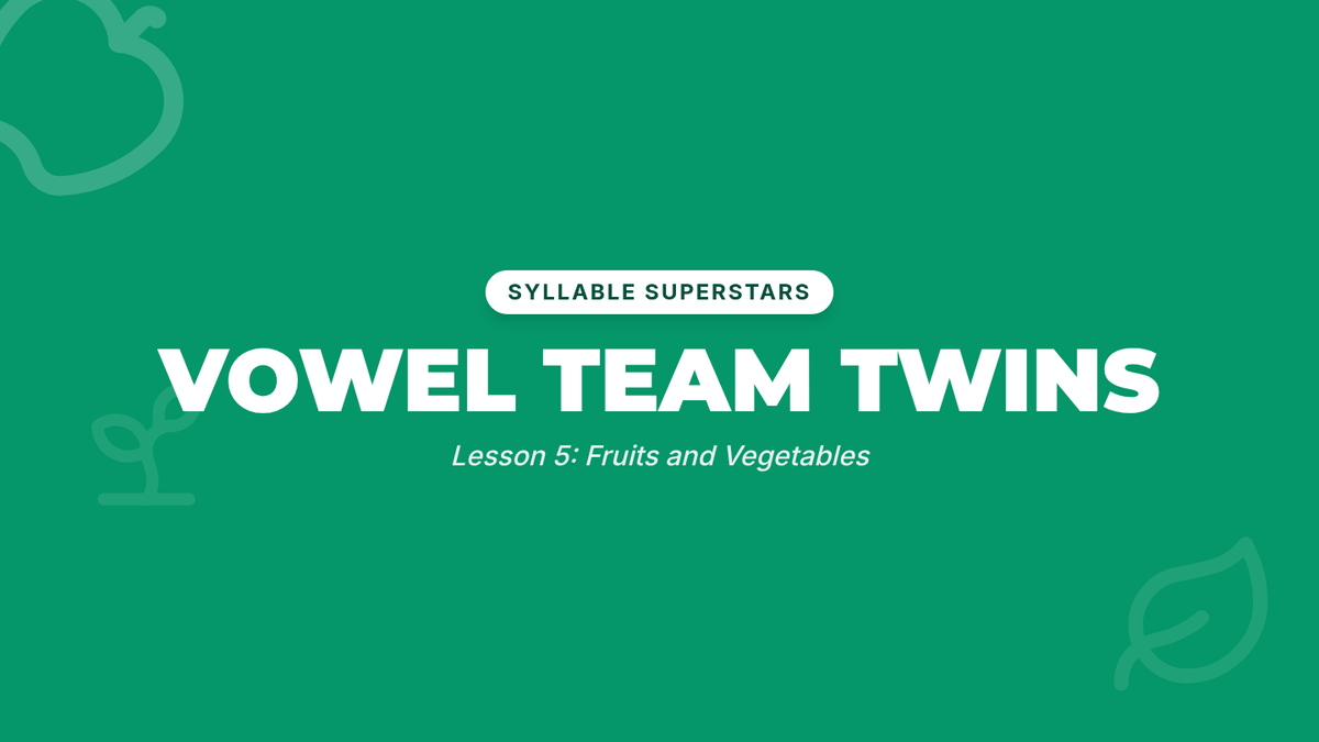 Introduction to common vowel teams (ee, ea, ai, oa) using fruits and vegetables as the primary vocabulary context.
