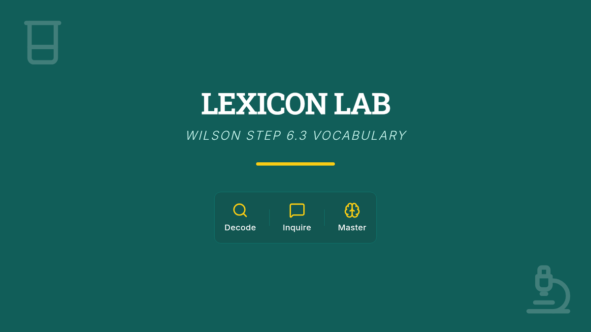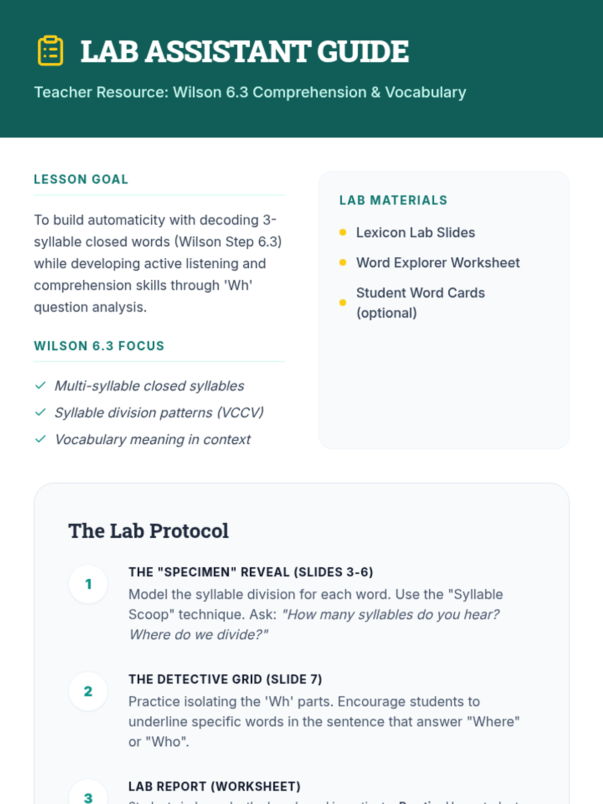 A vocabulary and comprehension lesson focusing on three-syllable words from Wilson Step 6.3, with an emphasis on answering 'wh' questions.