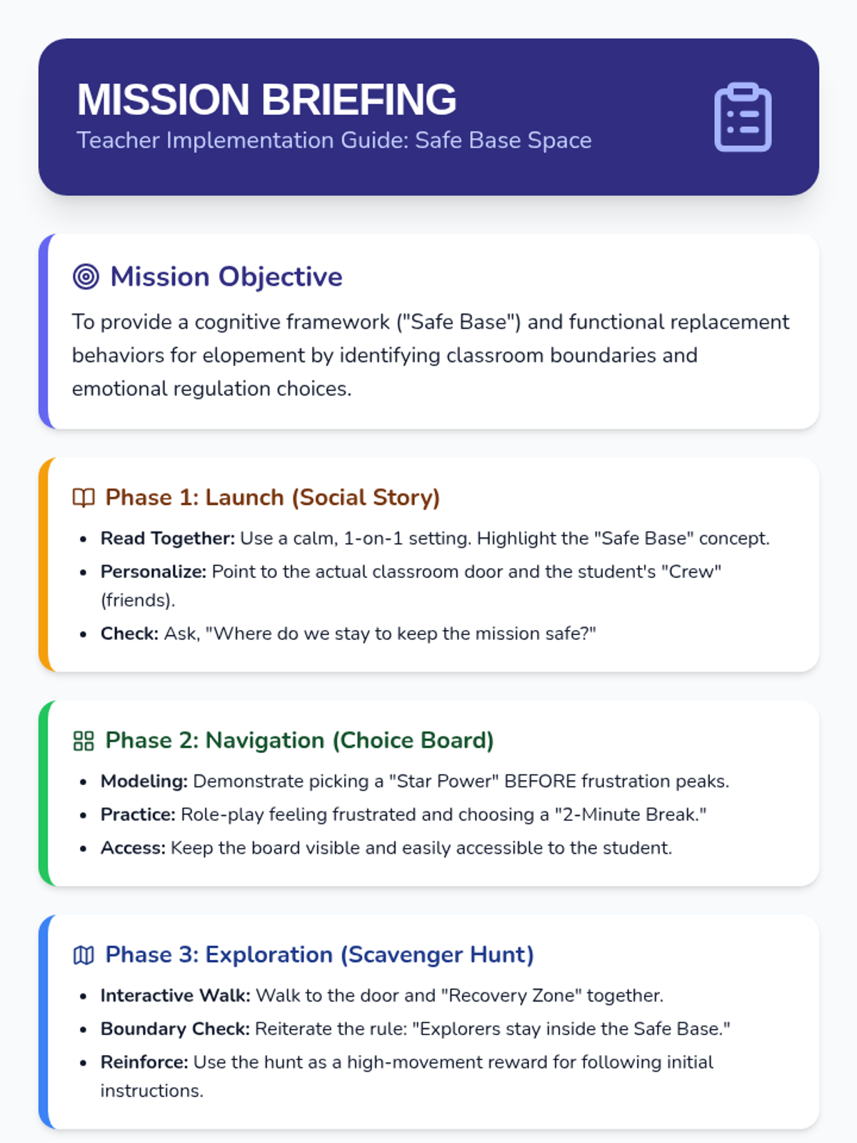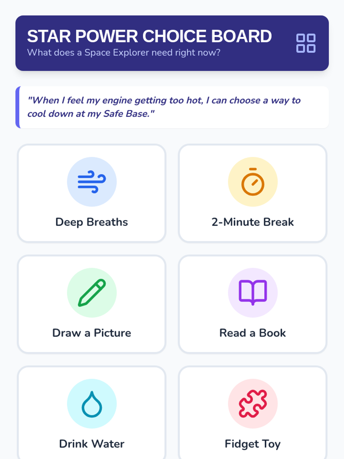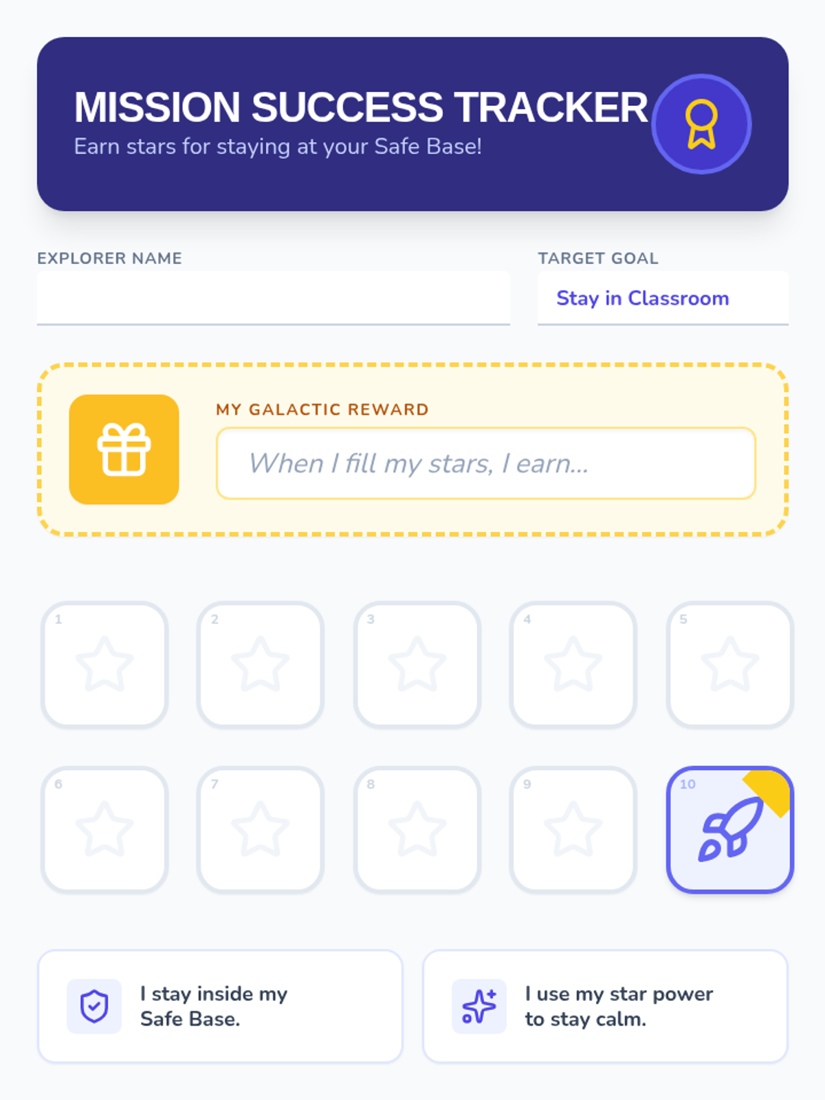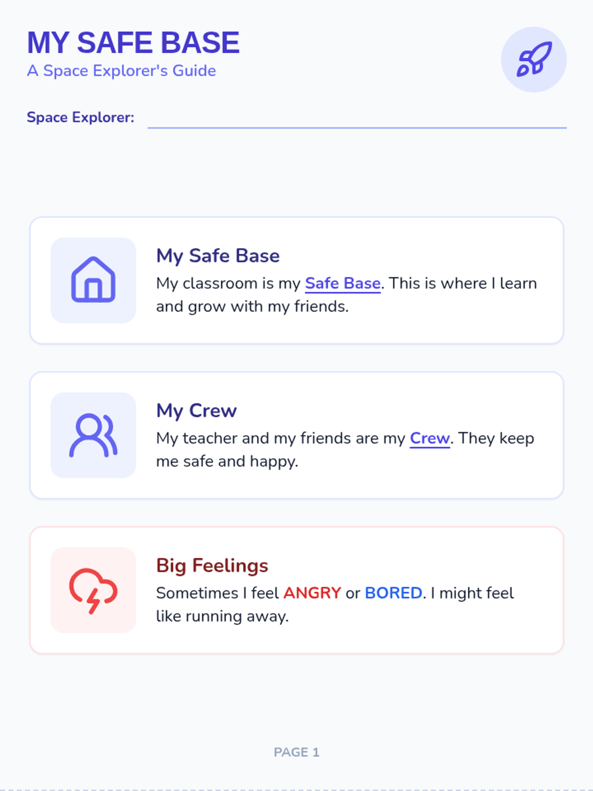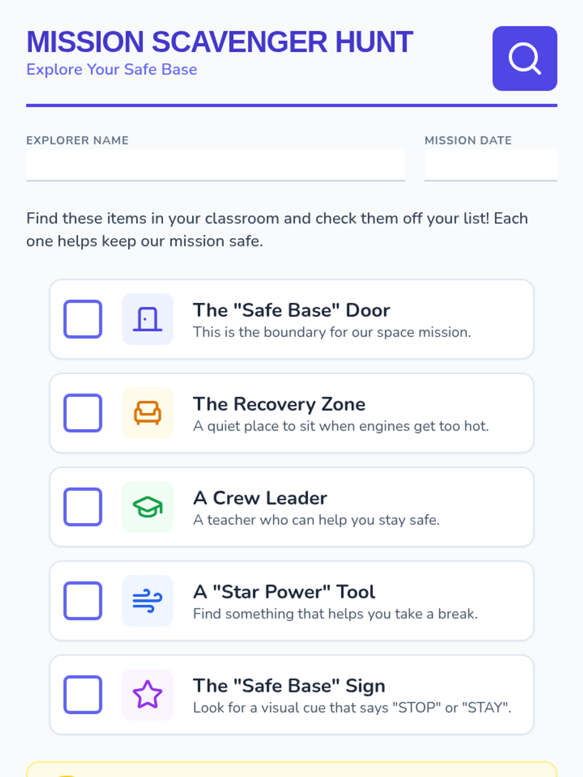 A space-themed social lesson designed for 1st grade students to learn the importance of staying in the classroom and managing big emotions through a social story, choice board, and scavenger hunt.