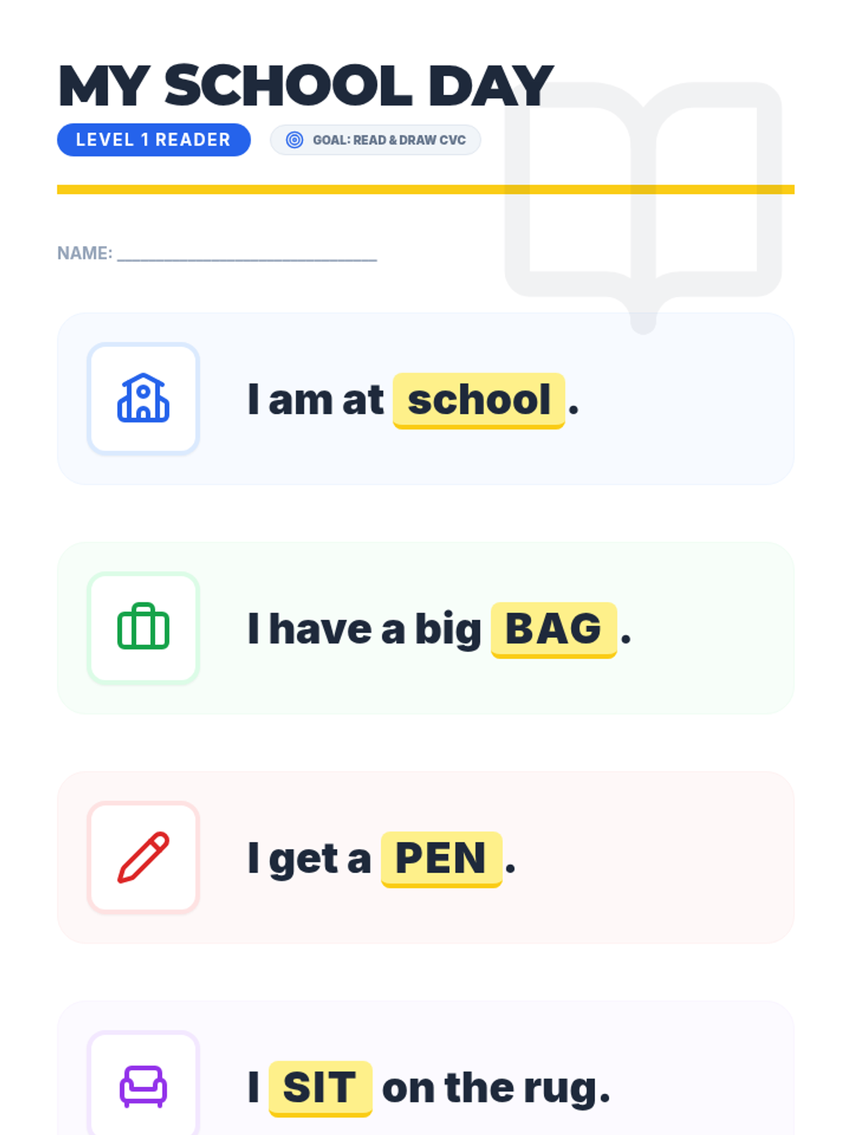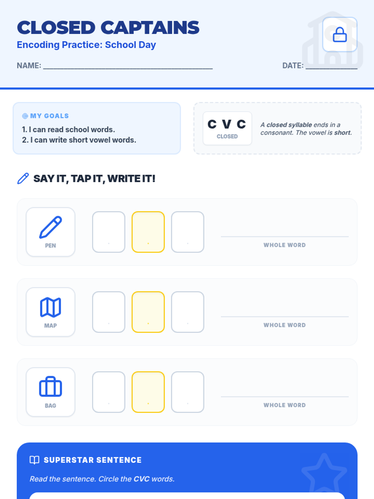 Introduction to closed syllables (CVC) using school-related vocabulary. Students will practice identifying, encoding, and reading short vowel words in simple sentences.