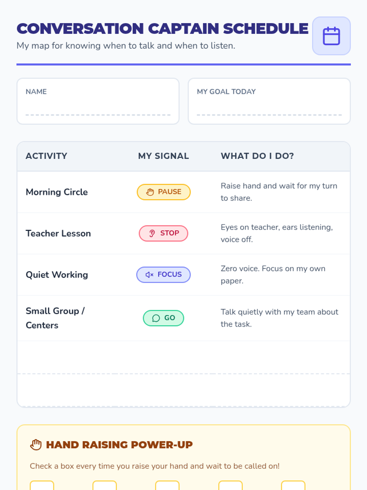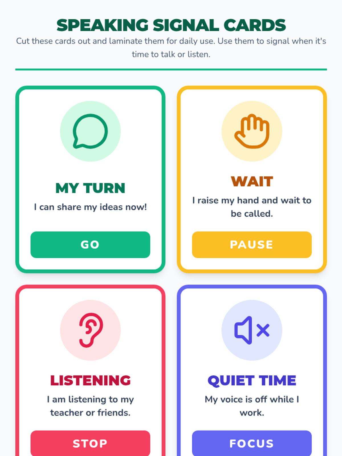 A set of visual tools and strategies designed to help students manage verbal impulses, understand conversational turn-taking, and recognize appropriate times for speaking and listening.