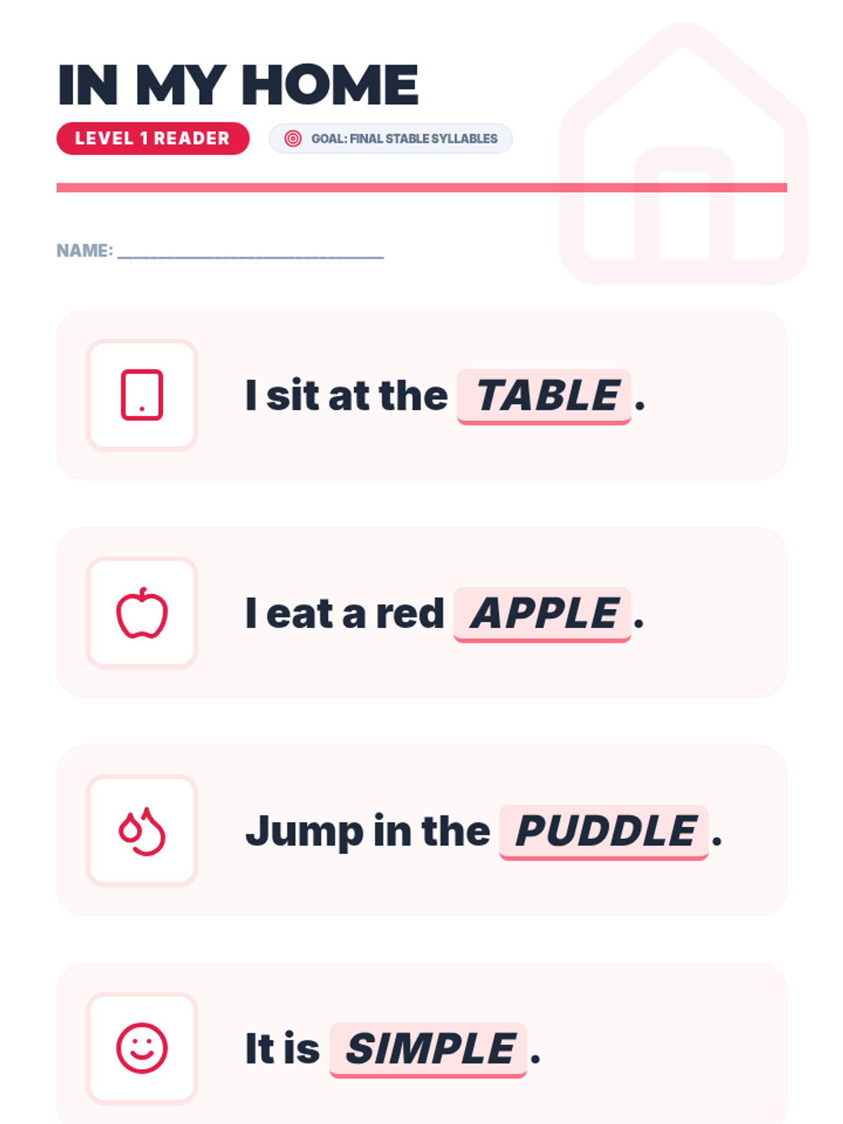 Introducing final stable syllables (consonant + le) through daily routines and home-related words. Focus on the 'ble', 'cle', 'dle' patterns.