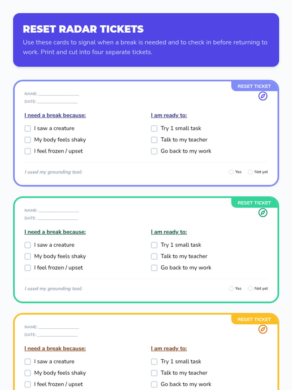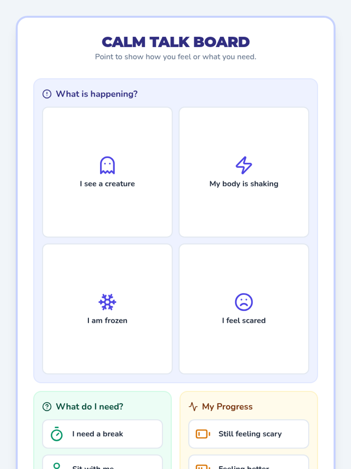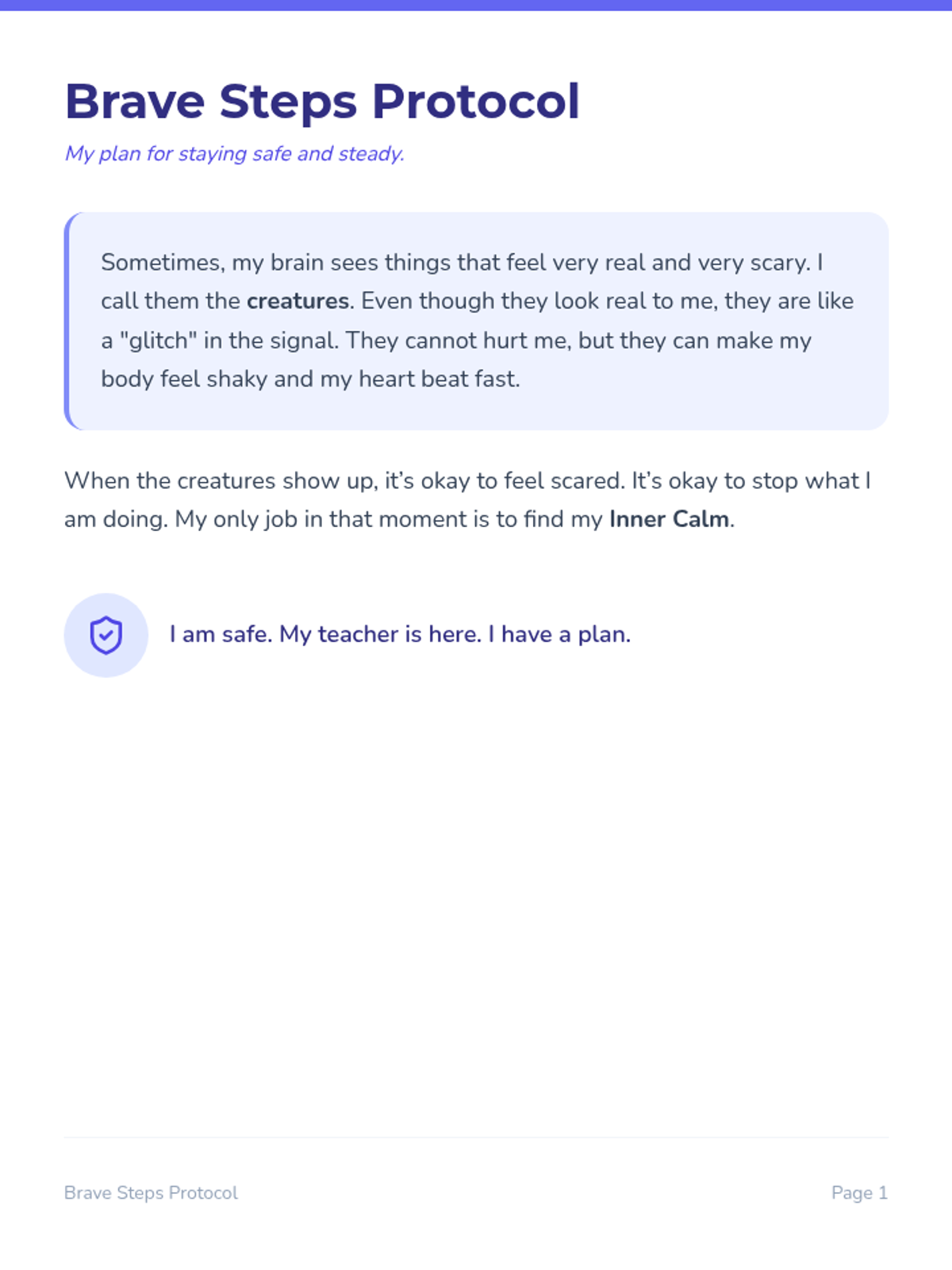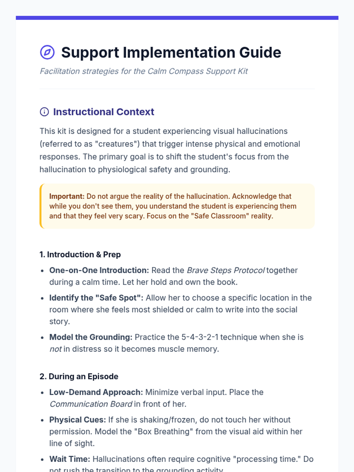 A comprehensive toolkit designed to support a student experiencing visual hallucinations and intense emotional distress in the classroom, focusing on grounding, communication, and self-regulation.