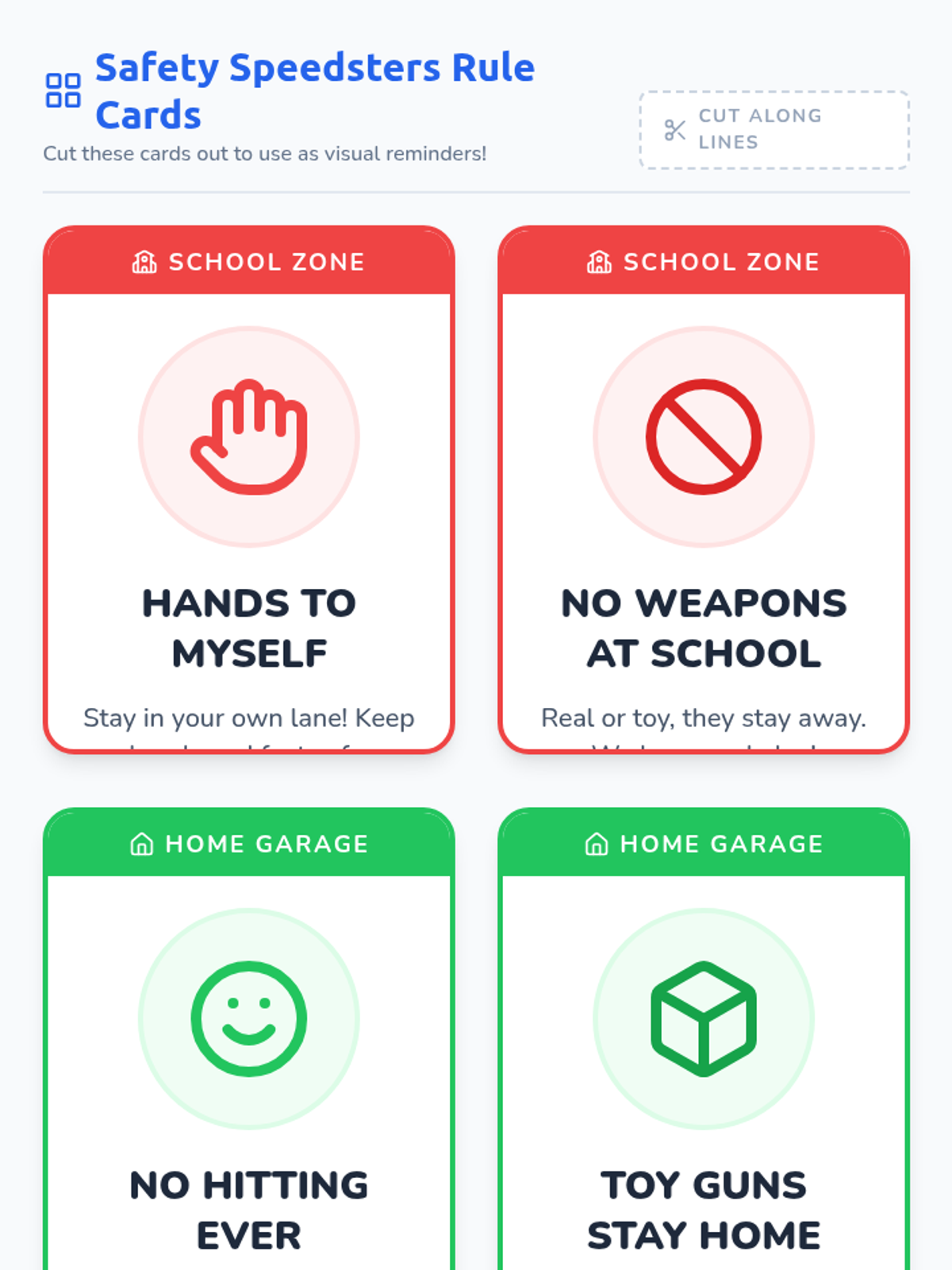A social story and visual aids using vehicle-themed visuals to teach students the difference between rules at home and school regarding fighting and weapons.