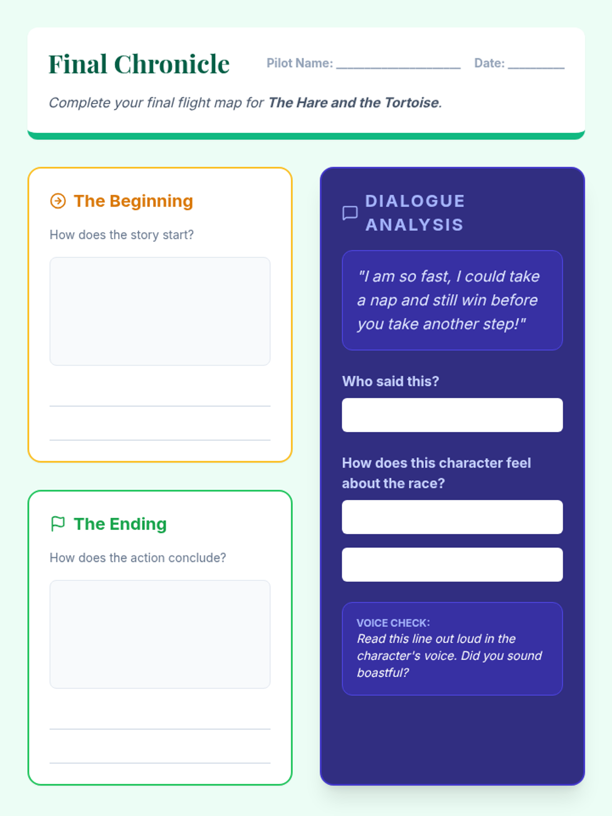 Students integrate structure and dialogue skills to explain how a character's words reveal their perspective at different points in a story. Uses 'The Hare and the Tortoise' as the anchor text.