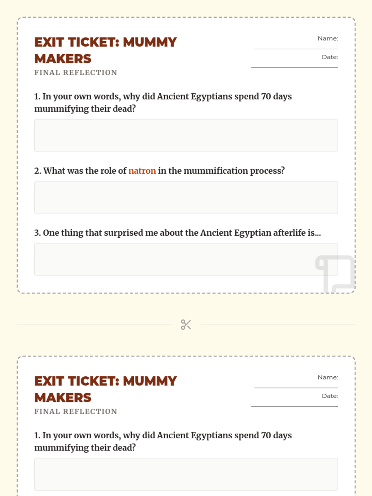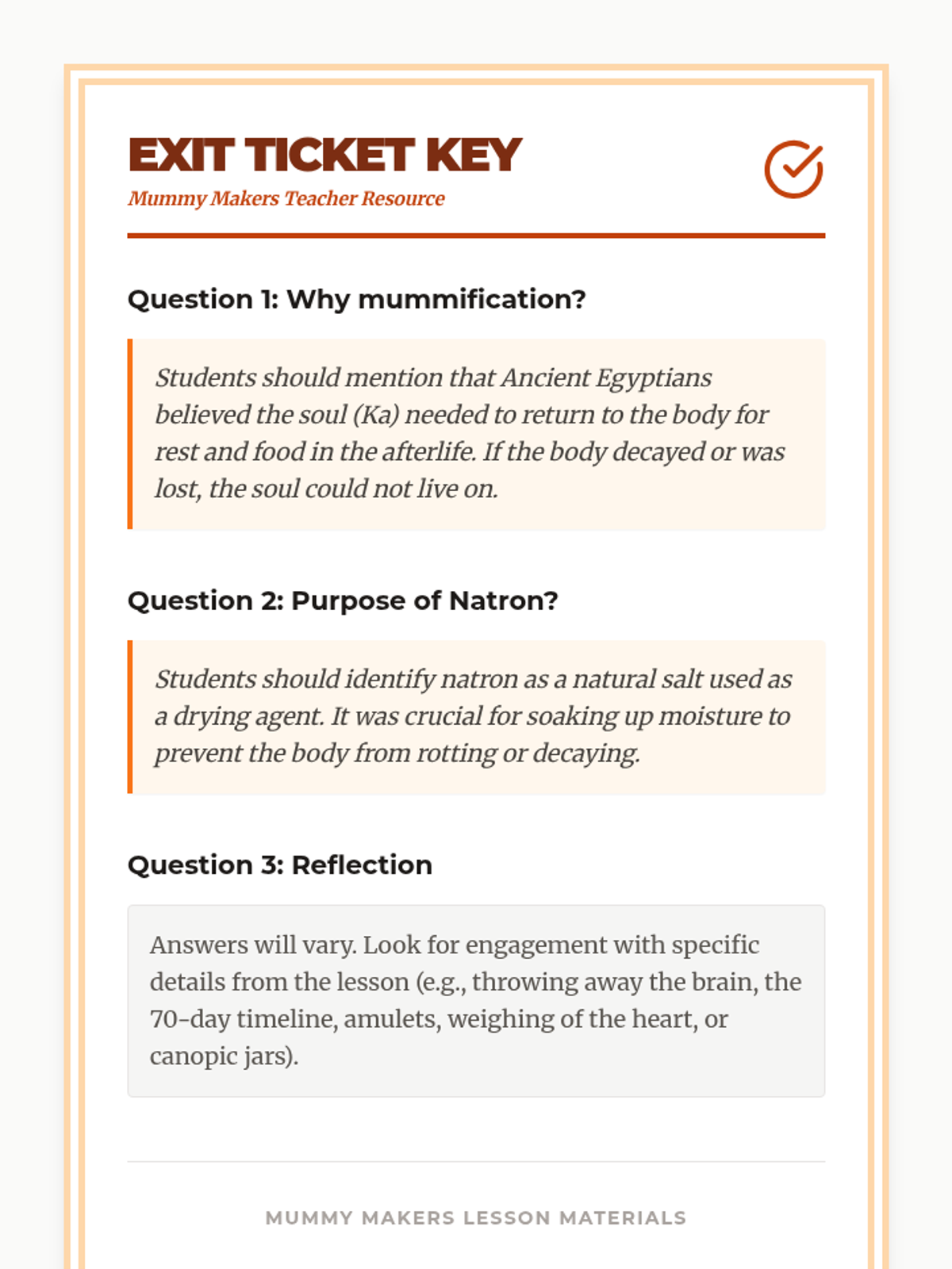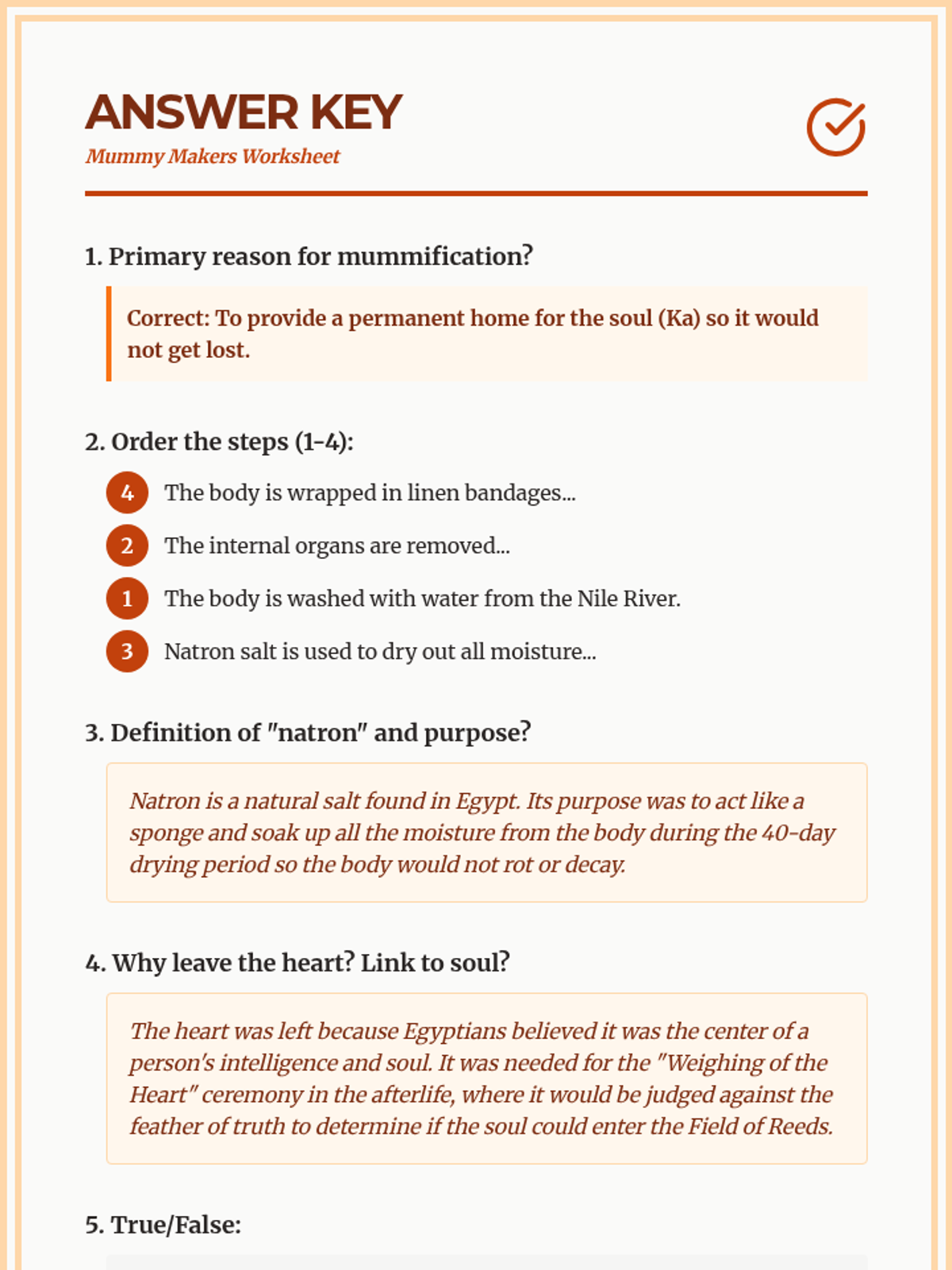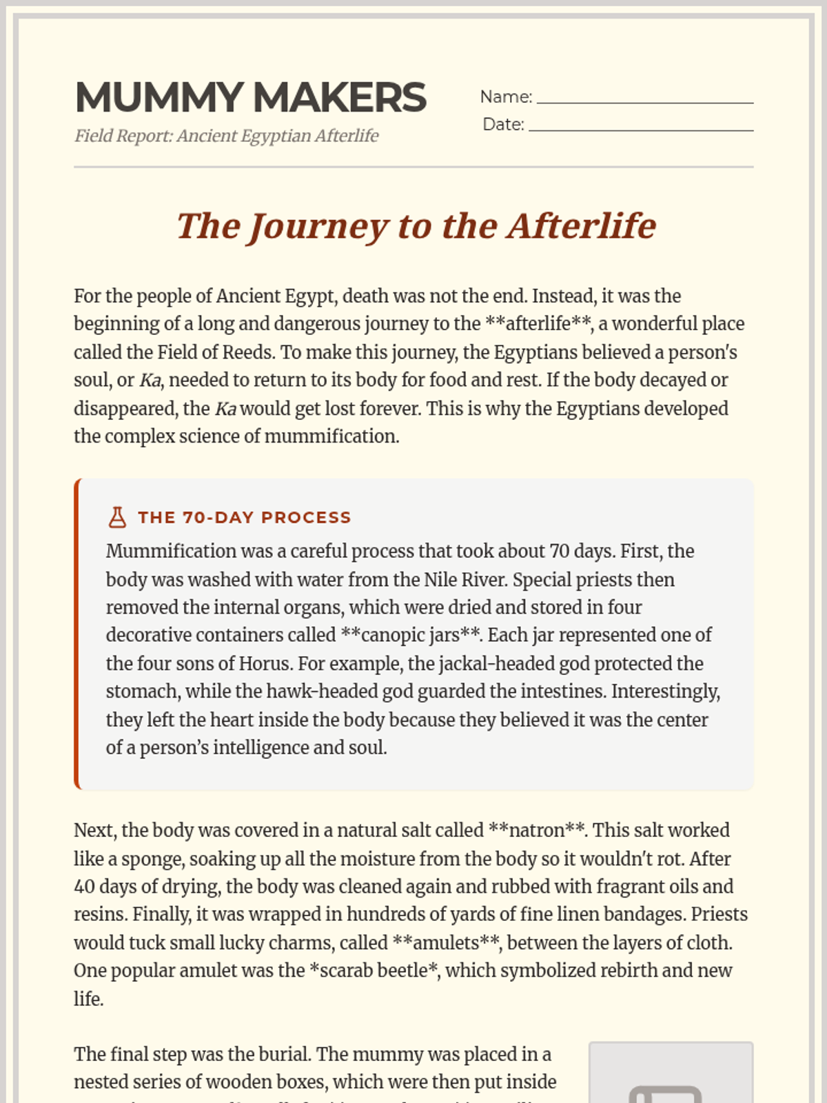 A comprehensive lesson exploring the spiritual beliefs and scientific processes behind Ancient Egyptian mummification, designed for 5th-grade learners.