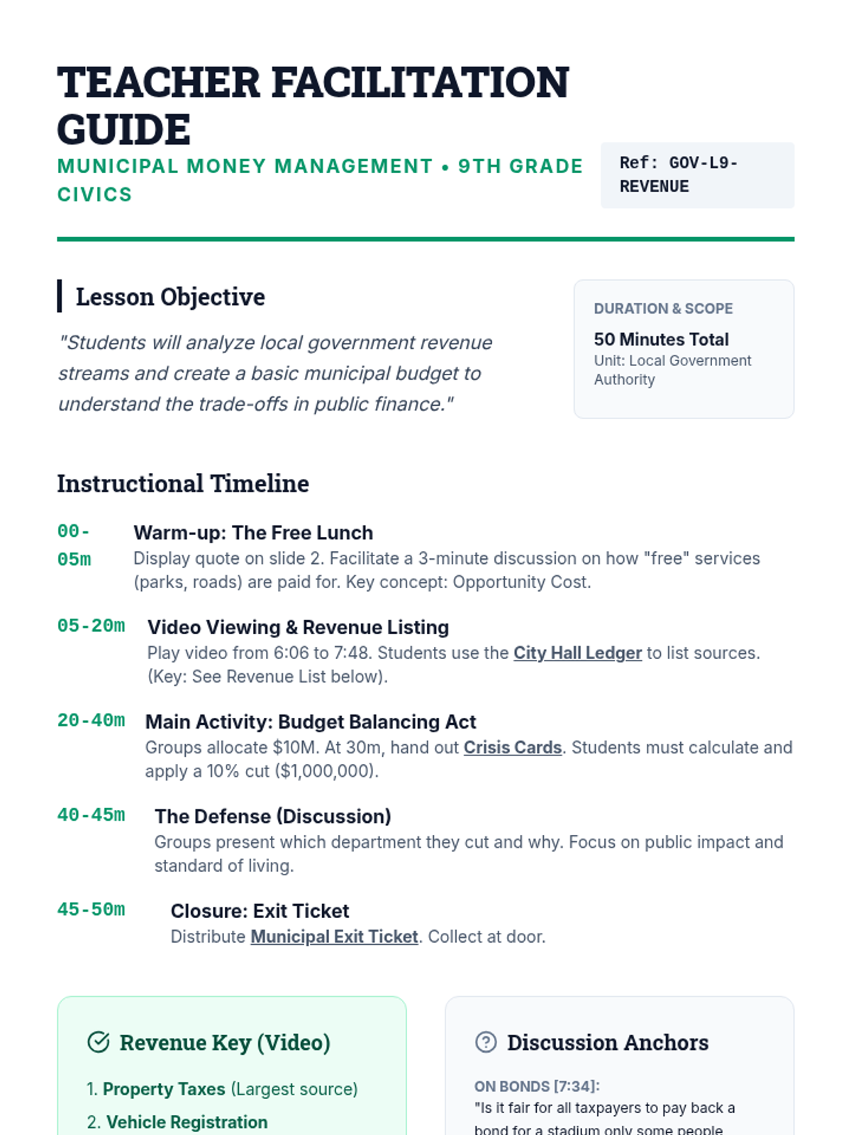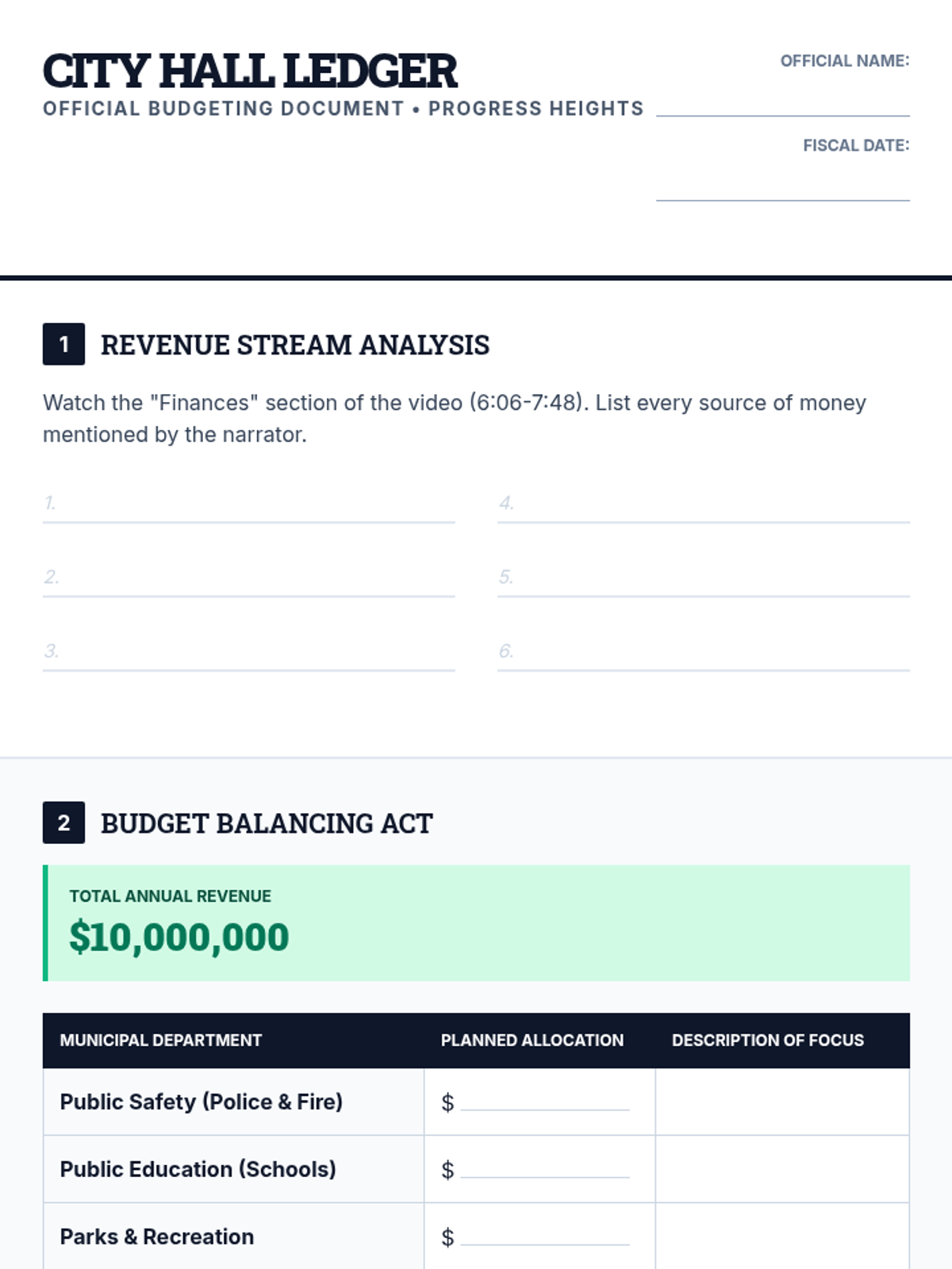 Students will explore how local governments fund their operations, identify specific revenue streams like property taxes and grants, and engage in a hands-on municipal budgeting simulation where they must navigate a financial crisis.