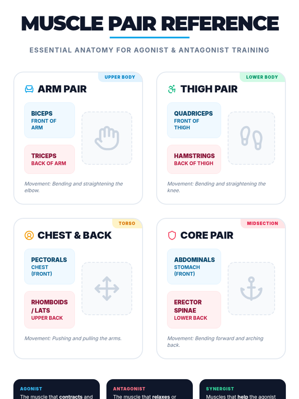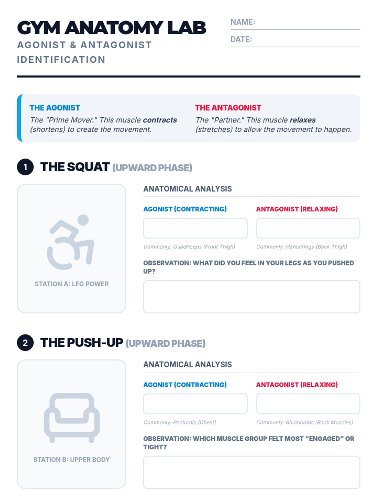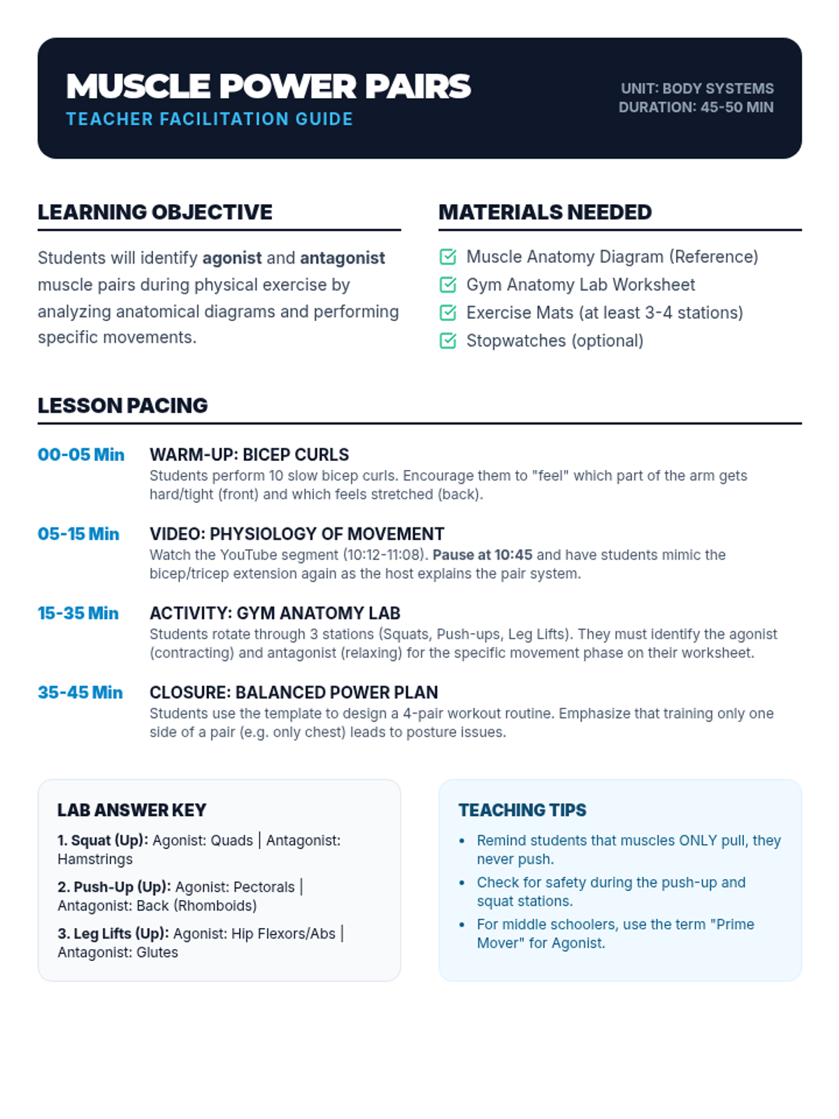 A physical education and health lesson where students investigate how muscles work in pairs (agonists and antagonists) through physical movement and anatomical analysis.