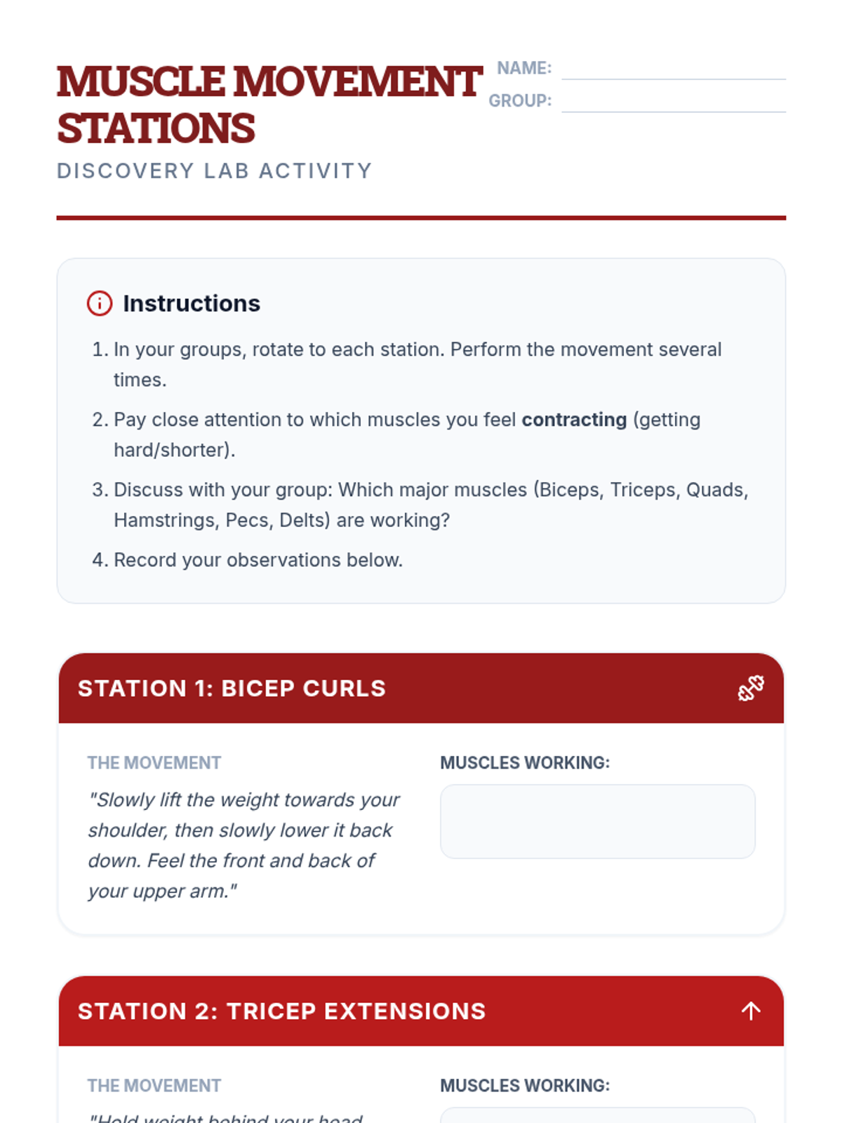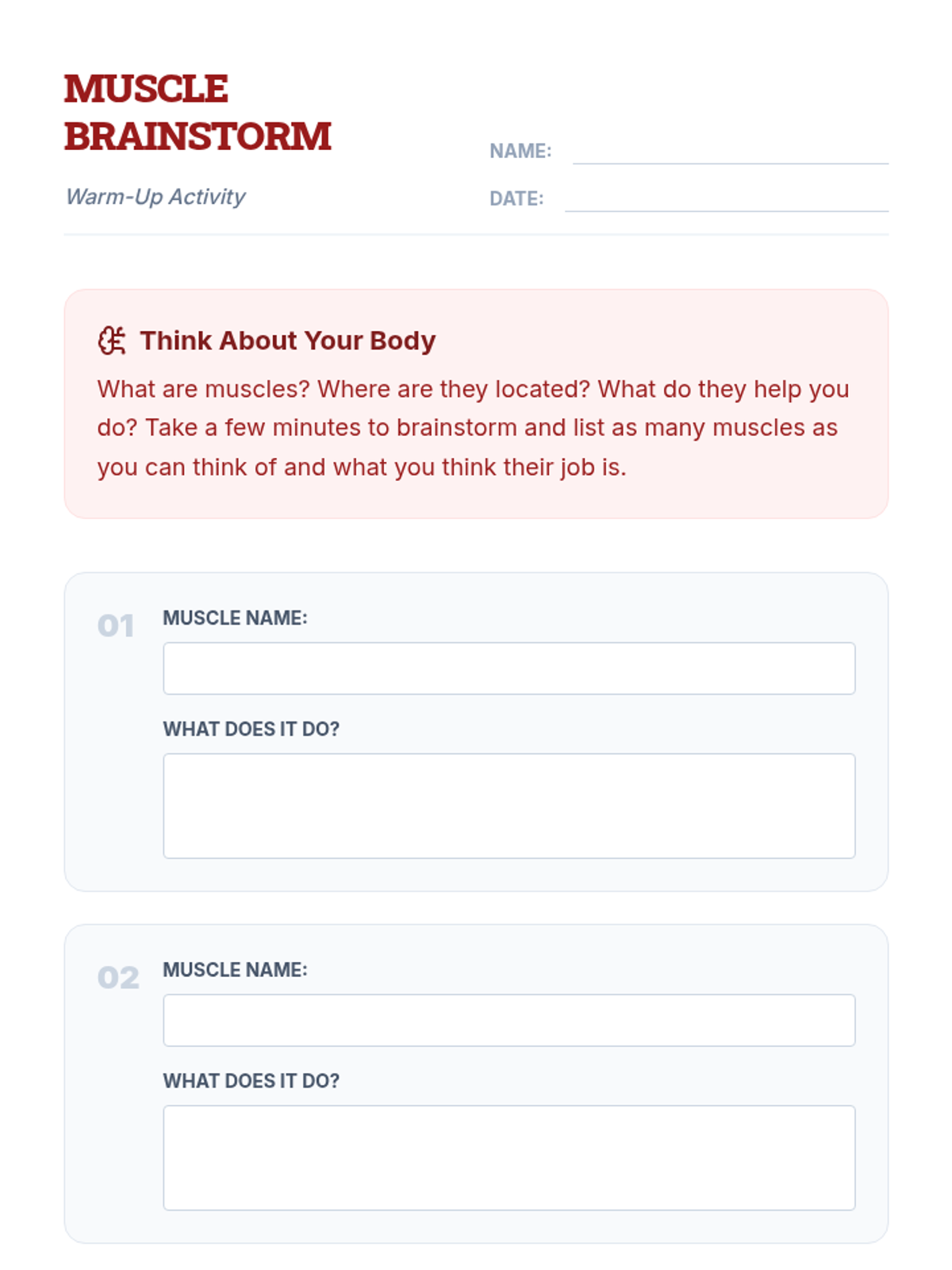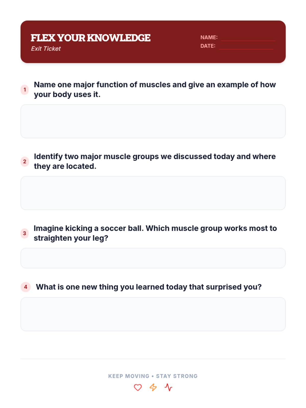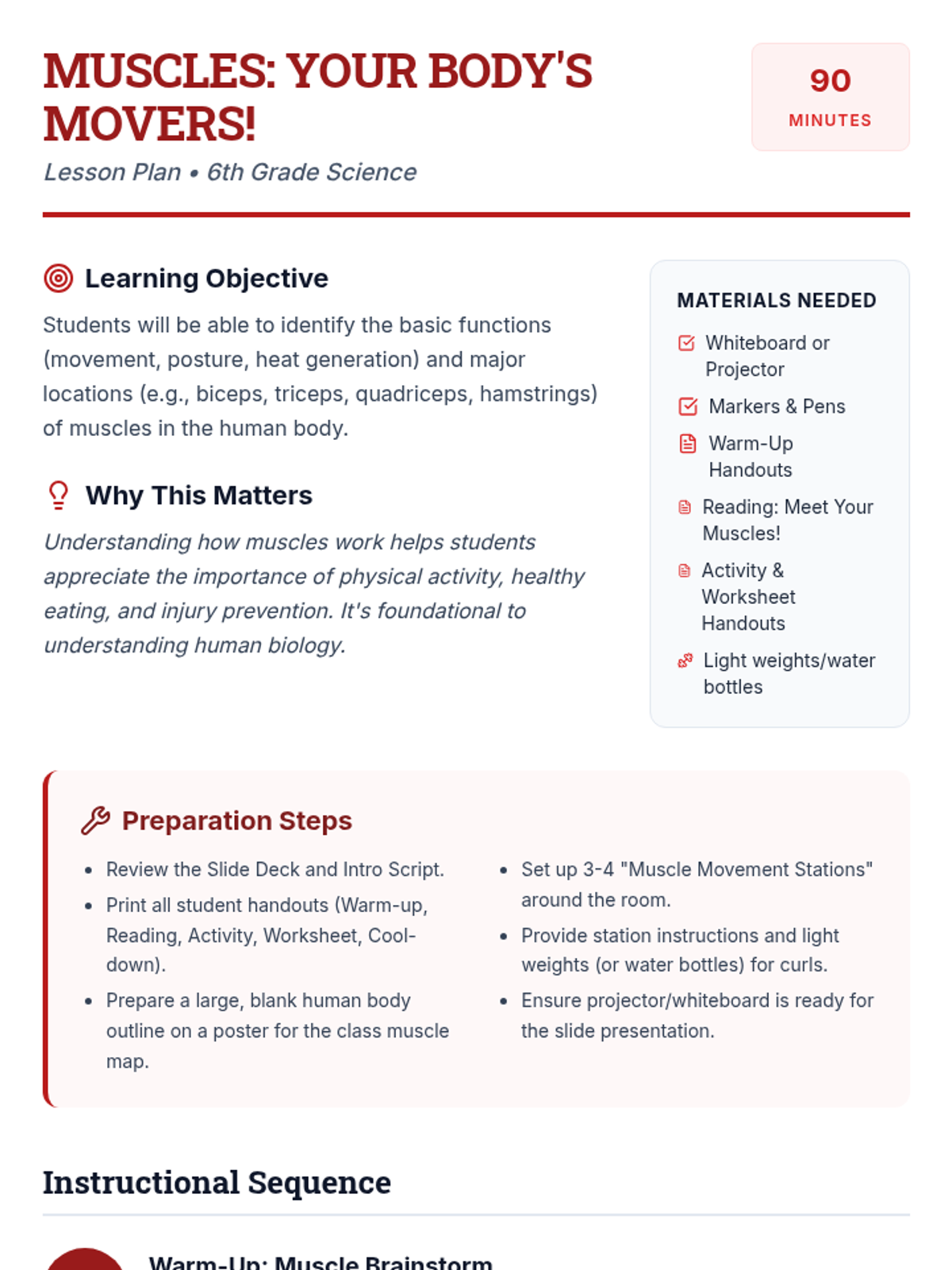 This lesson introduces 6th-grade students to the functions and locations of major muscles. Through interactive movement stations and guided reading, students explore how muscles enable movement, maintain posture, and generate body heat.