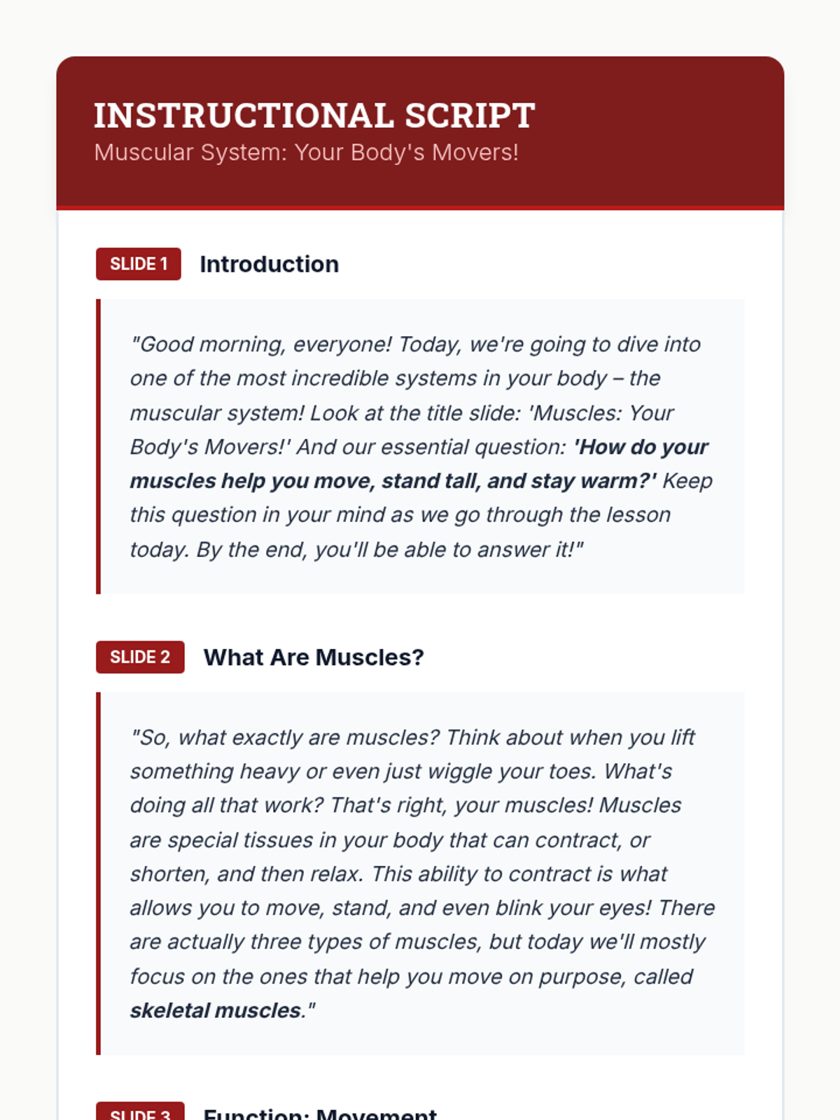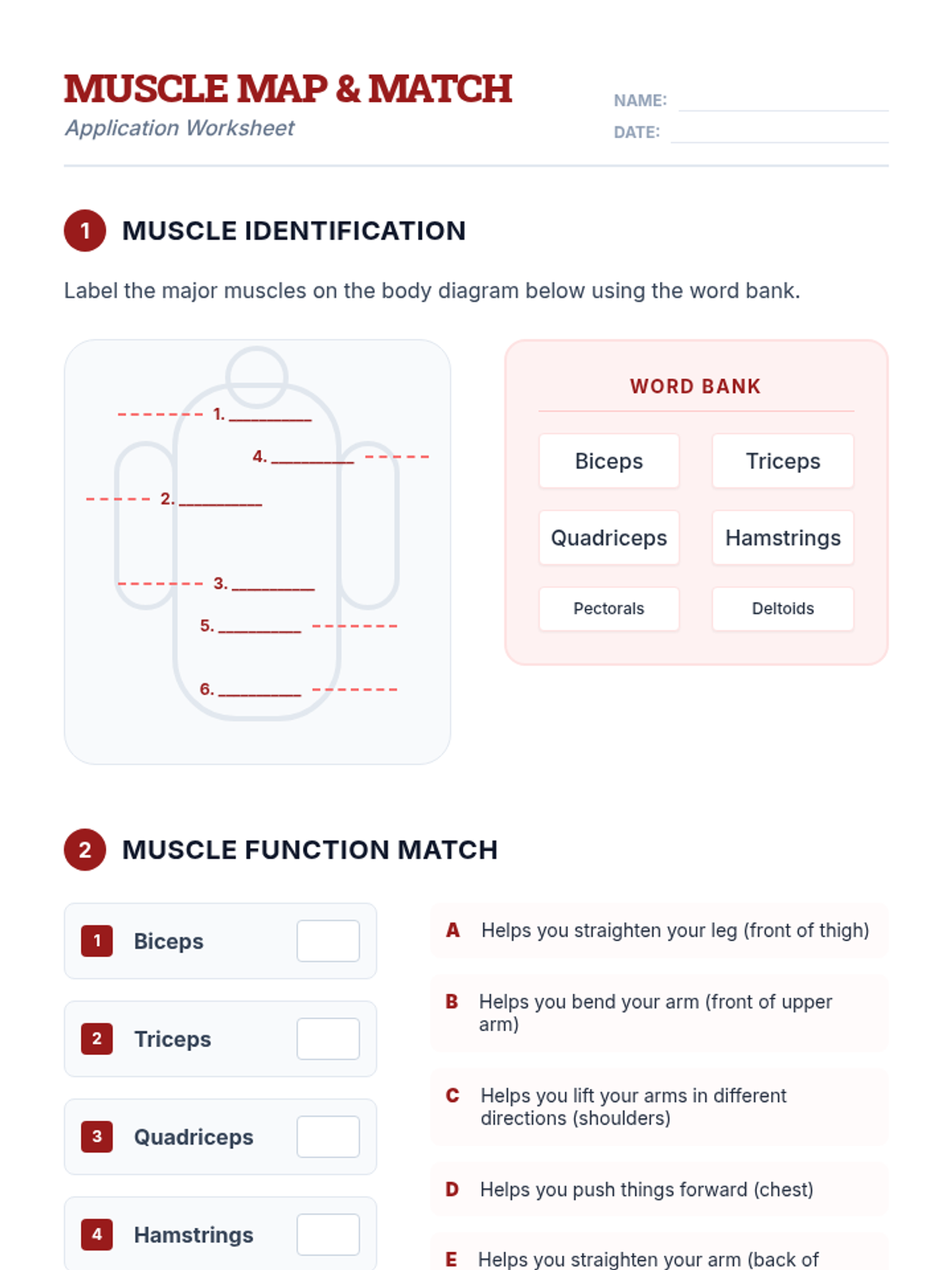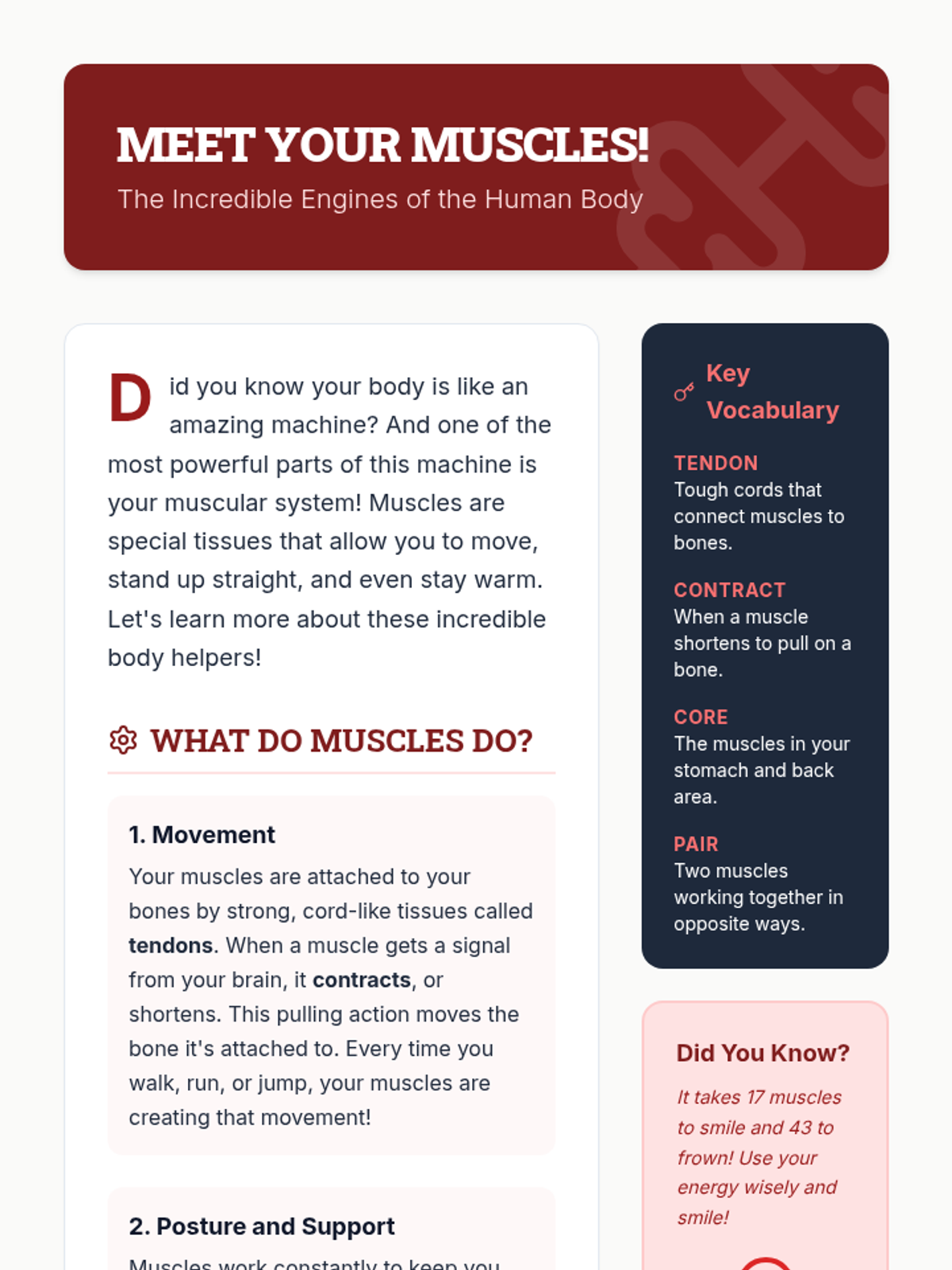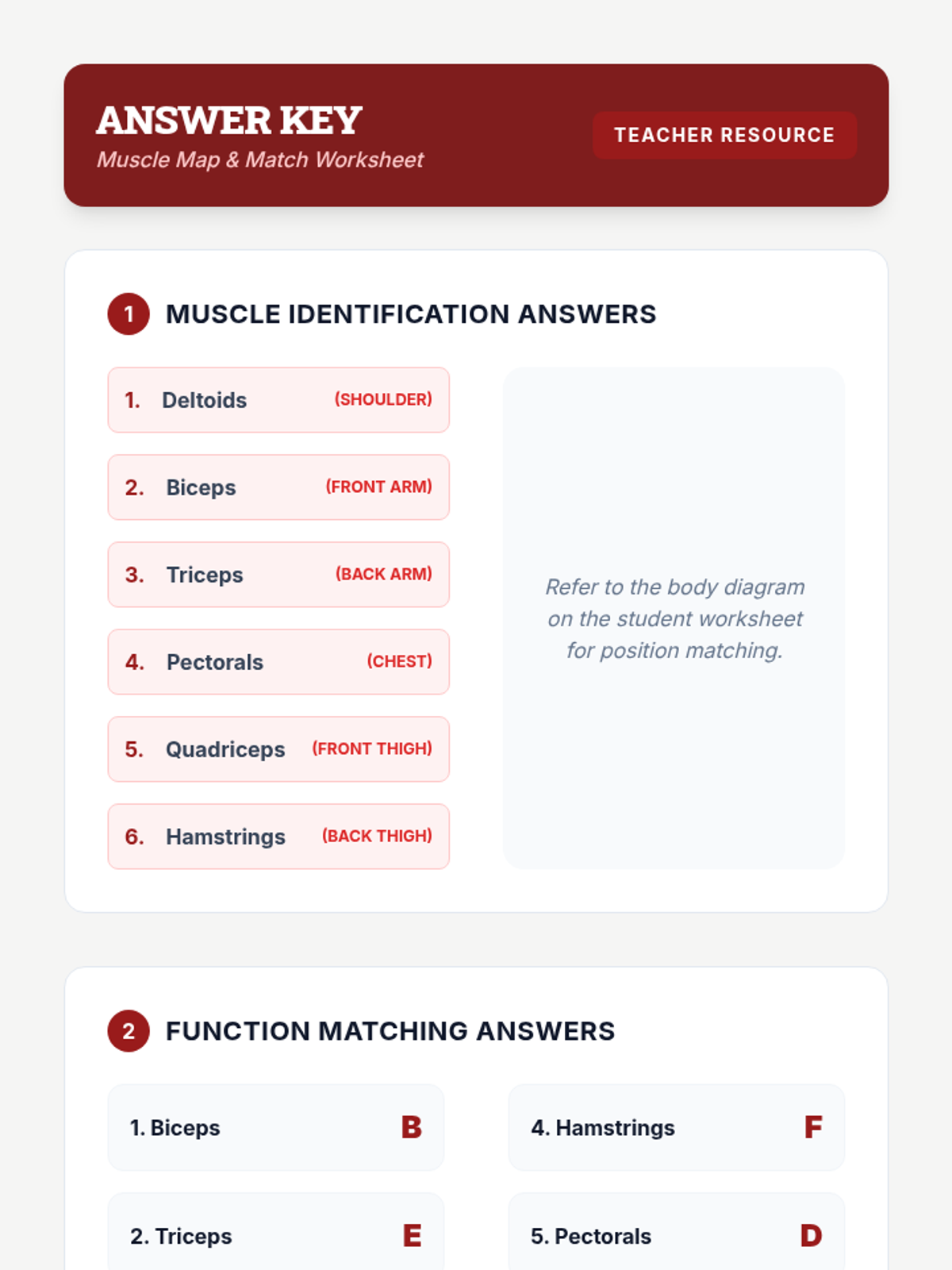 This lesson introduces 6th-grade students to the functions and locations of major muscles. Through interactive movement stations and guided reading, students explore how muscles enable movement, maintain posture, and generate body heat.
