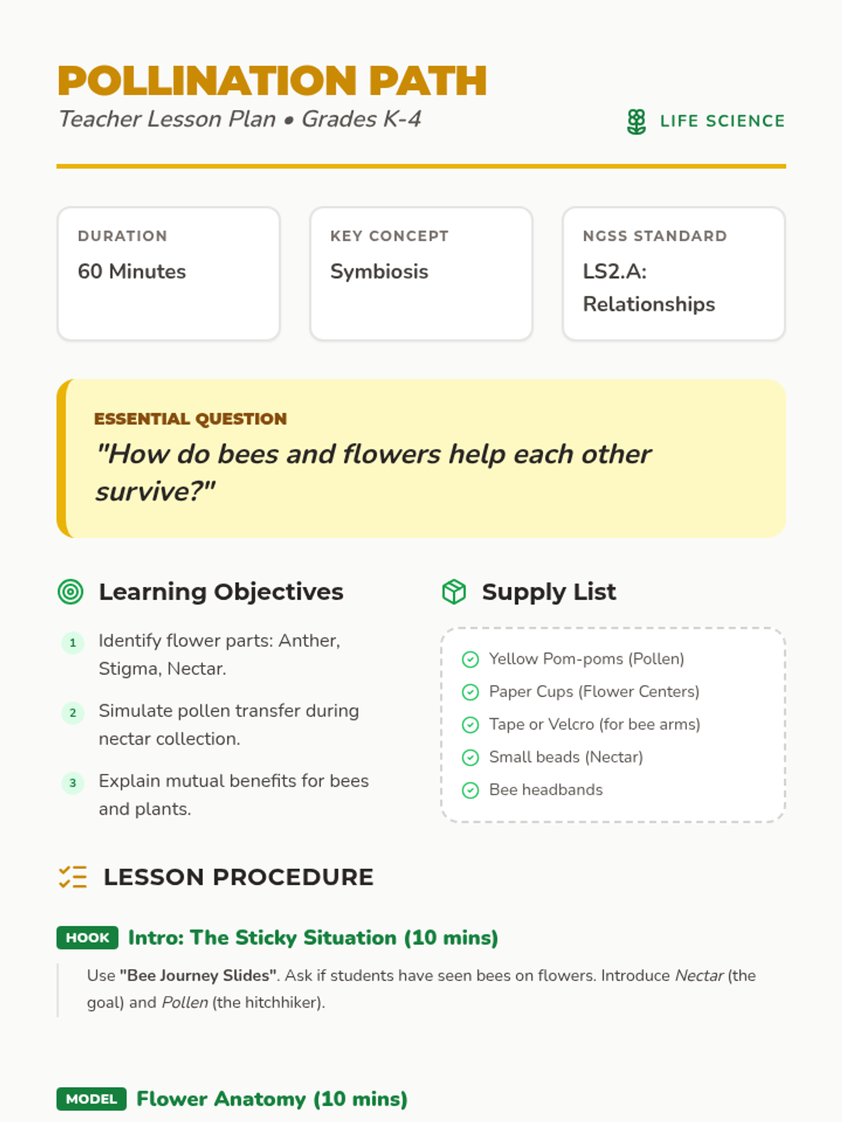 A hands-on inquiry into the vital role of pollinators in the Indiana ecosystem. Students explore local species, simulate the pollination process, and record their findings in a field journal.