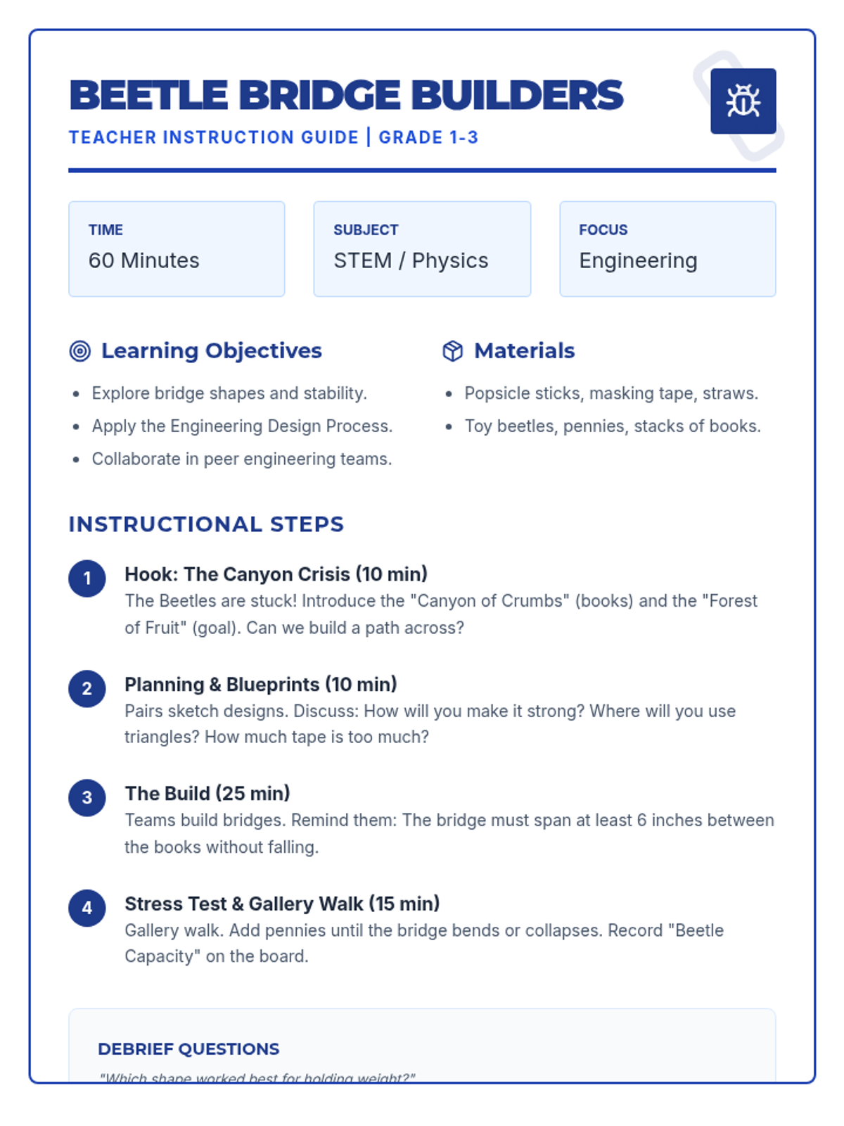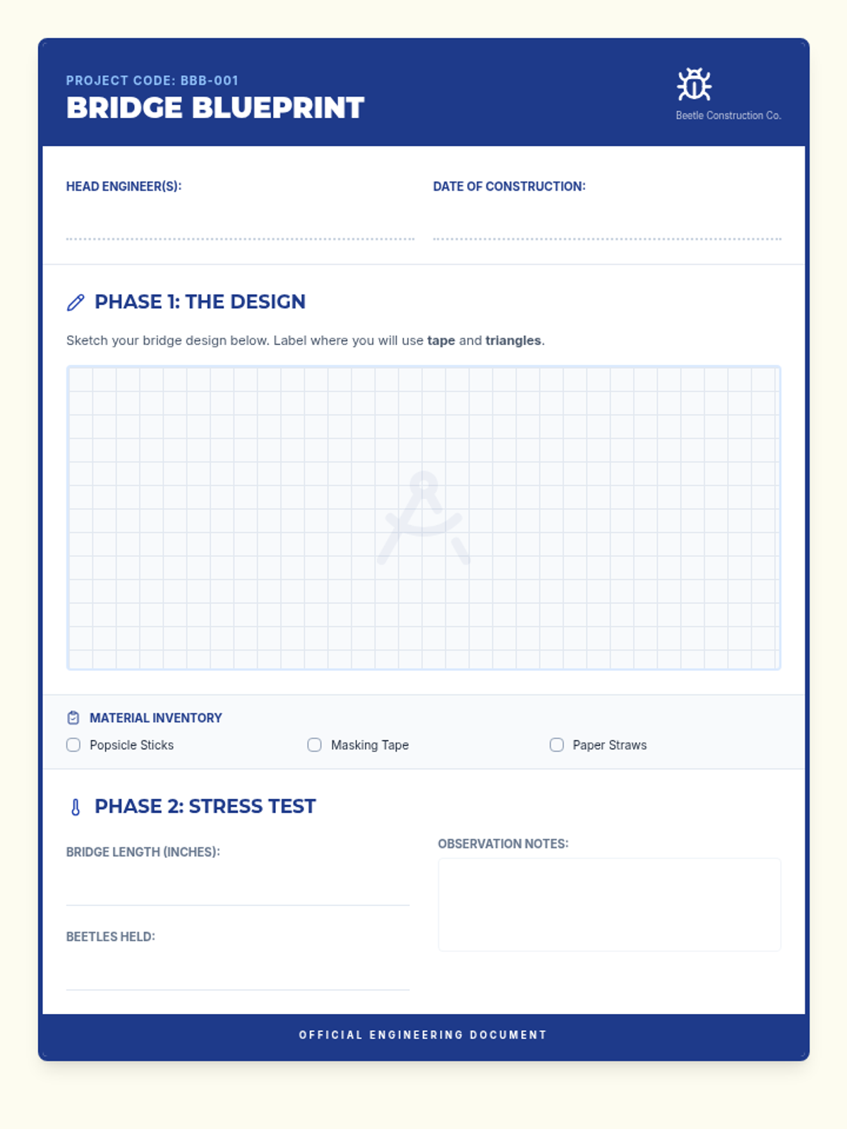 Students step into the roles of junior engineers to design, build, and test bridges for toy insects, exploring structural integrity and the engineering design process.