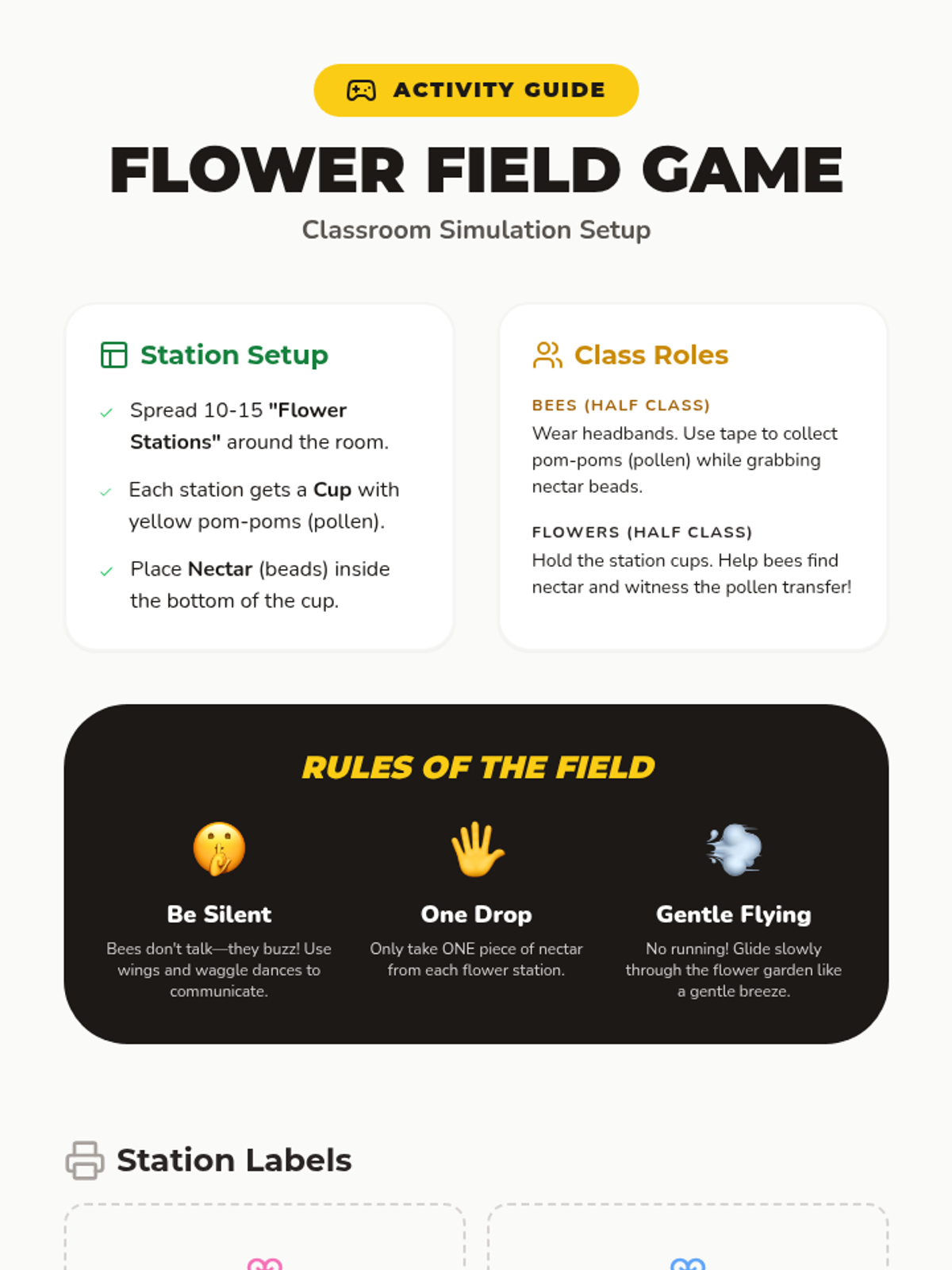 Students simulate the pollination process through a high-energy movement game, learning about the symbiotic relationship between bees and flowers and its importance to our food system.