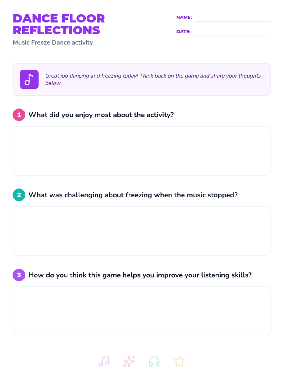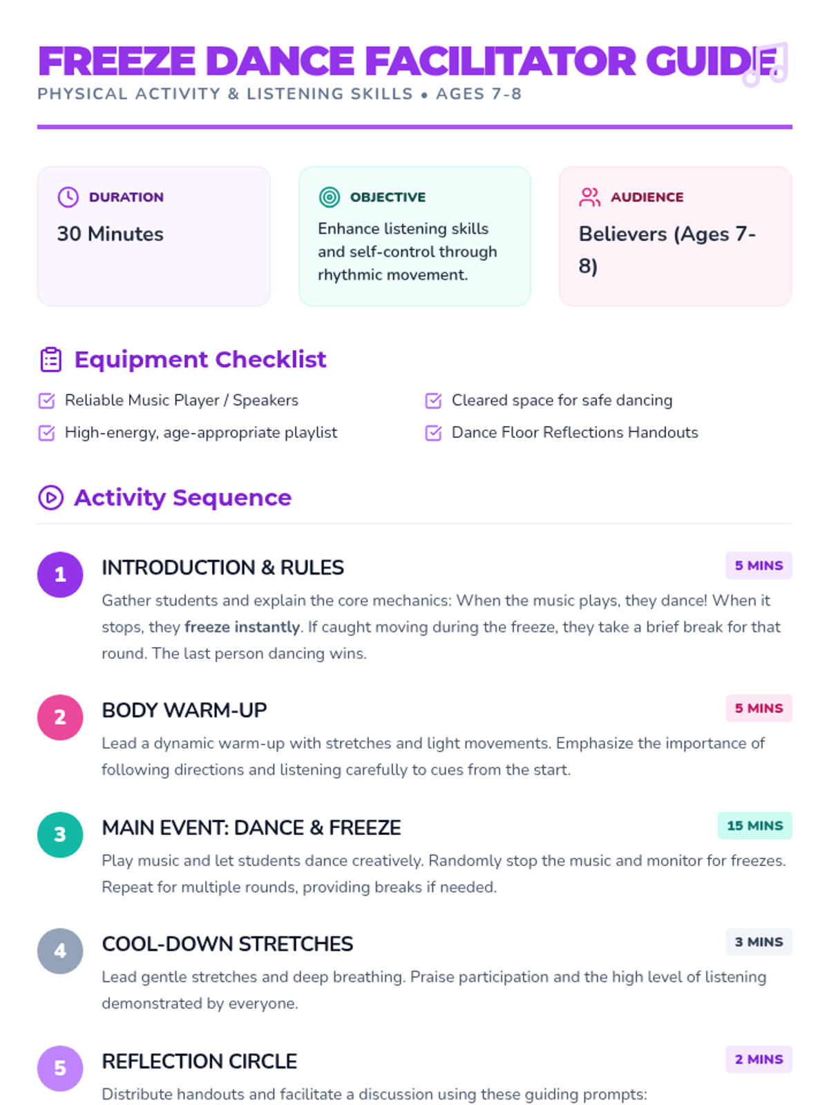 An energetic physical activity lesson where students practice self-control and listening skills through a game of Freeze Dance. Students will dance to music and freeze instantly when it stops, followed by a reflective discussion.
