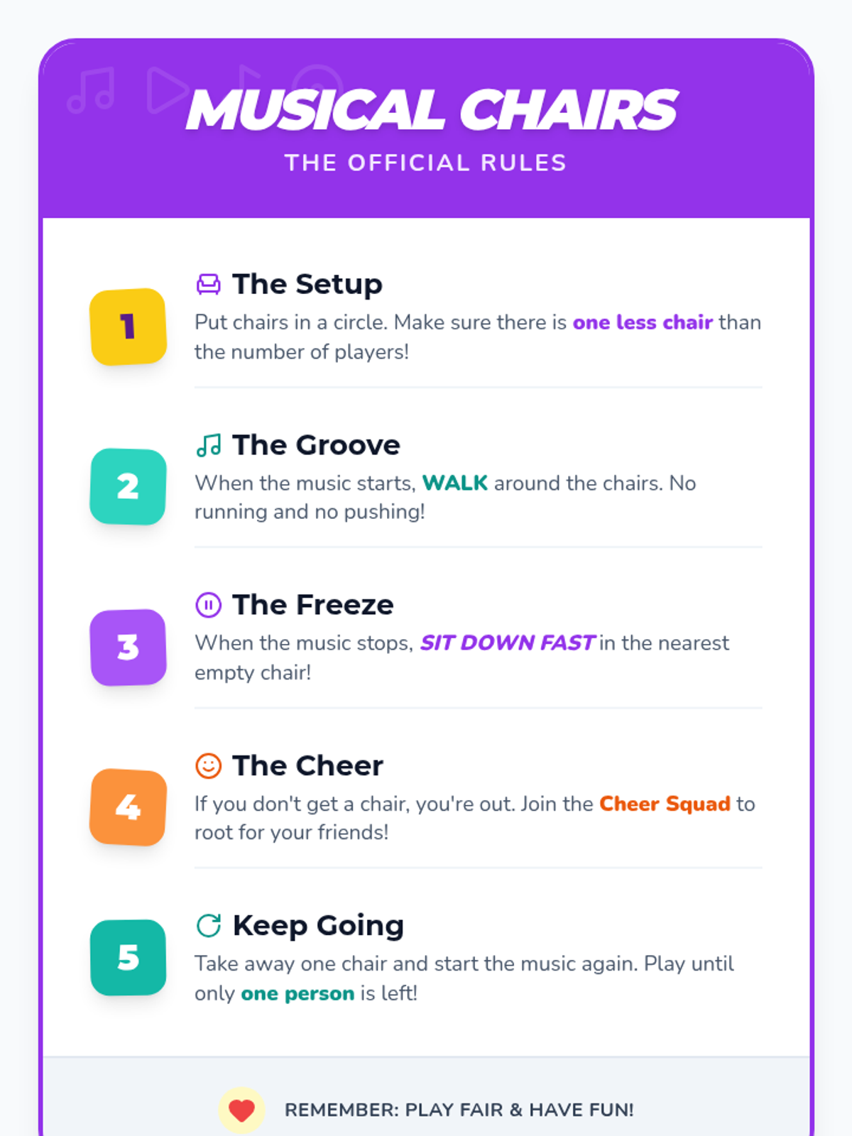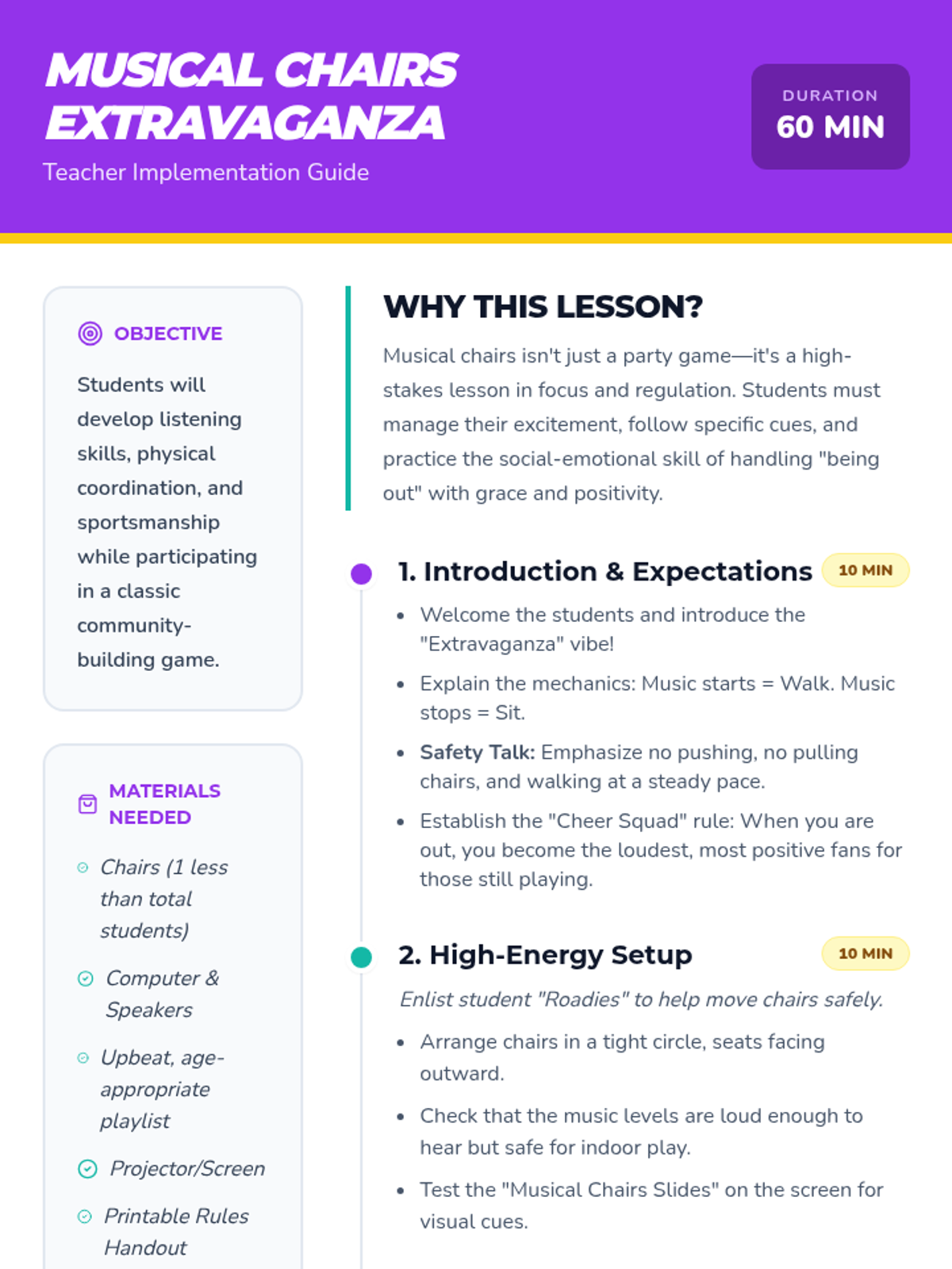 A fun and active lesson focused on physical activity, listening skills, and sportsmanship through the classic game of musical chairs. Students will learn the rules, practice quick decision-making, and reflect on their experiences with winning and losing.
