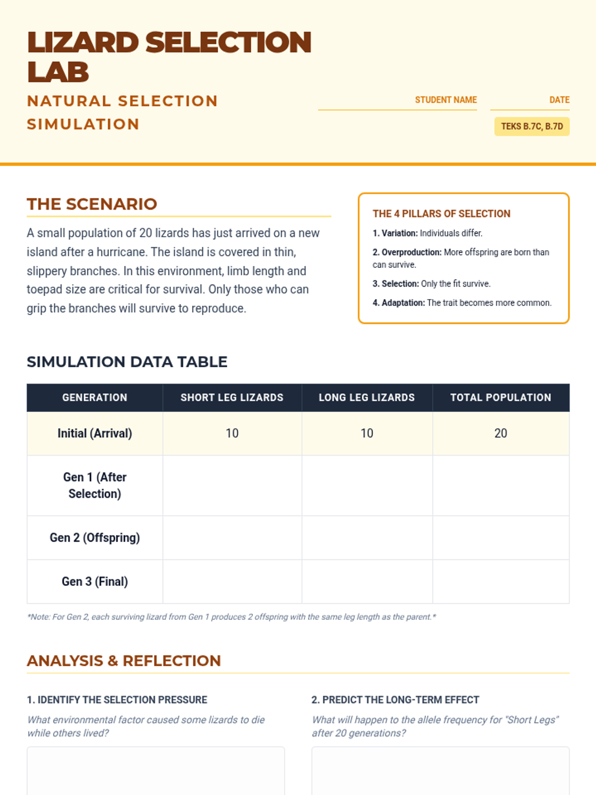 A hands-on simulation where students model genetic mutations and track survival rates across different environmental shifts to understand natural selection.