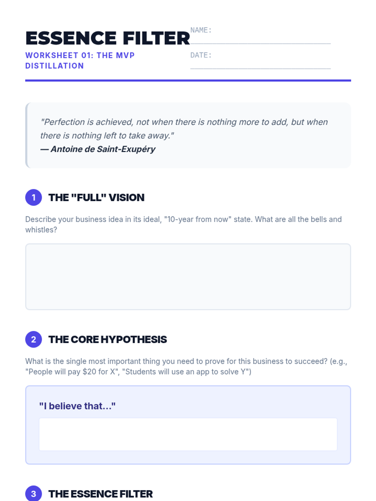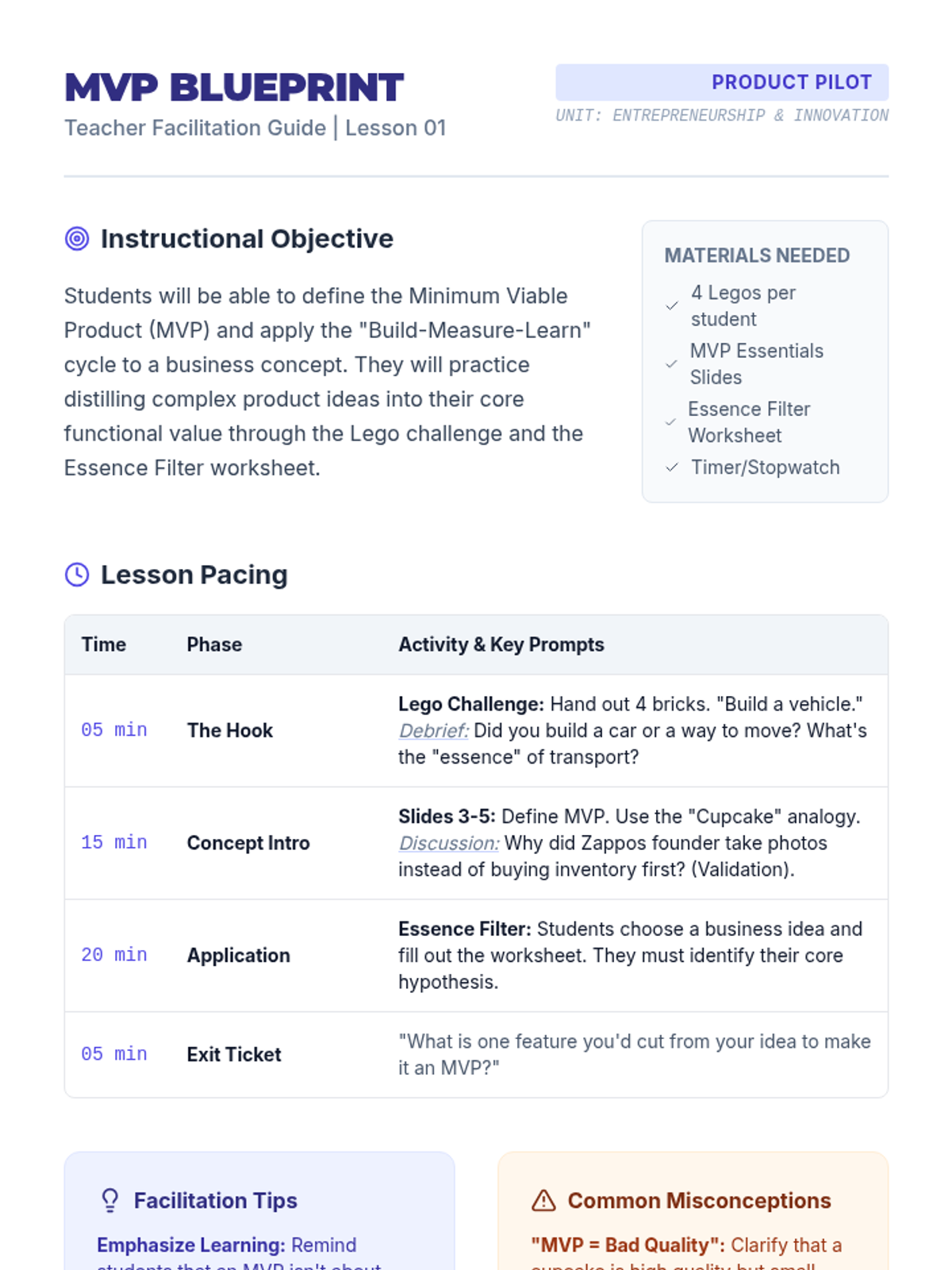 Students define the Minimum Viable Product (MVP) and learn to distinguish between 'features' and 'value'. Includes a LEGO-based hook to demonstrate distilling a concept to its essence.