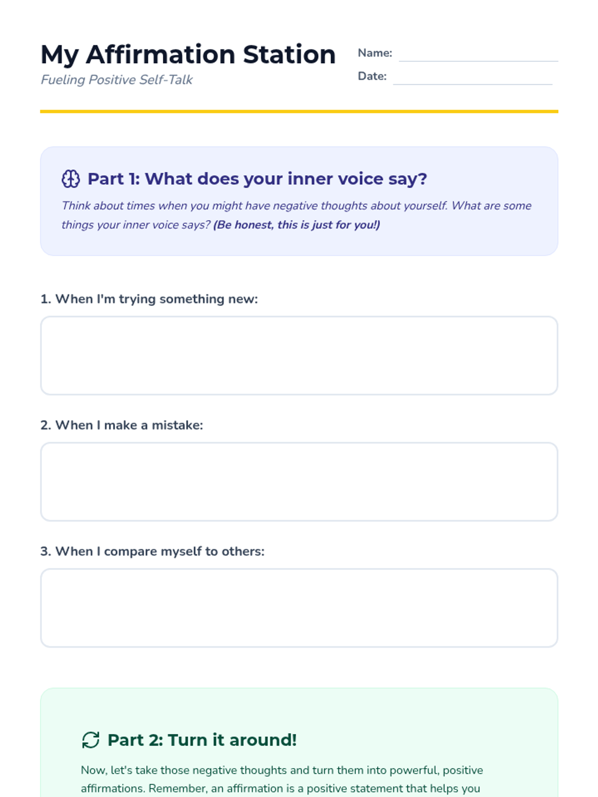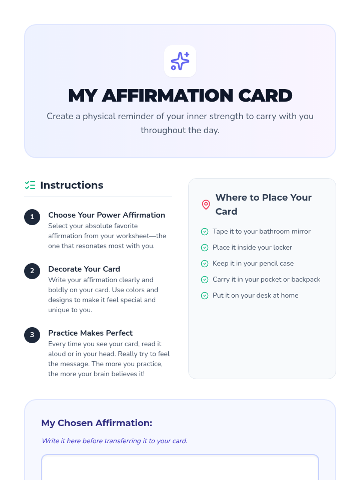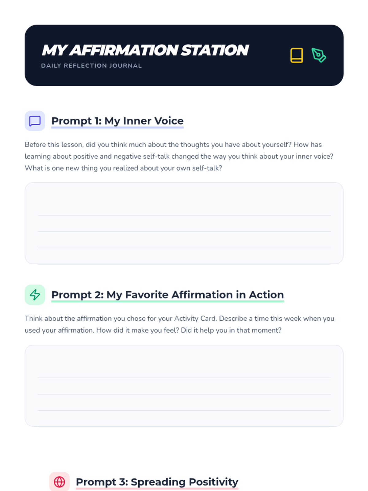 A 45-60 minute lesson for 6th graders to help them recognize negative self-talk and build a more resilient mindset through the practice of positive affirmations.