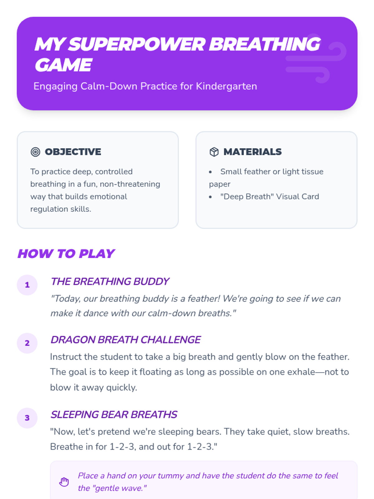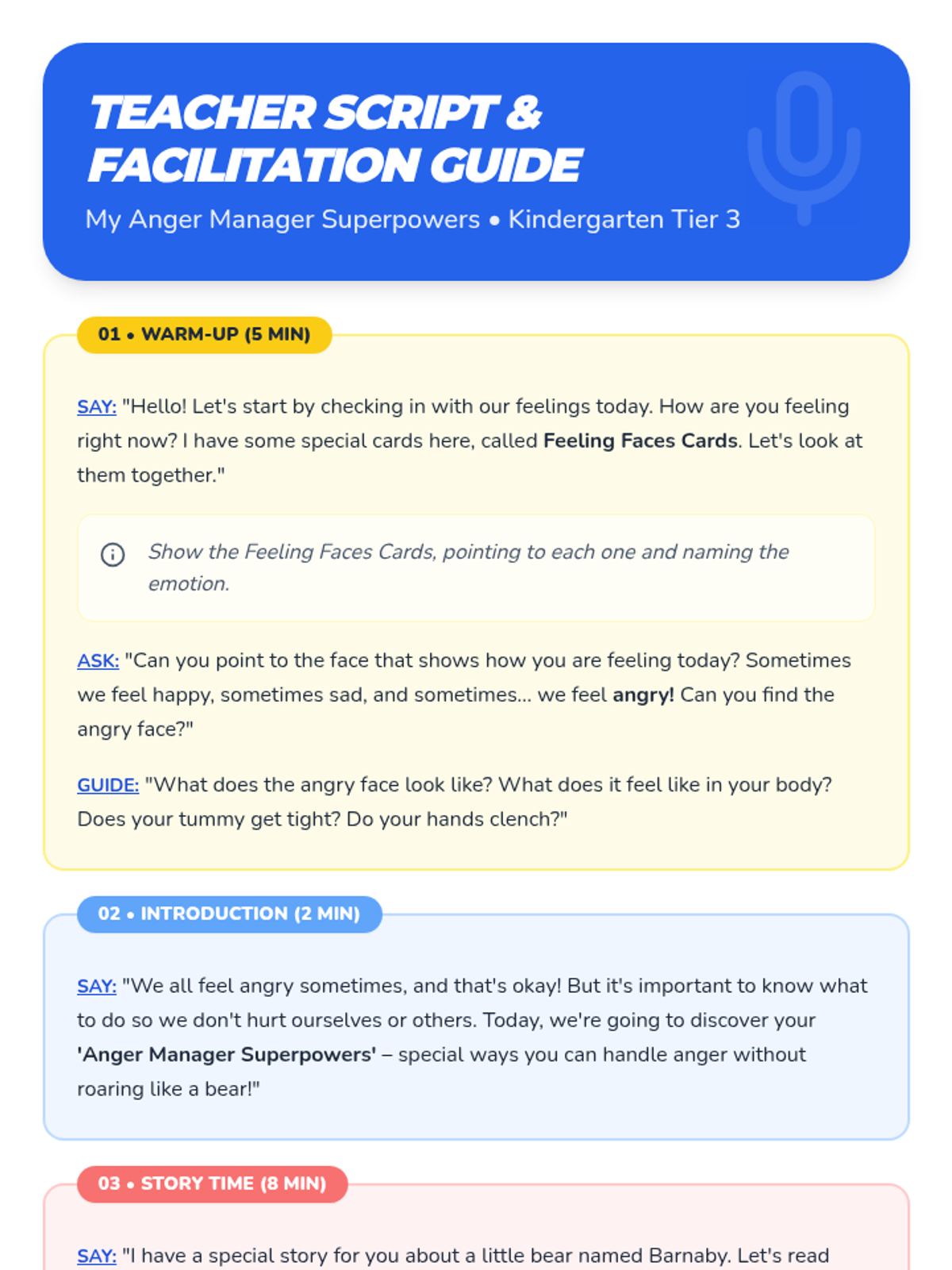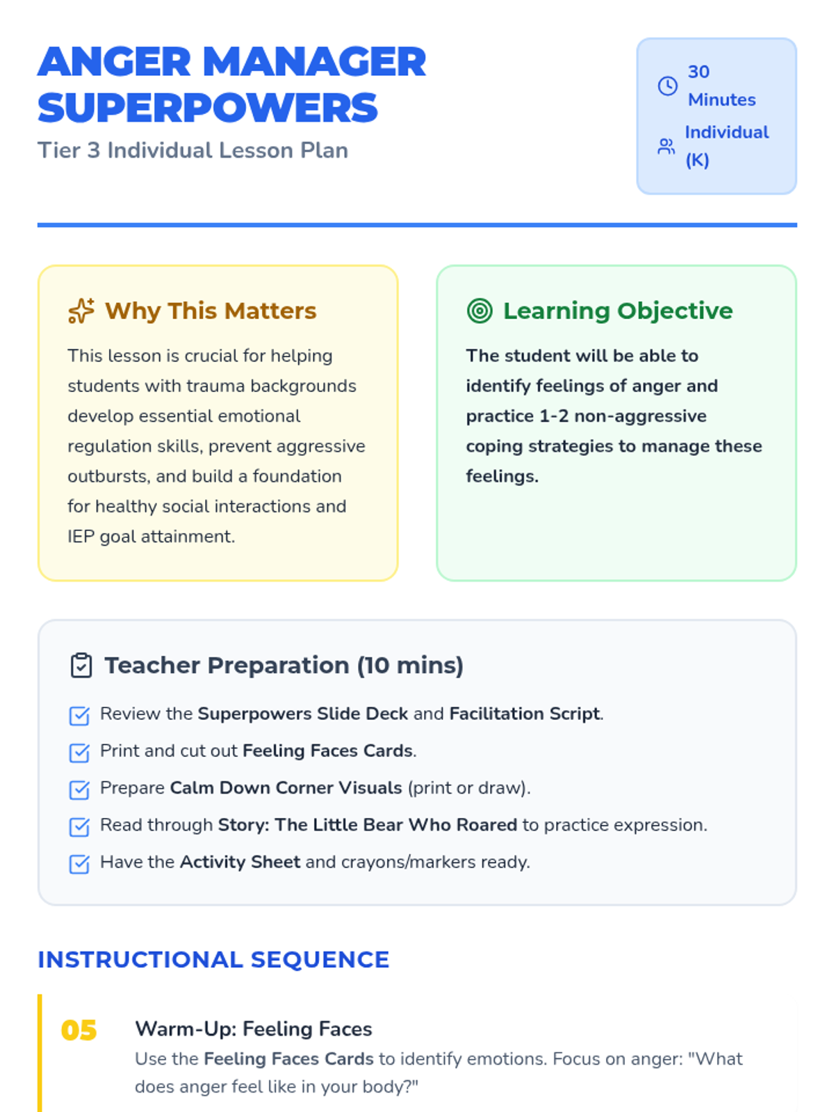 A 30-minute Tier 3 individual lesson for Kindergarten students to learn non-aggressive anger management strategies through storytelling, play, and visual aids. This lesson is trauma-informed and supports speech and social-emotional IEP goals.