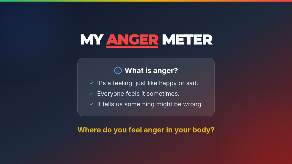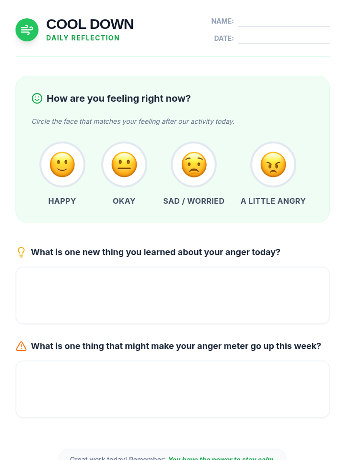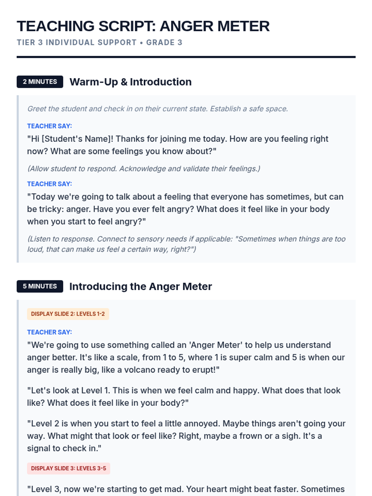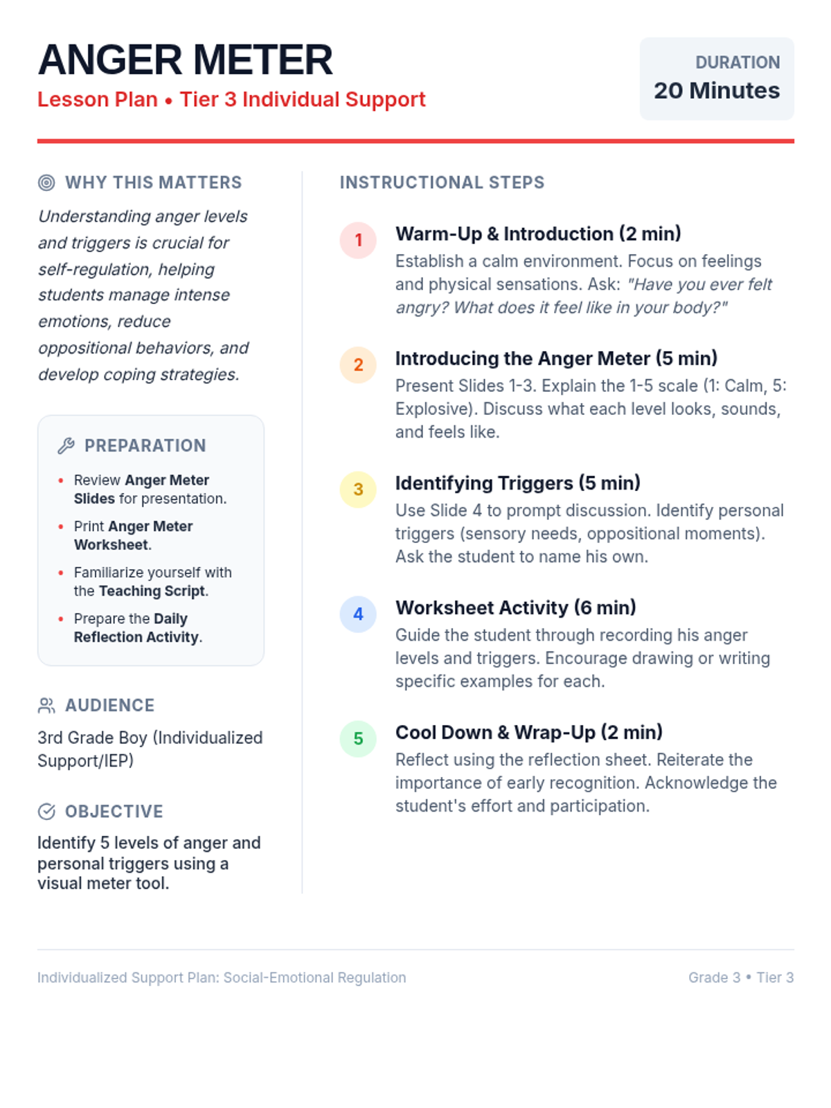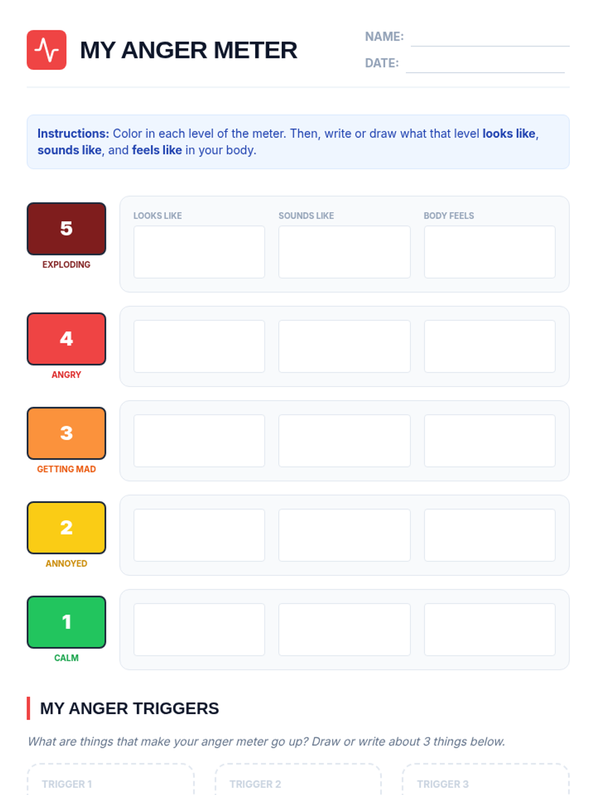 This individualized lesson helps a student identify different levels of anger using a 1-5 meter scale. It focuses on identifying physical signs, behavioral cues, and personal triggers to improve self-regulation.