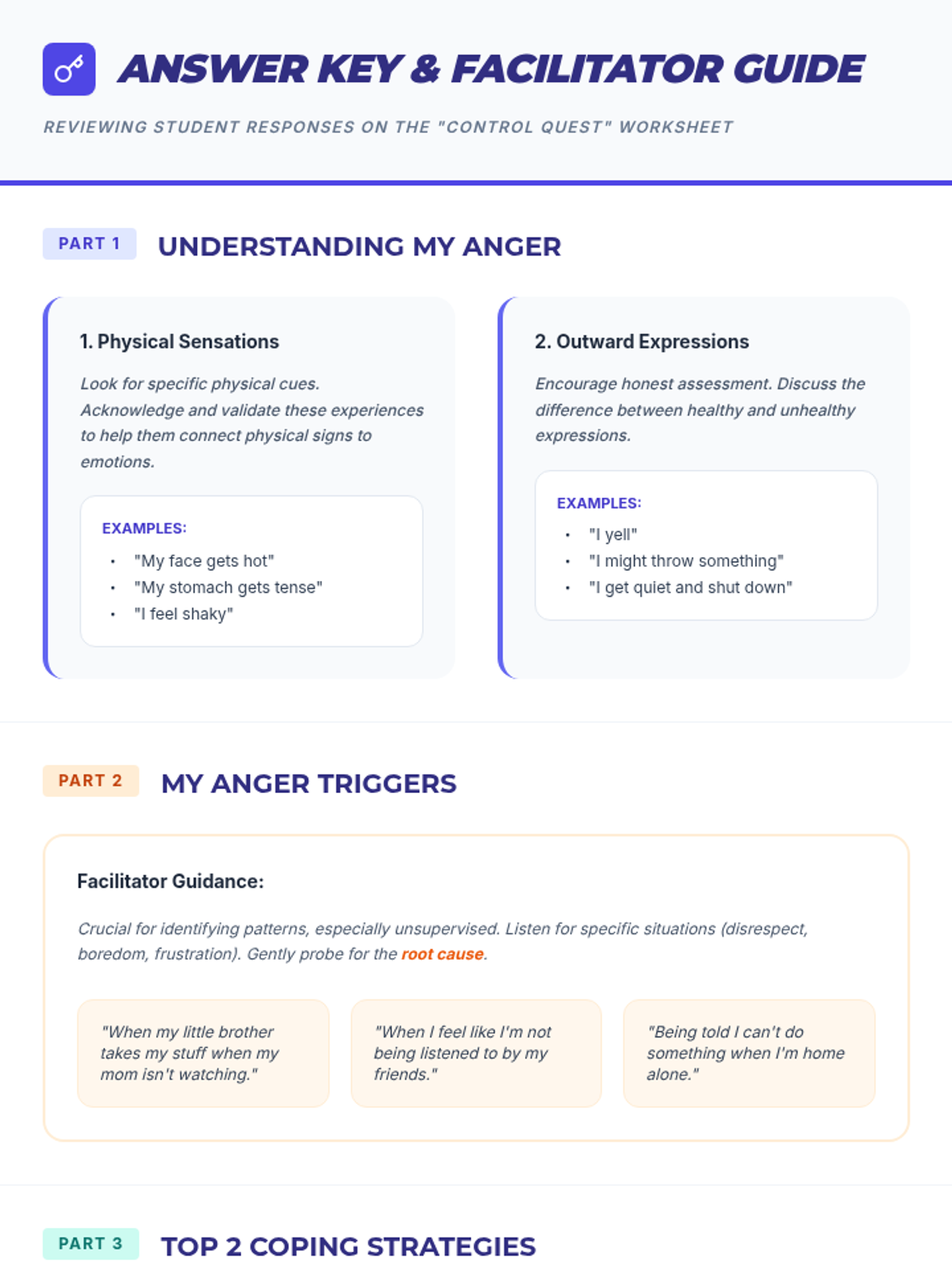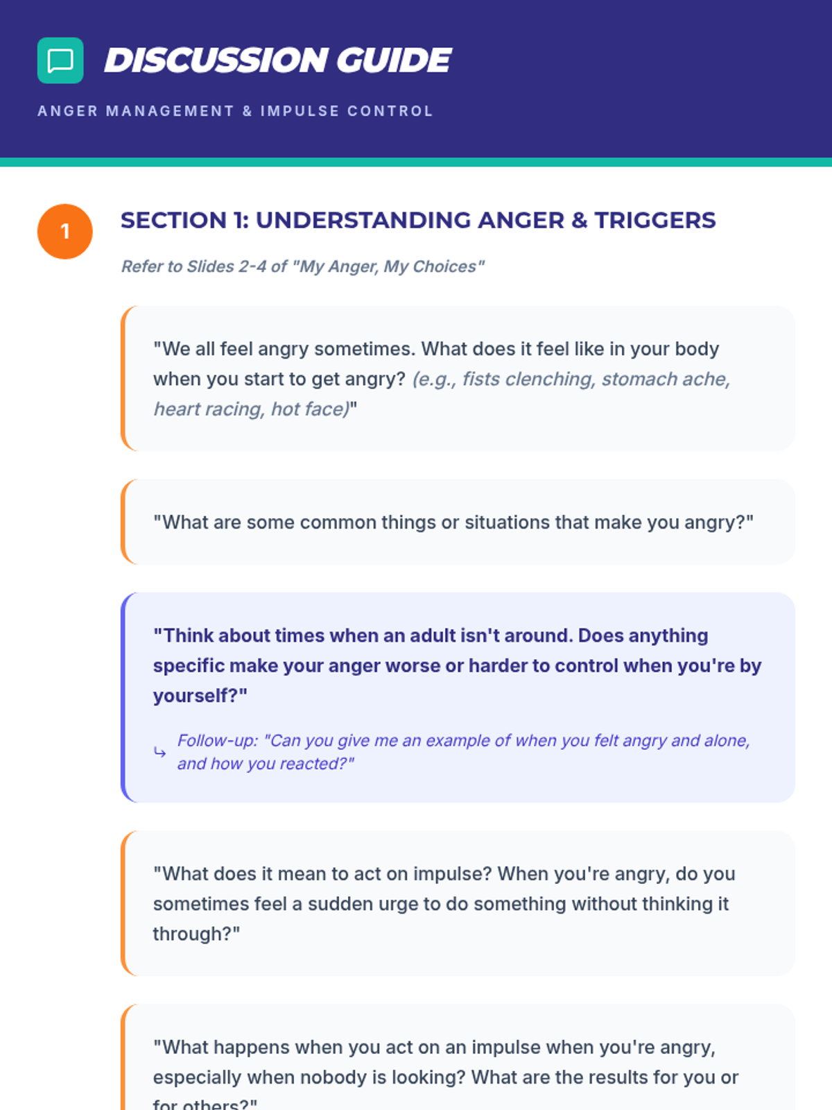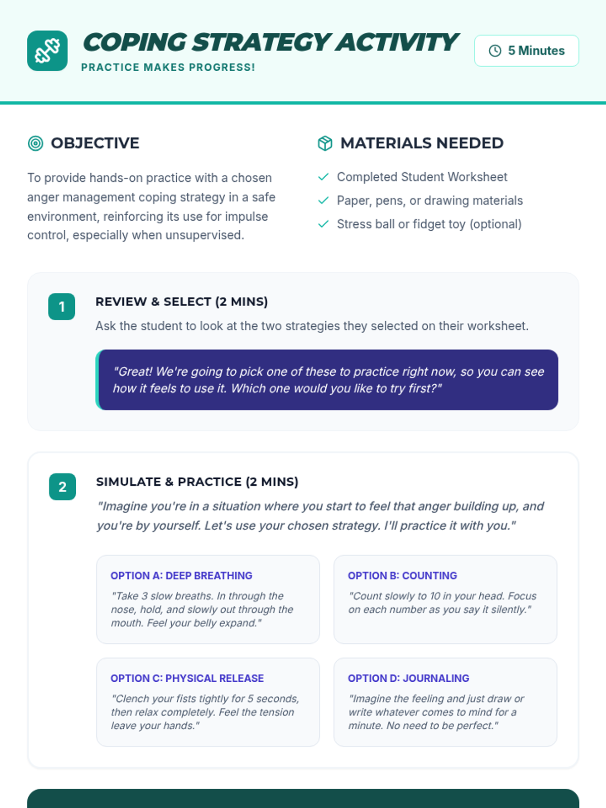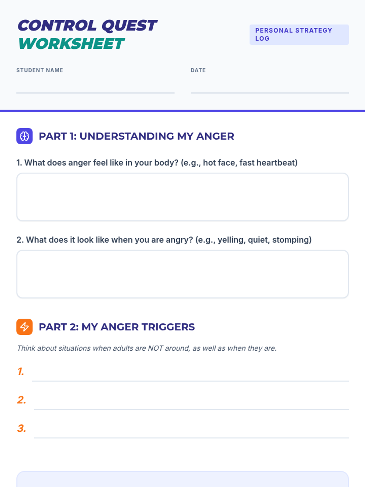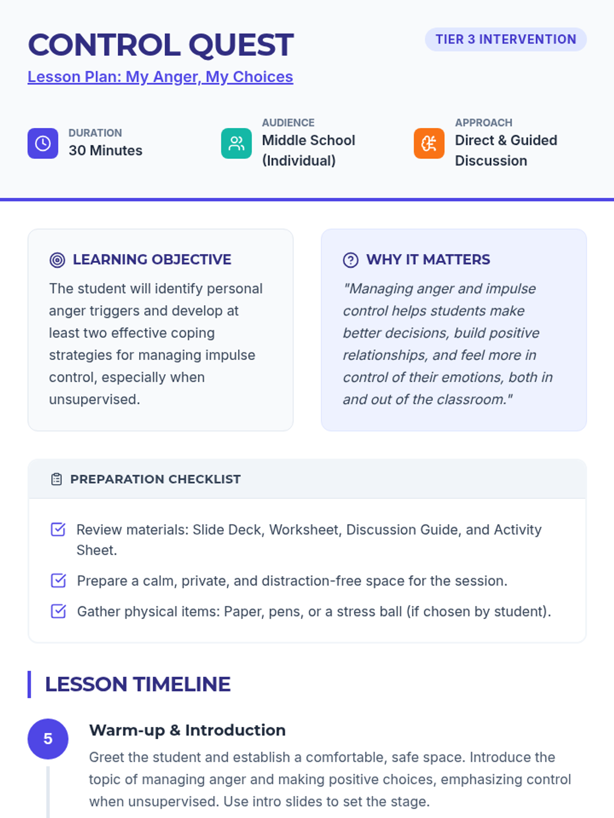 This individual Tier 3 lesson helps middle school students with ERI classifications understand and manage anger and impulse control through trigger identification and coping strategy practice.