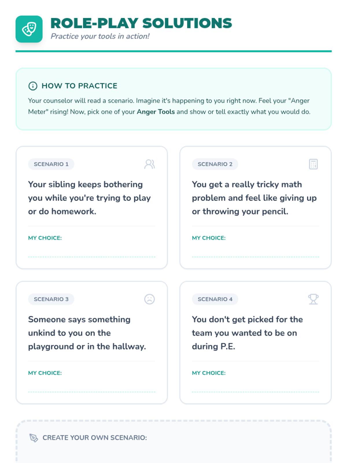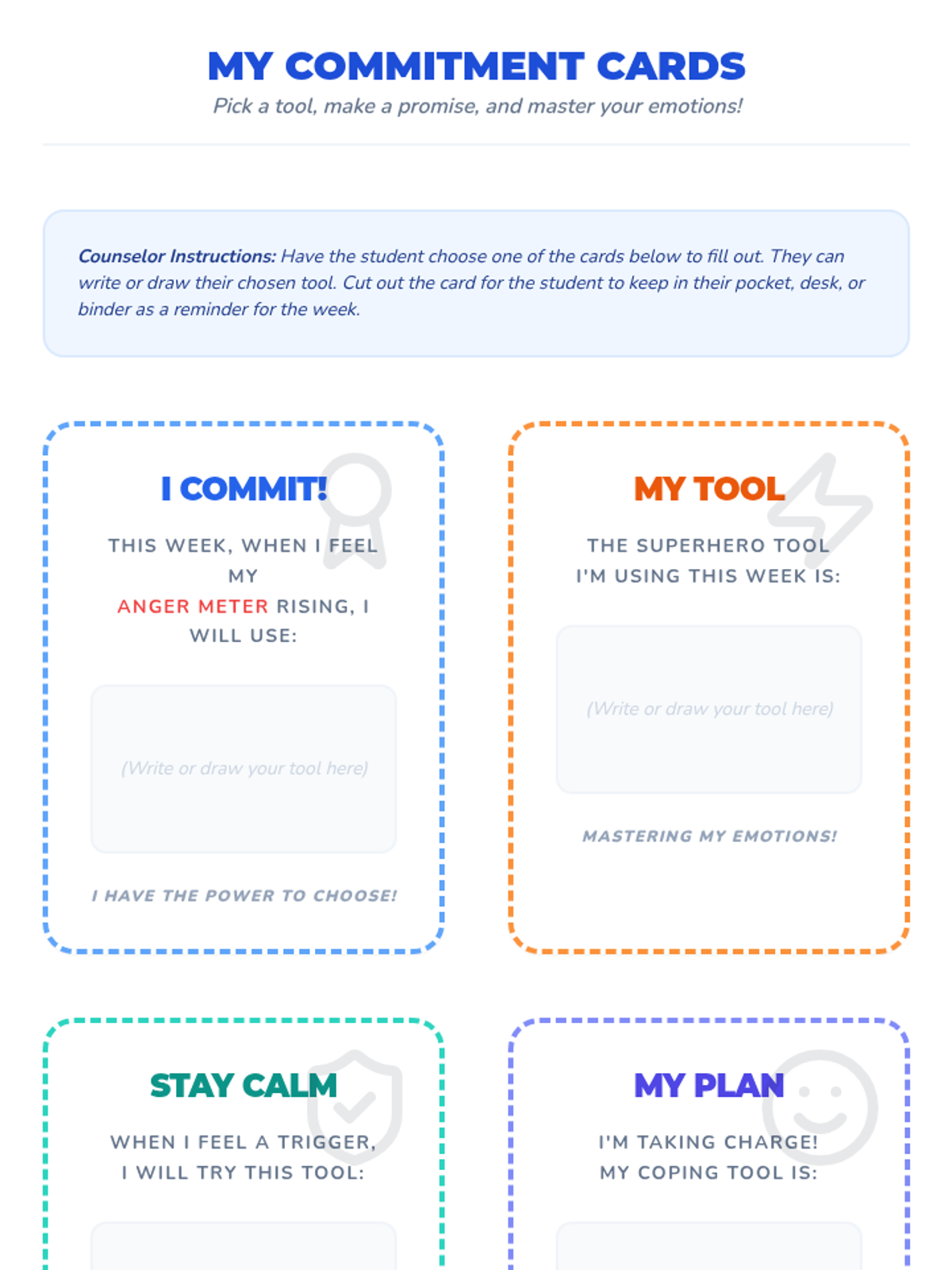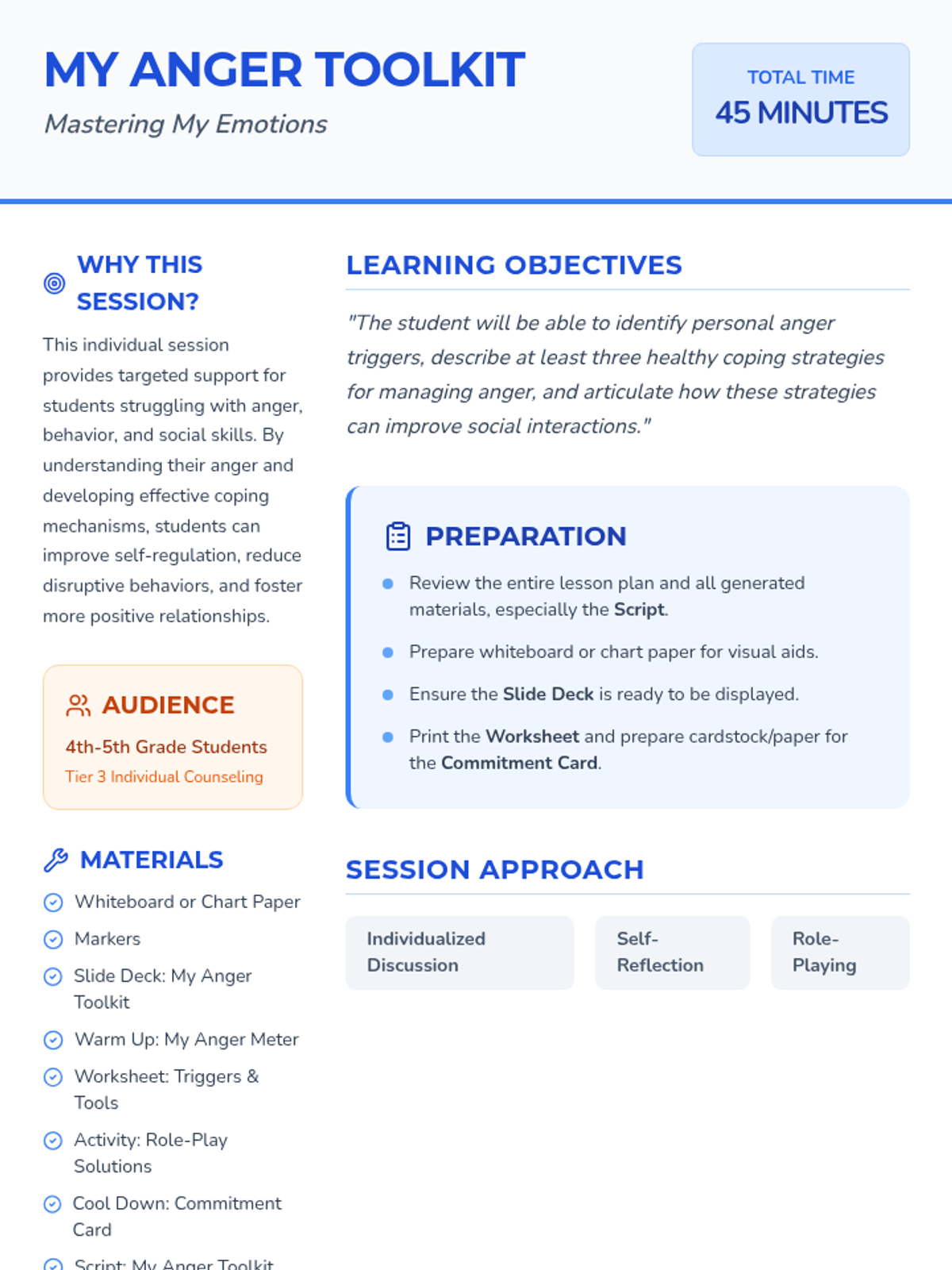 An individual counseling session for 4th-5th graders to identify anger triggers and build a personalized toolkit of coping strategies.