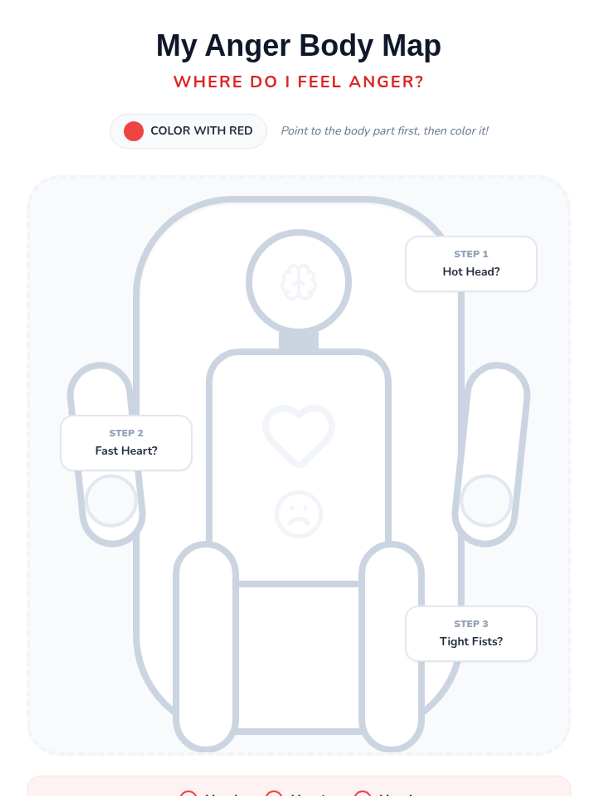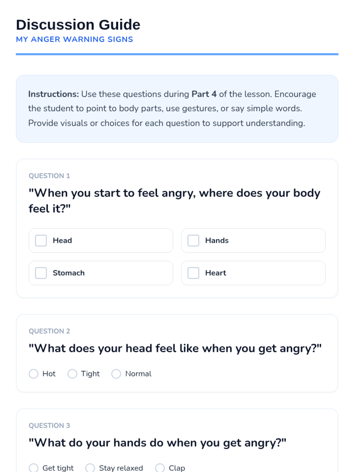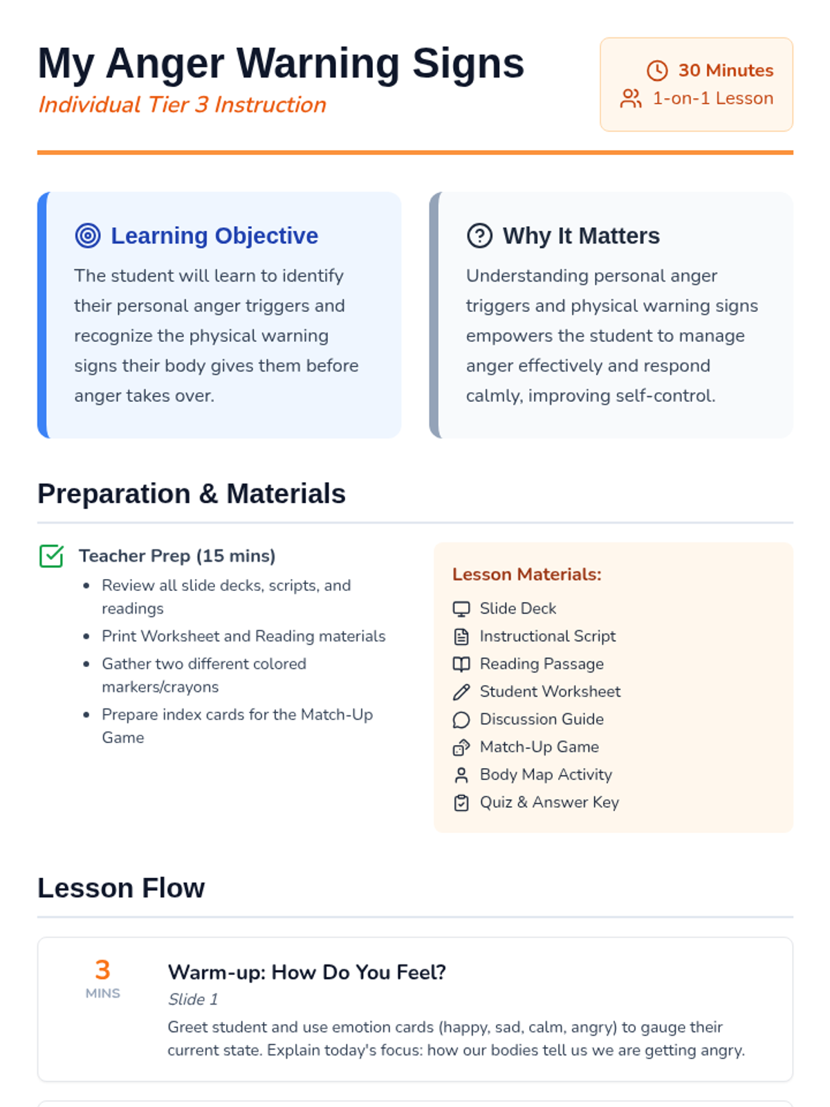 A Tier 3 individual lesson for an adult student with intellectual disabilities to identify personal anger triggers and physical warning signs using simplified, concrete concepts and visual supports.
