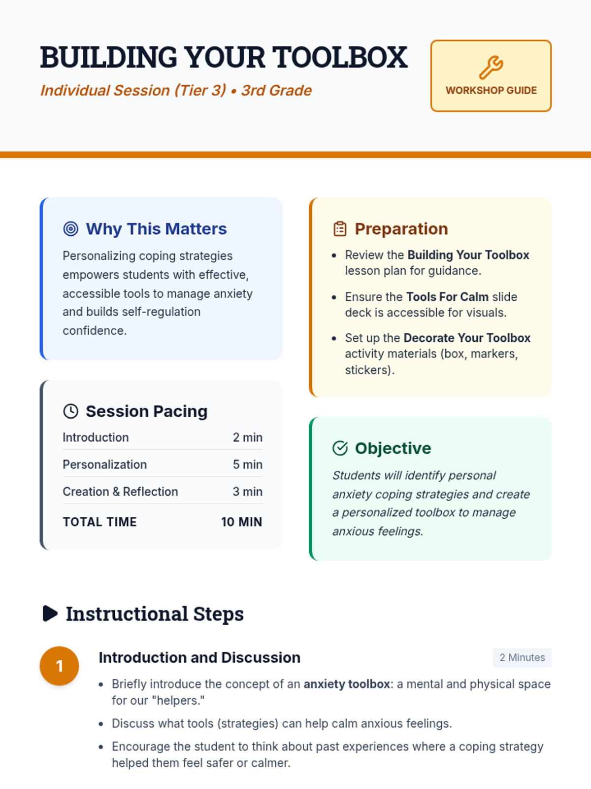 A personalized Tier 3 session helping a student identify anxiety triggers and curate a set of effective coping strategies, culminating in a physical or symbolic 'toolbox' of calm.