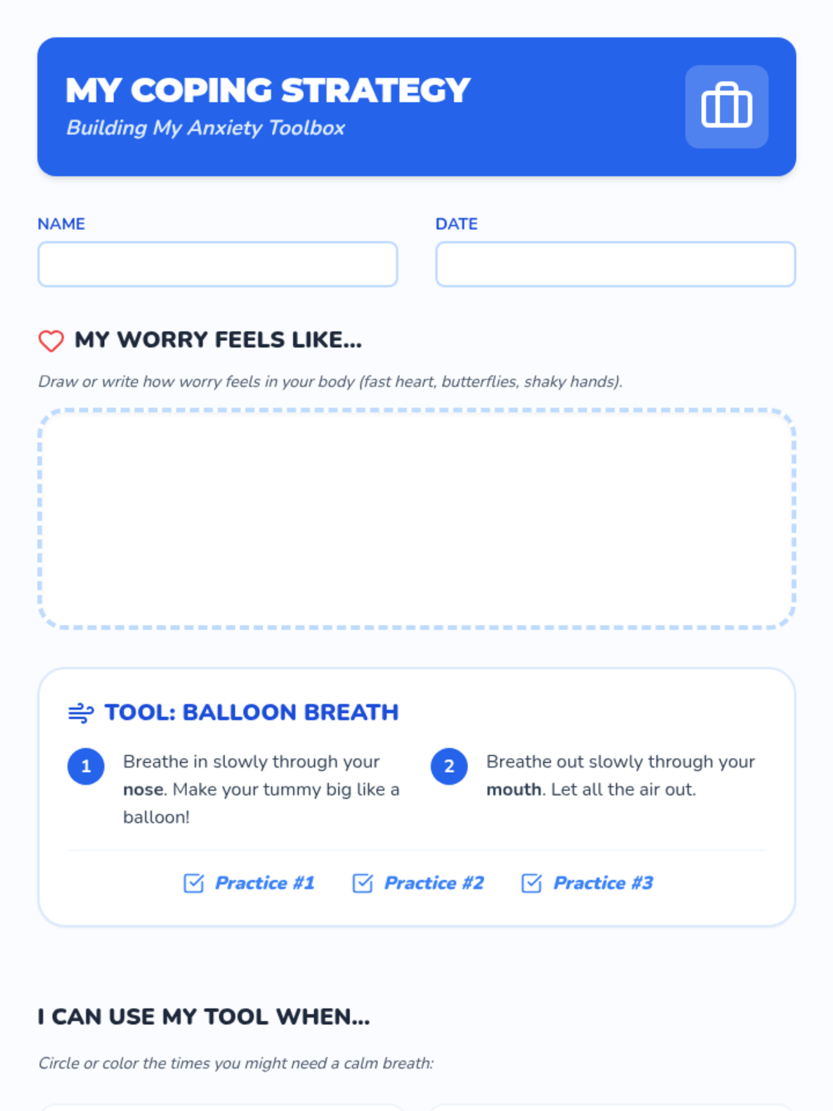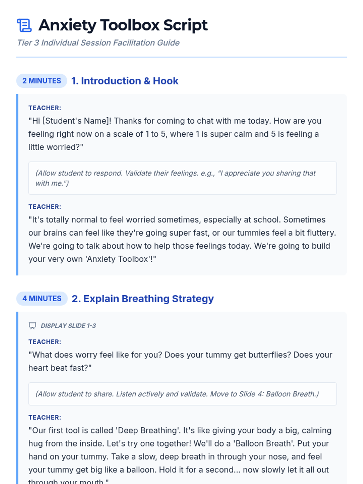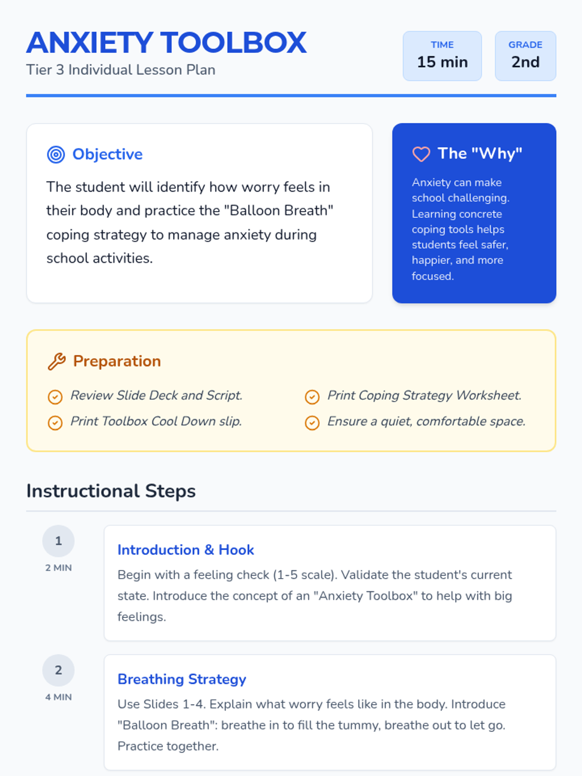 A 15-minute Tier 3 individual lesson for 2nd-grade students focused on identifying worry and practicing deep breathing as a coping strategy.